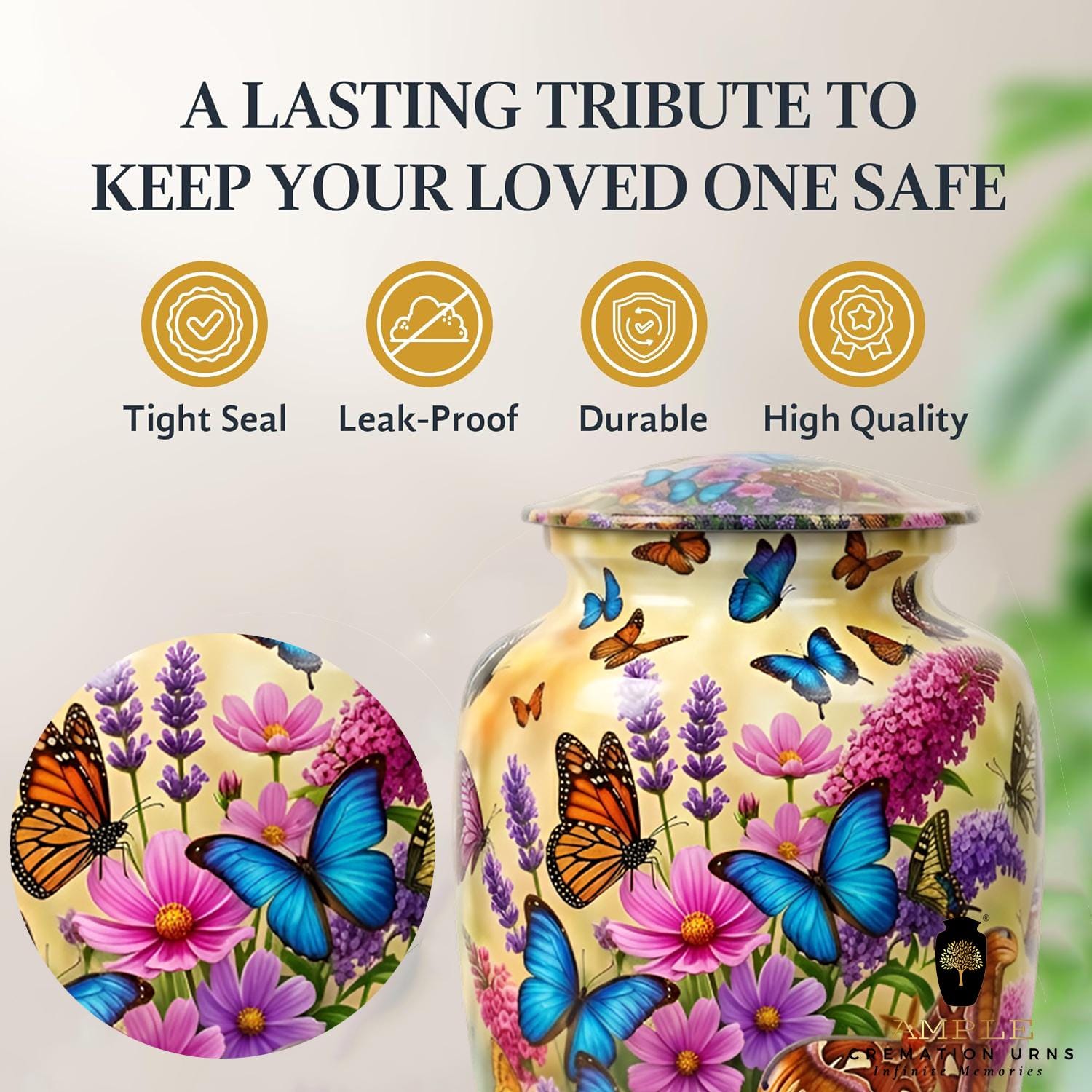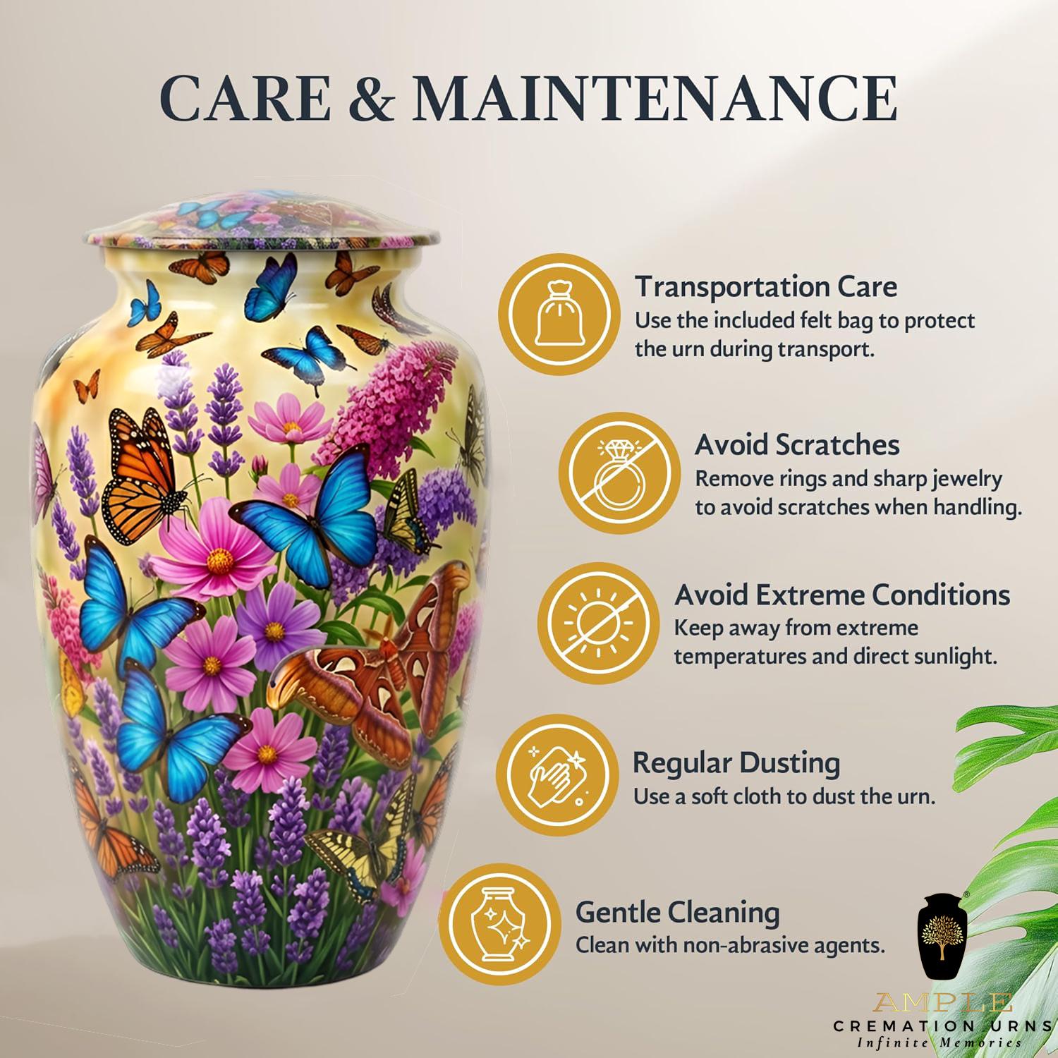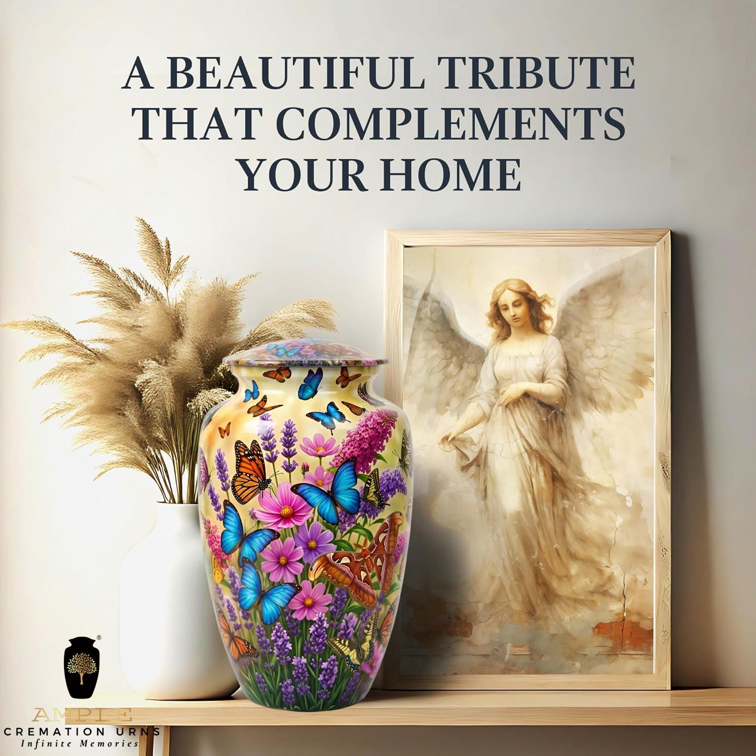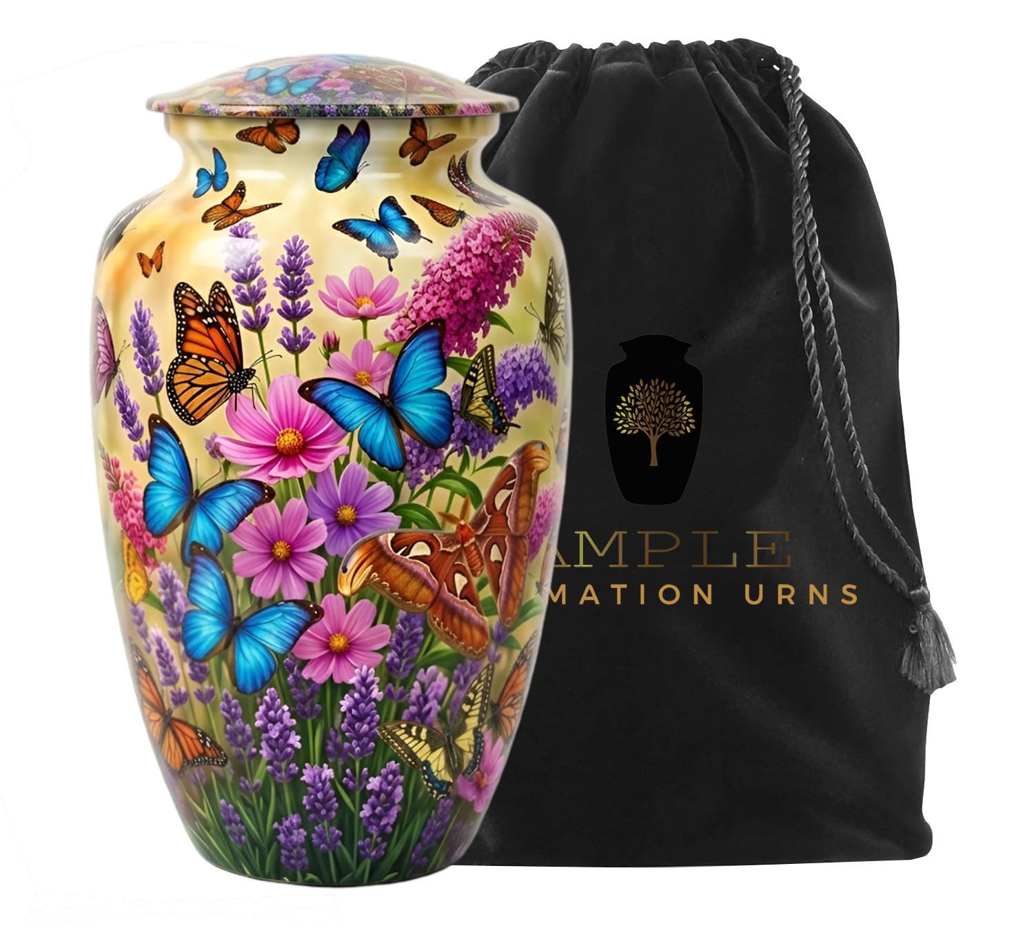 This vibrant urn features a lush garden of purple lavender and pink wildflowers, teeming with a variety of colorful butterflies in mid-flight. The intricate, high-definition imagery symbolizes hope, renewal, and the delicate beauty of a soul in transition. This set includes matching miniature keepsakes, specifically designed to allow multiple family members to find comfort in this blooming garden tribute by keeping a small token of remembrance close at hand.