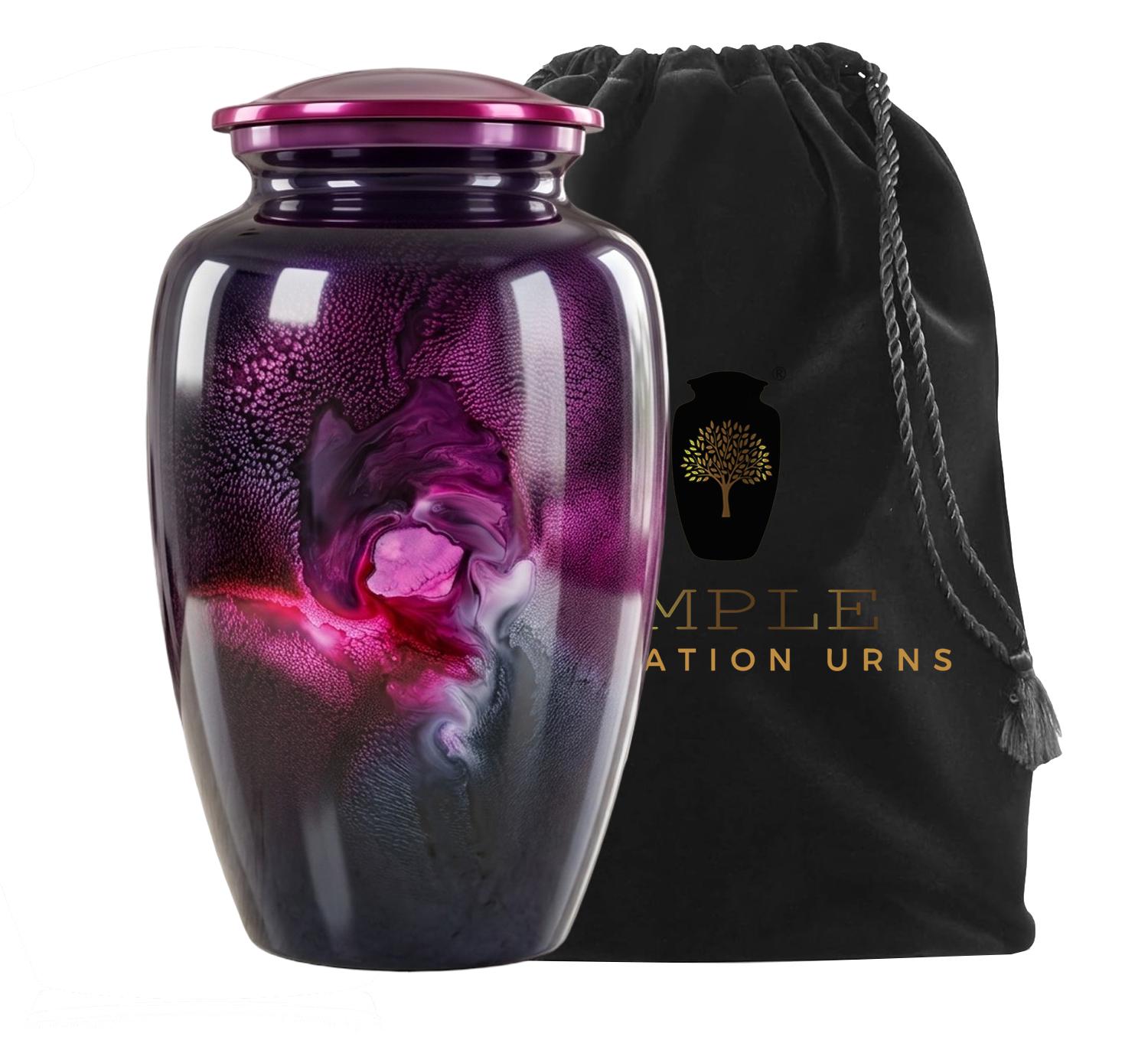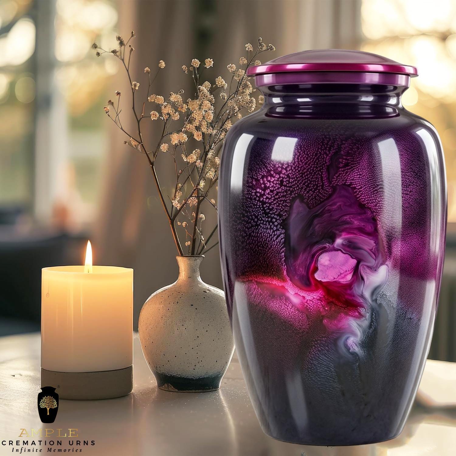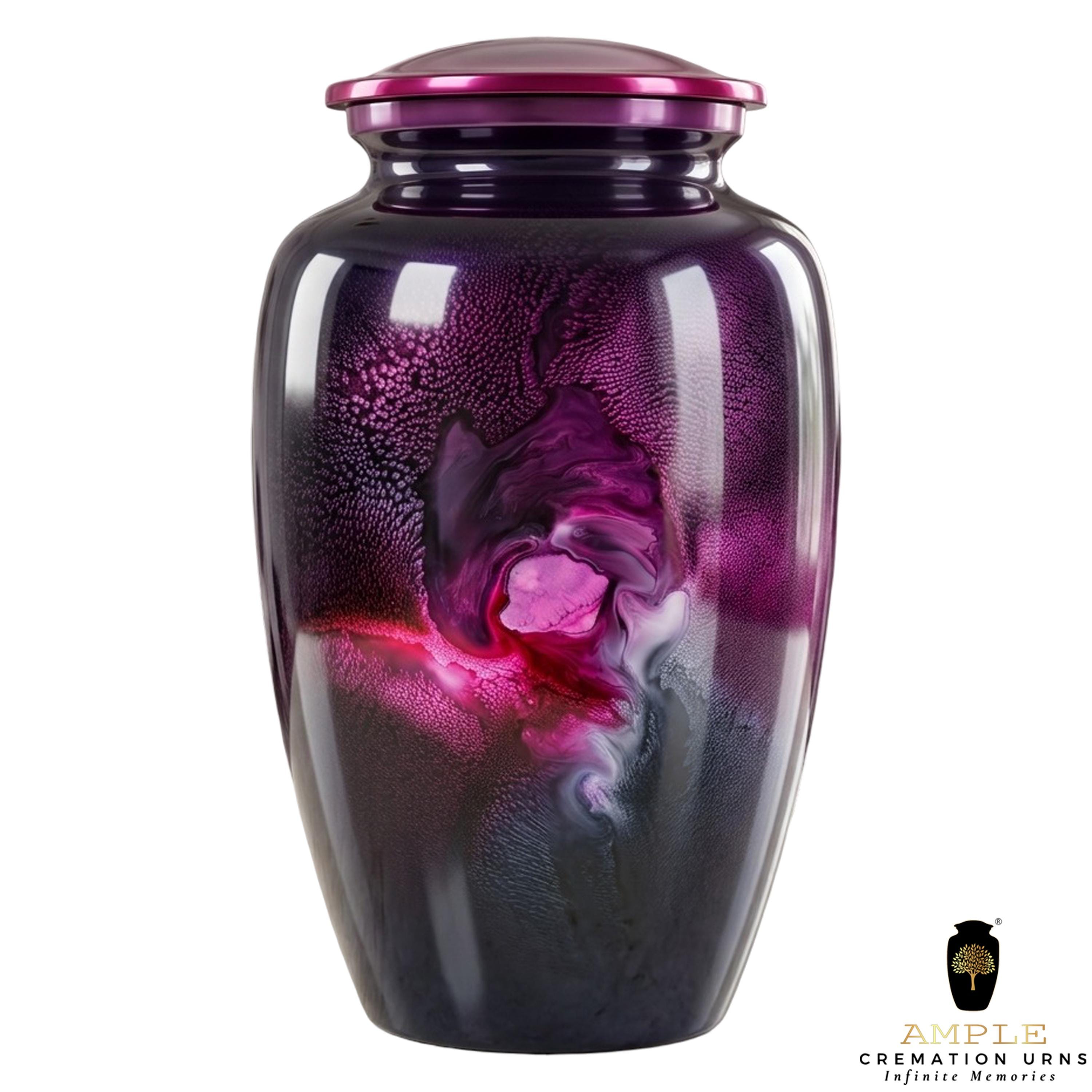 This contemporary urn features a stunning abstract design evocative of deep-space nebulas, with swirling textures in rich amethyst purple, magenta, and charcoal grey. The fluid, organic patterns symbolize the boundless energy of a soul and the ethereal beauty of the cosmos. This set includes matching miniature keepsakes, specifically designed to allow multiple family members to find comfort in this modern celestial tribute by keeping a small token of remembrance close at hand.