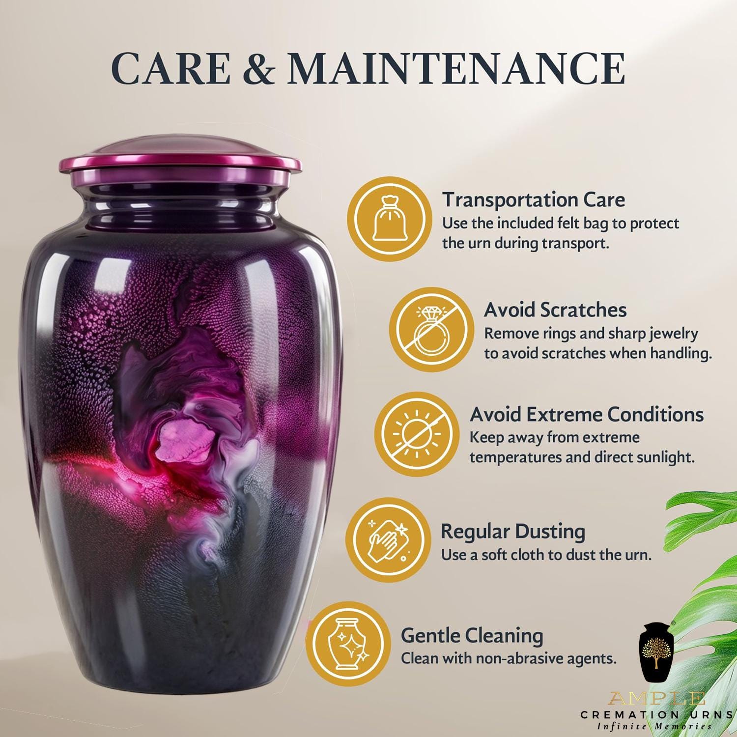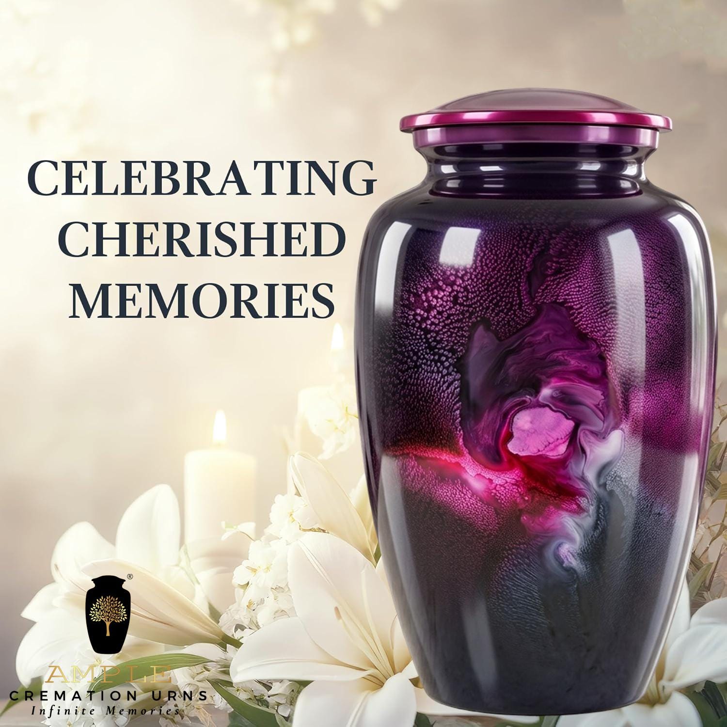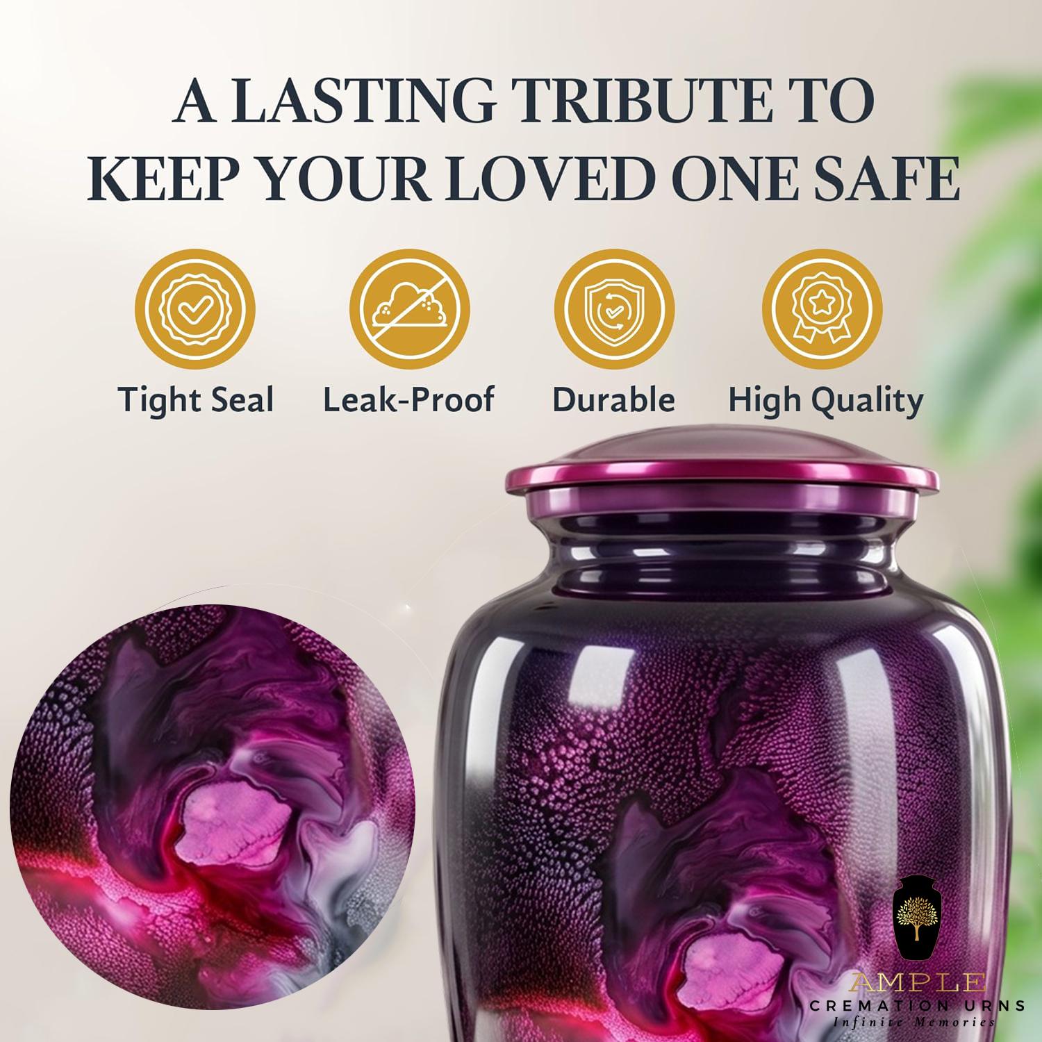 This contemporary urn features a stunning abstract design evocative of deep-space nebulas, with swirling textures in rich amethyst purple, magenta, and charcoal grey. The fluid, organic patterns symbolize the boundless energy of a soul and the ethereal beauty of the cosmos. This set includes matching miniature keepsakes, specifically designed to allow multiple family members to find comfort in this modern celestial tribute by keeping a small token of remembrance close at hand.