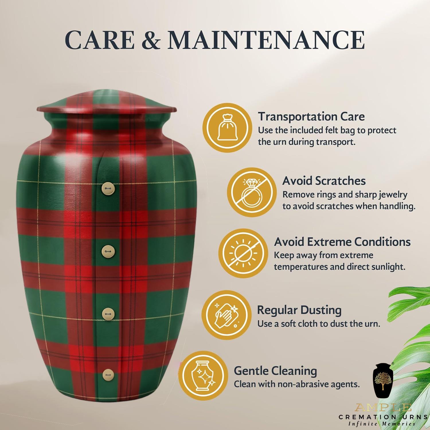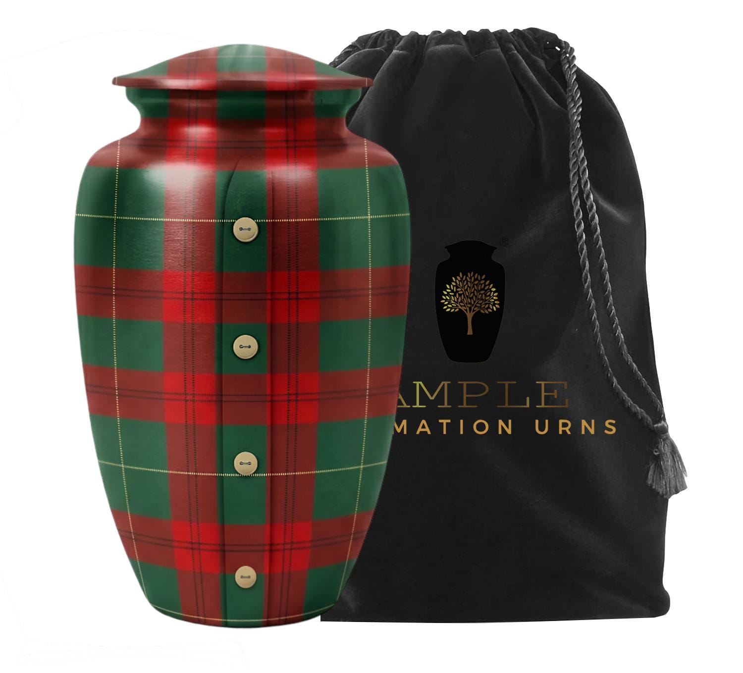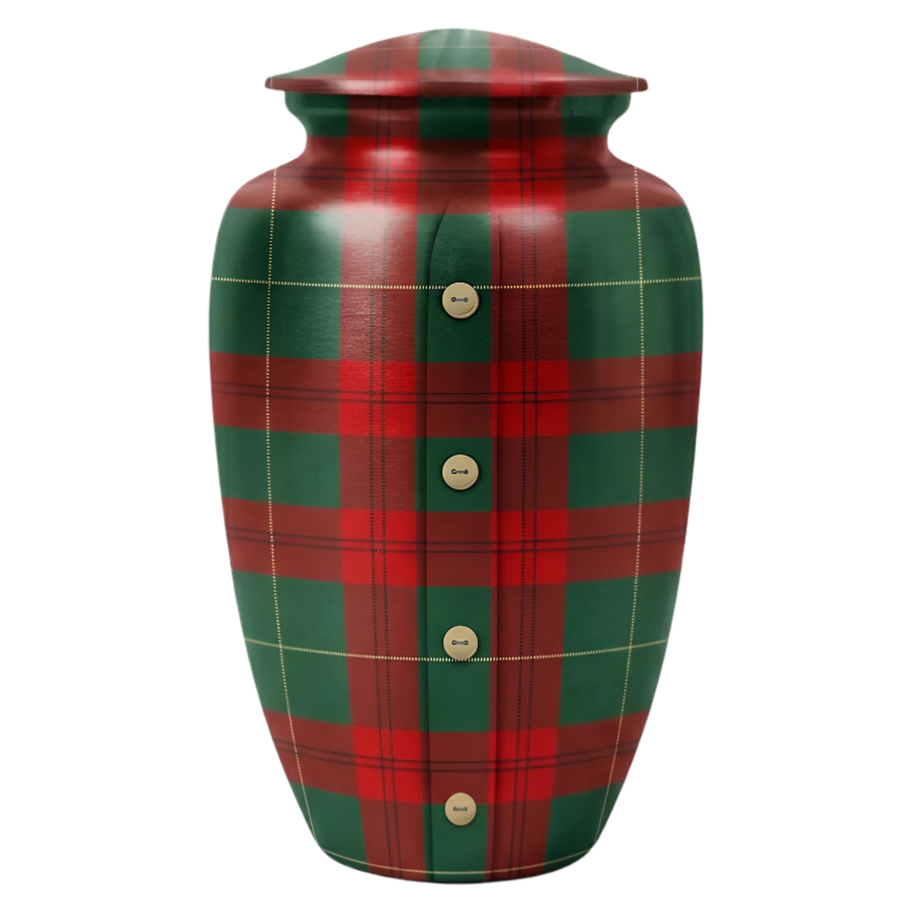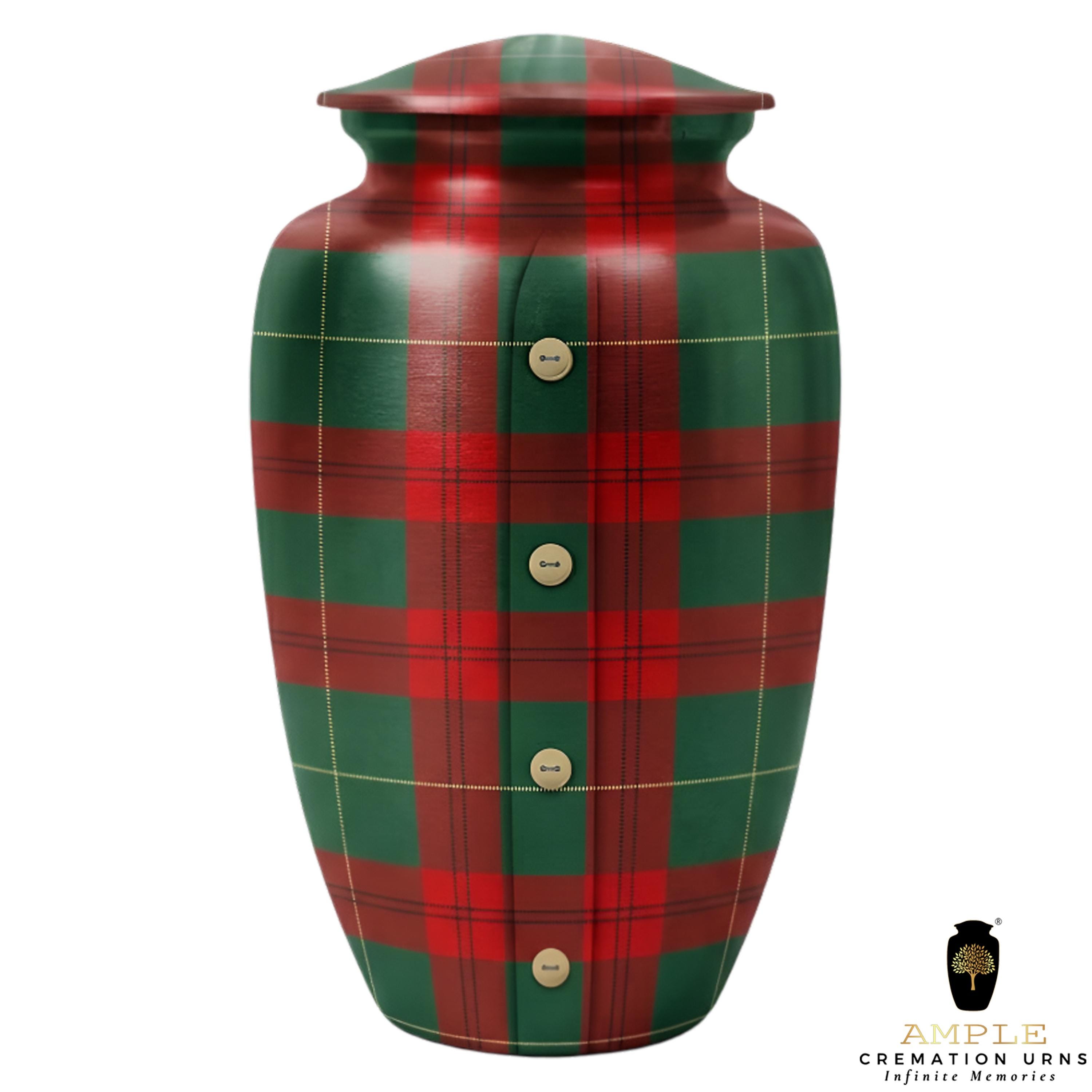 This unique urn features a timeless red and green tartan plaid pattern, complete with a charming vertical button-down detail that evokes the comfort of a favorite flannel shirt or a family heirloom. The design symbolizes a life of coziness, reliability, and deep-rooted heritage. This set includes matching miniature keepsakes, specifically designed to allow multiple family members to find comfort in this traditional tribute by keeping a small token of remembrance close at hand.