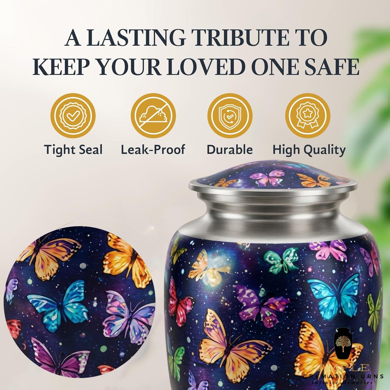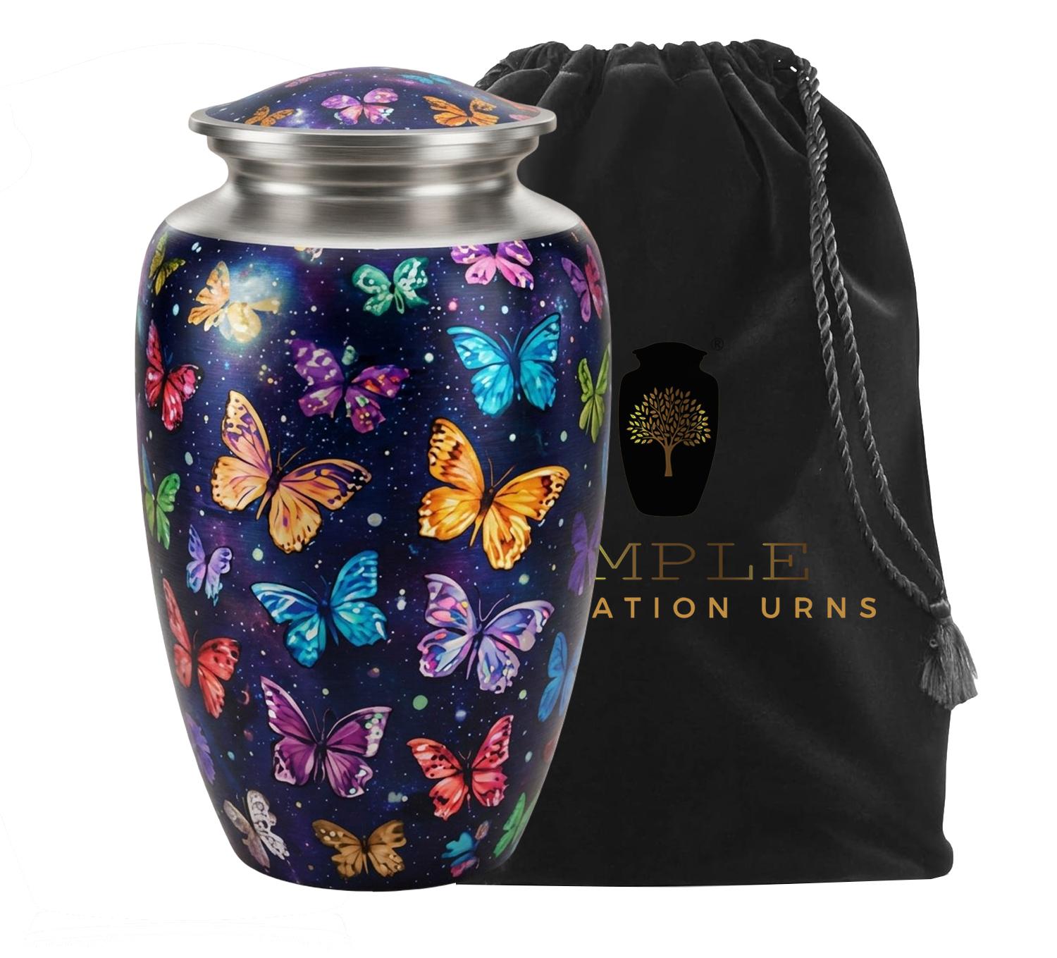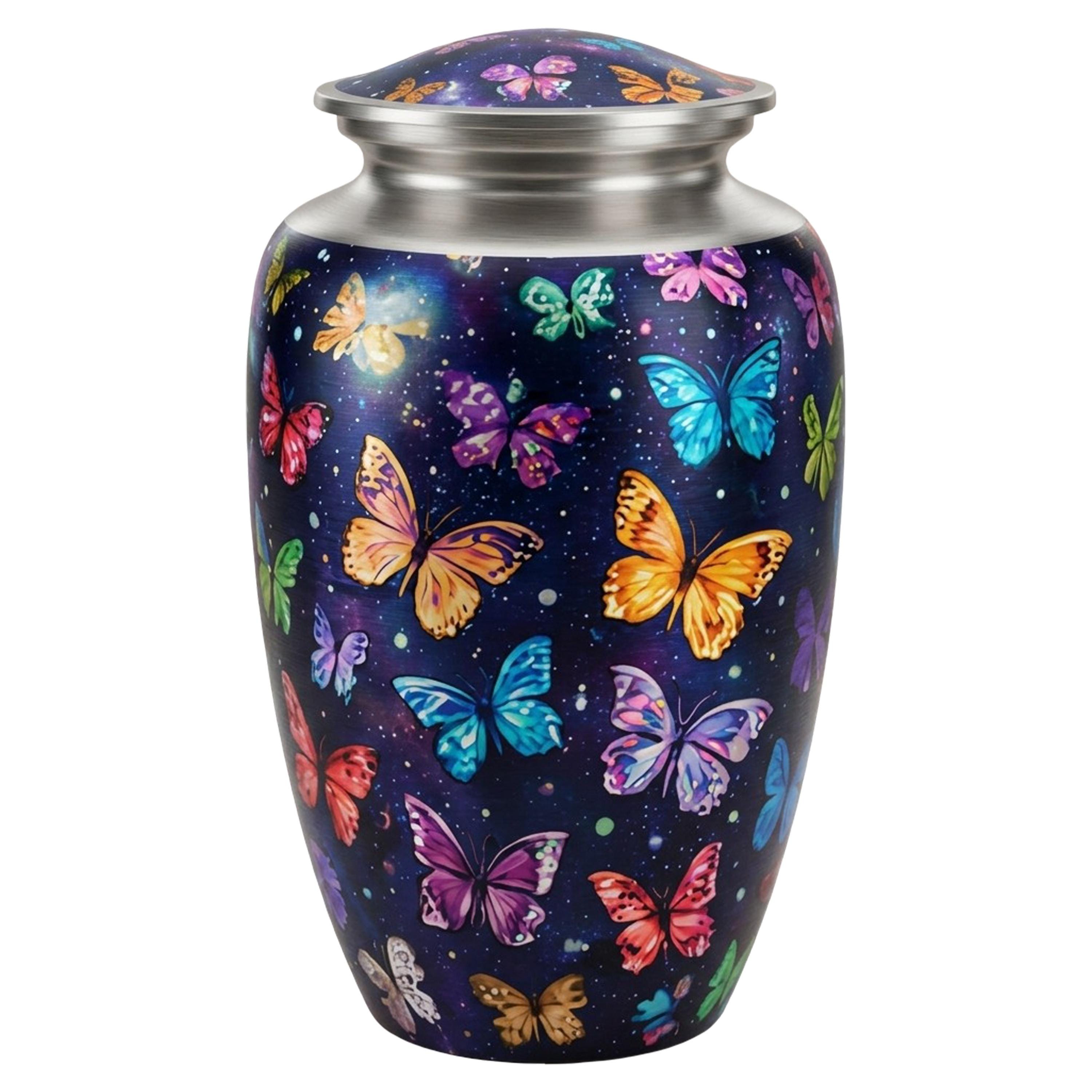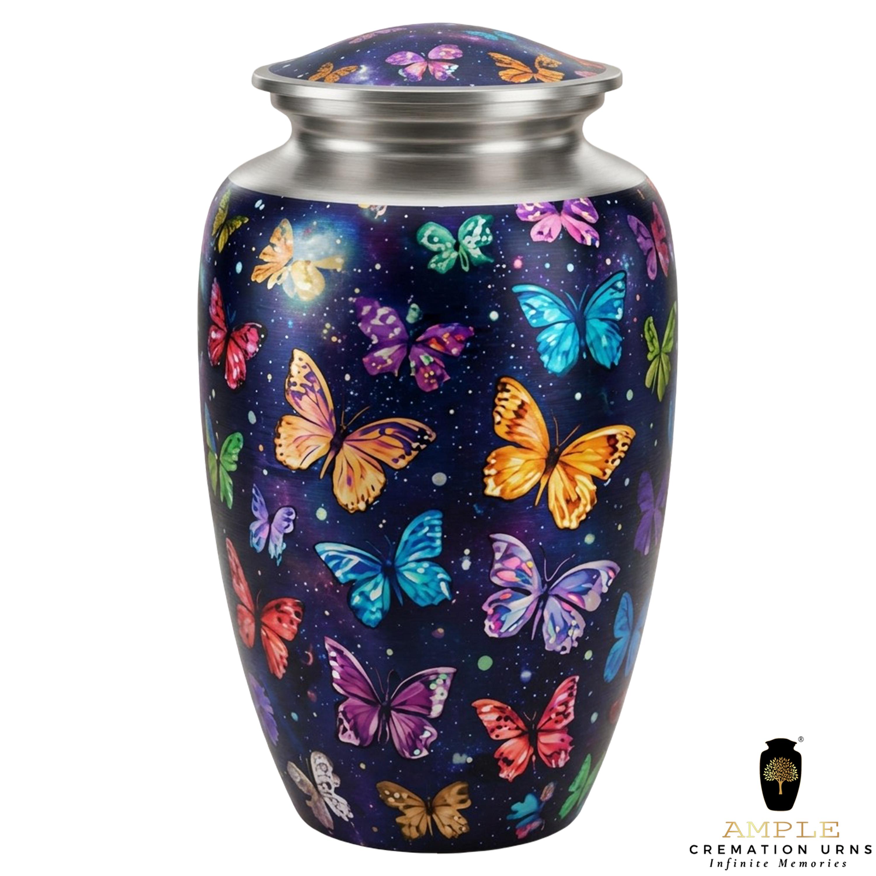 This stunning urn features a dense, high-definition pattern of colorful butterflies in various sizes and hues, fluttering across a deep midnight blue, star-speckled background. The brilliant contrast between the vivid wings and the dark, cosmic sky symbolizes a soul that shines brightly even in the infinite. This set includes matching miniature keepsakes, specifically designed to allow multiple family members to find comfort in this graceful tribute by keeping a small token of remembrance close at hand.