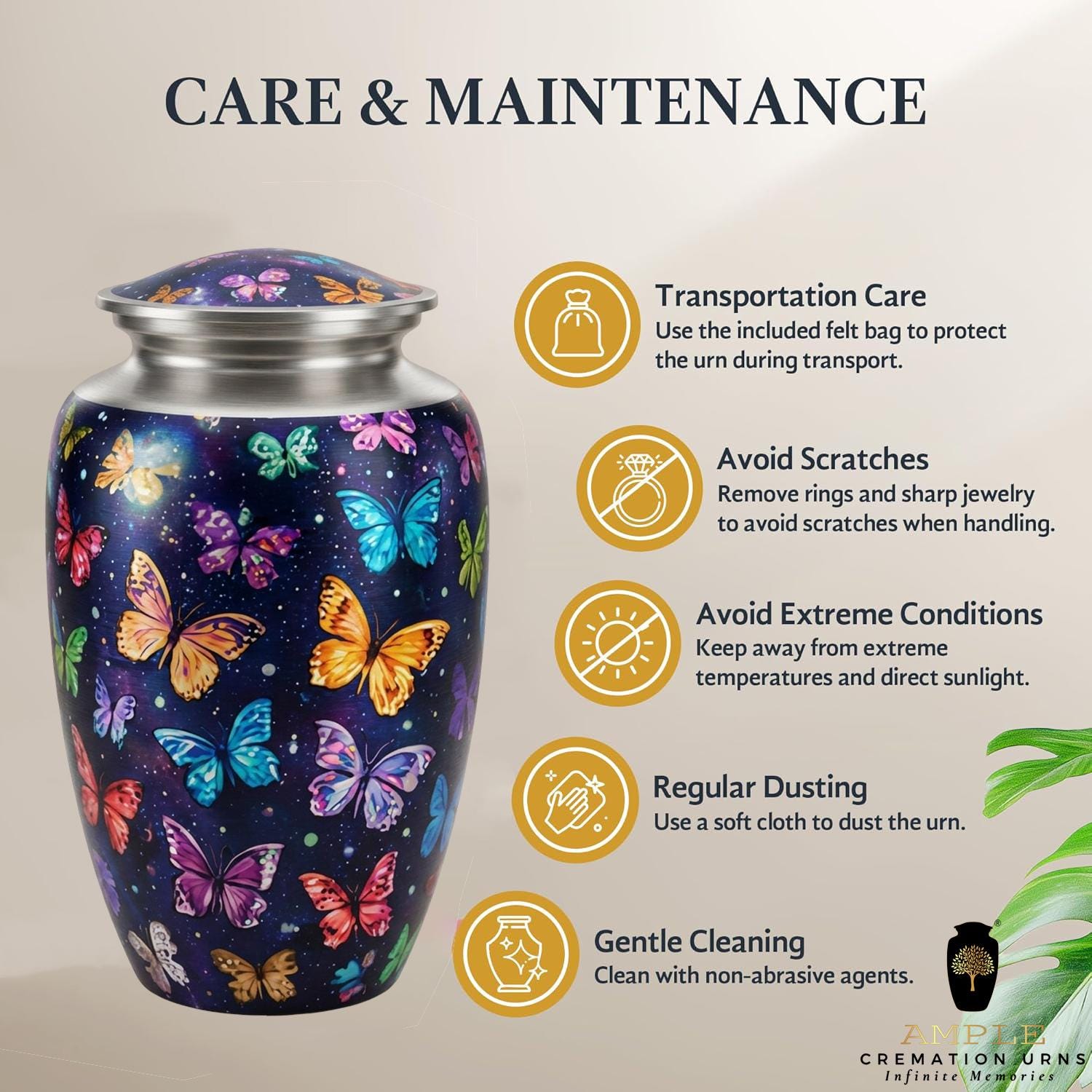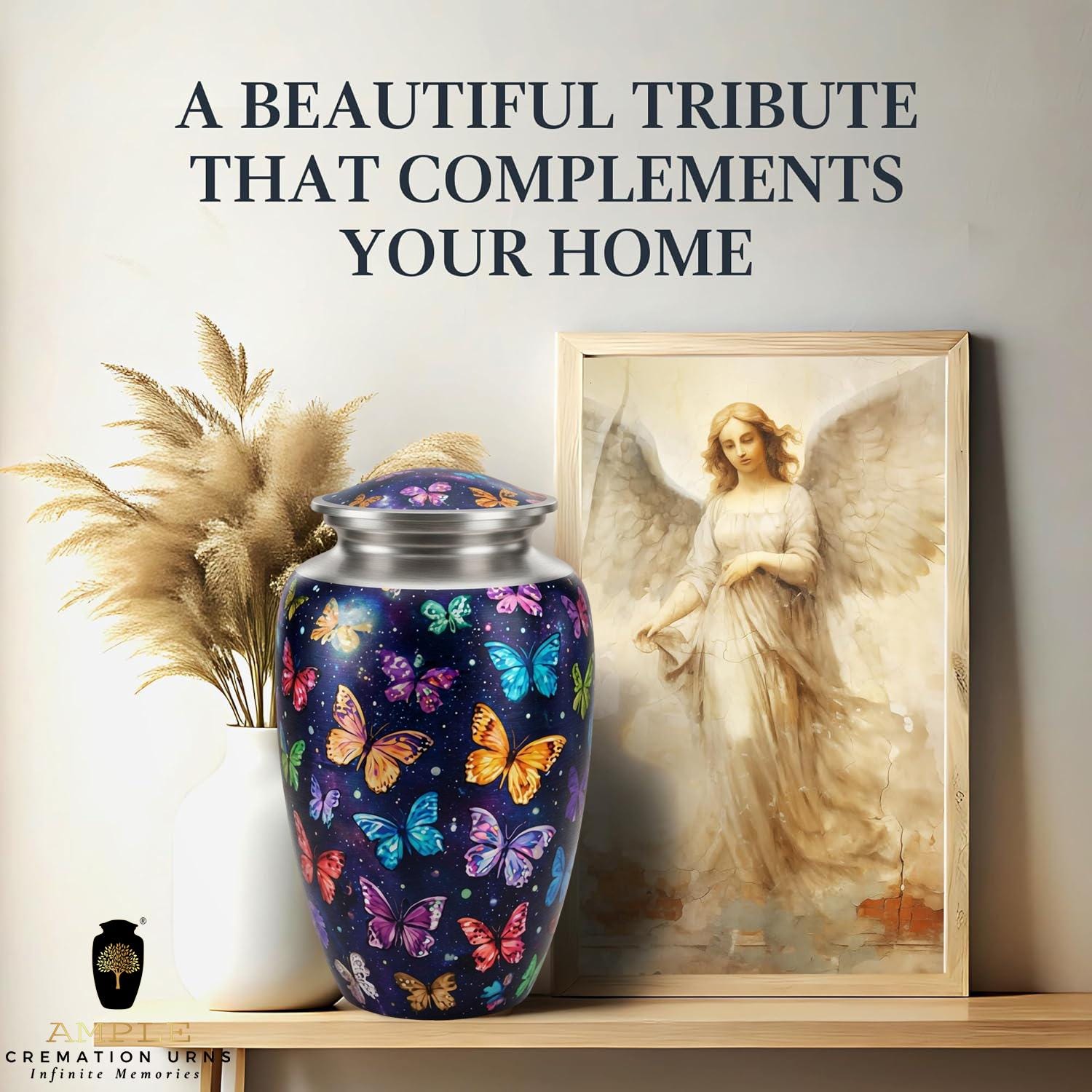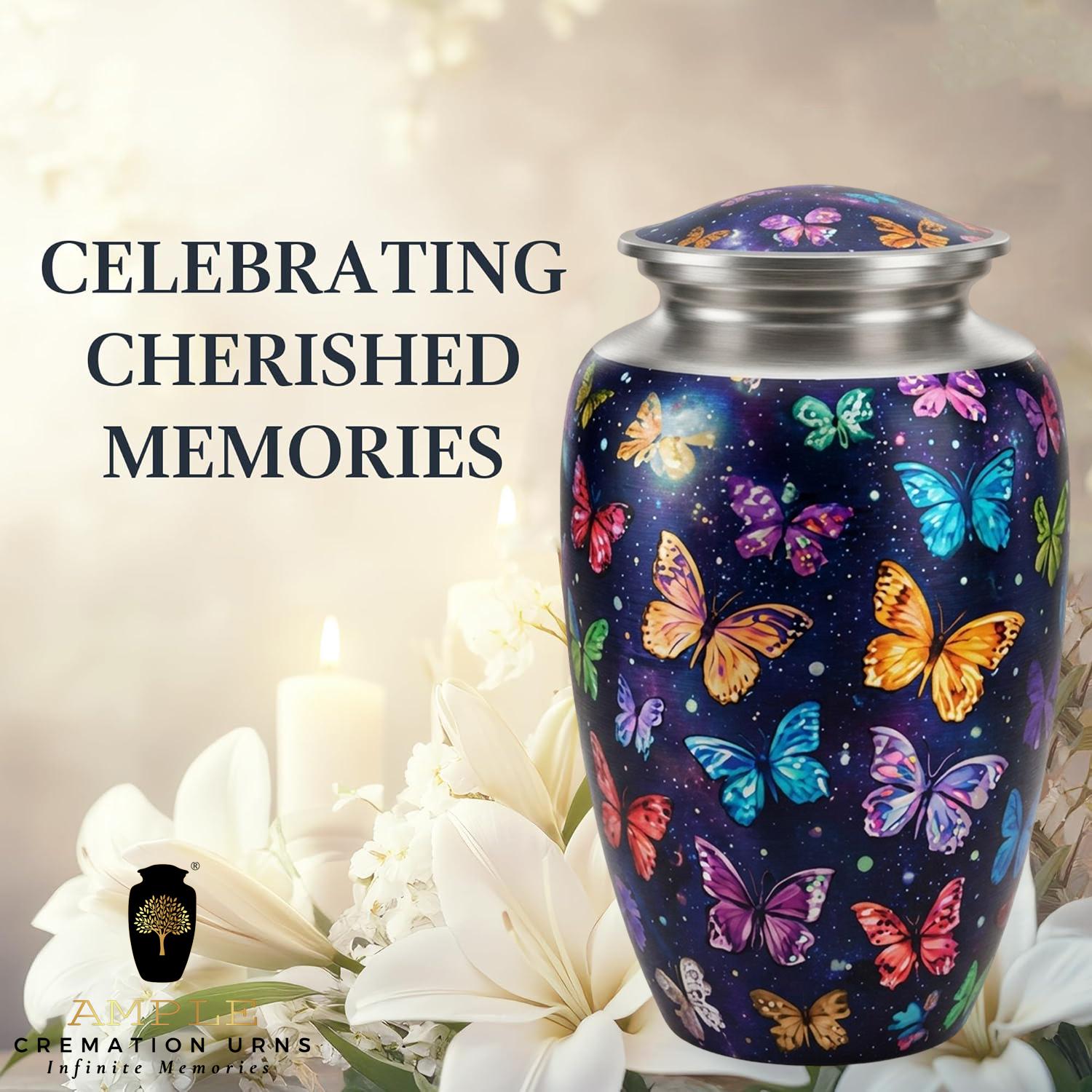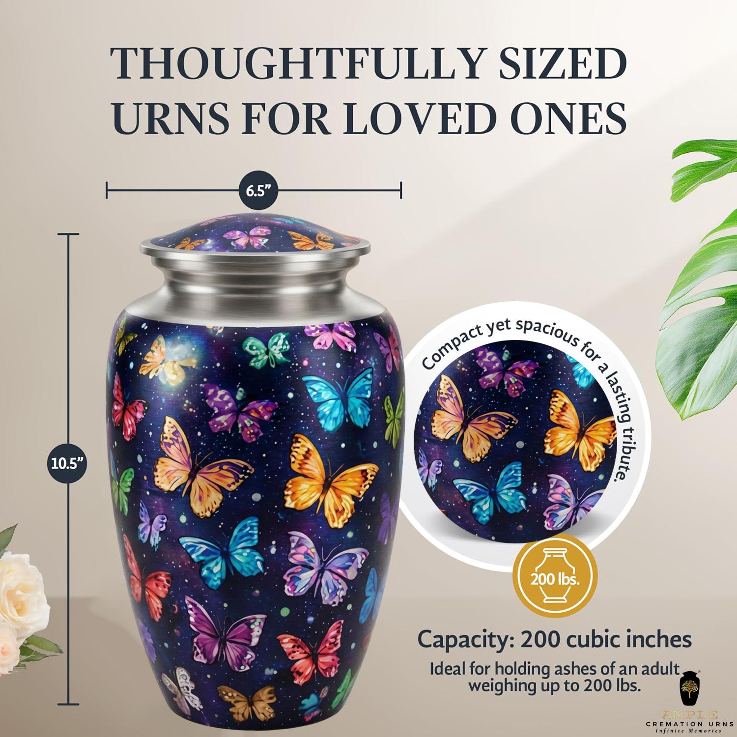 Celebrate a life of transformation and vibrant beauty with the Midnight Butterfly Kaleidoscope Memorial Urn.