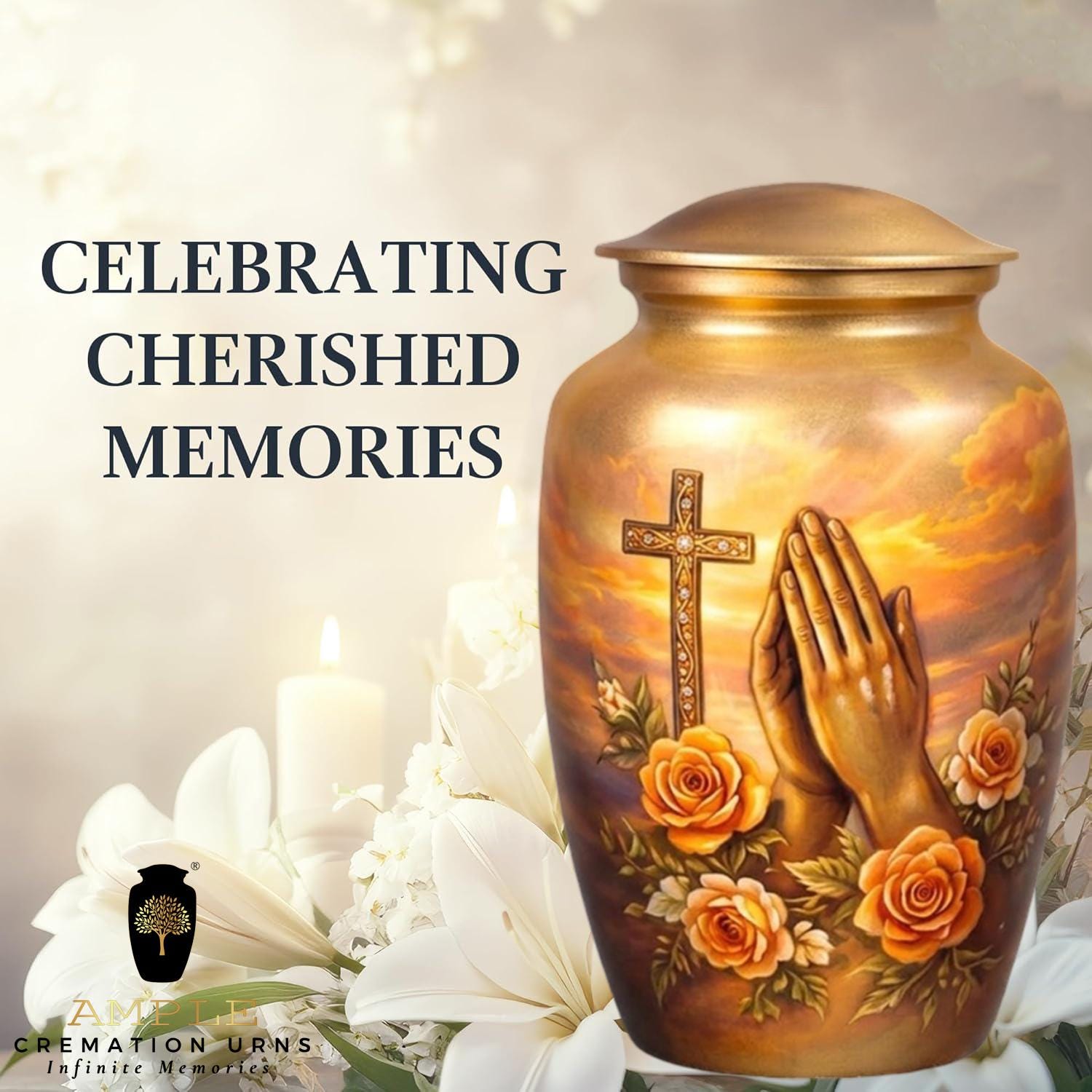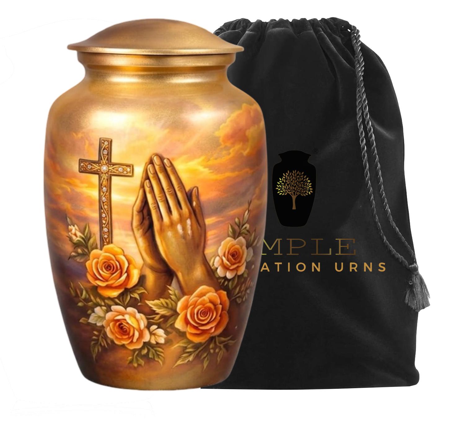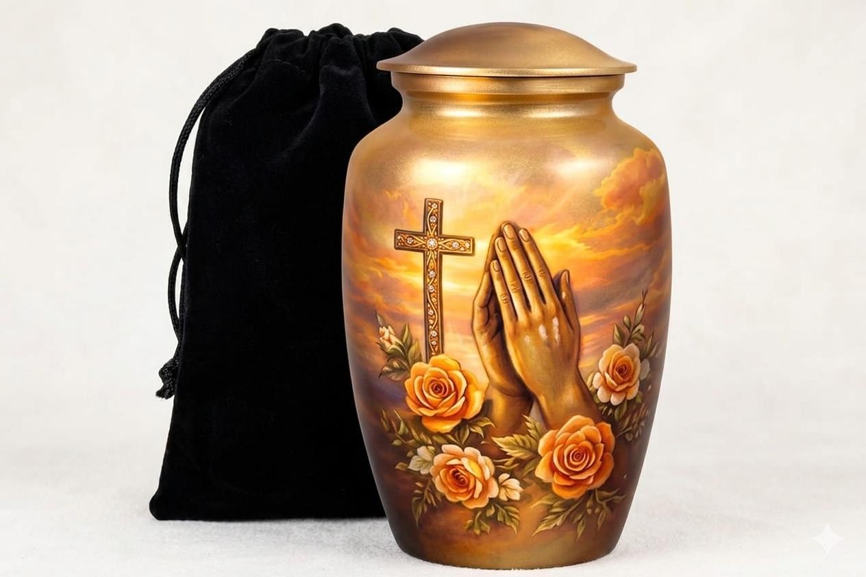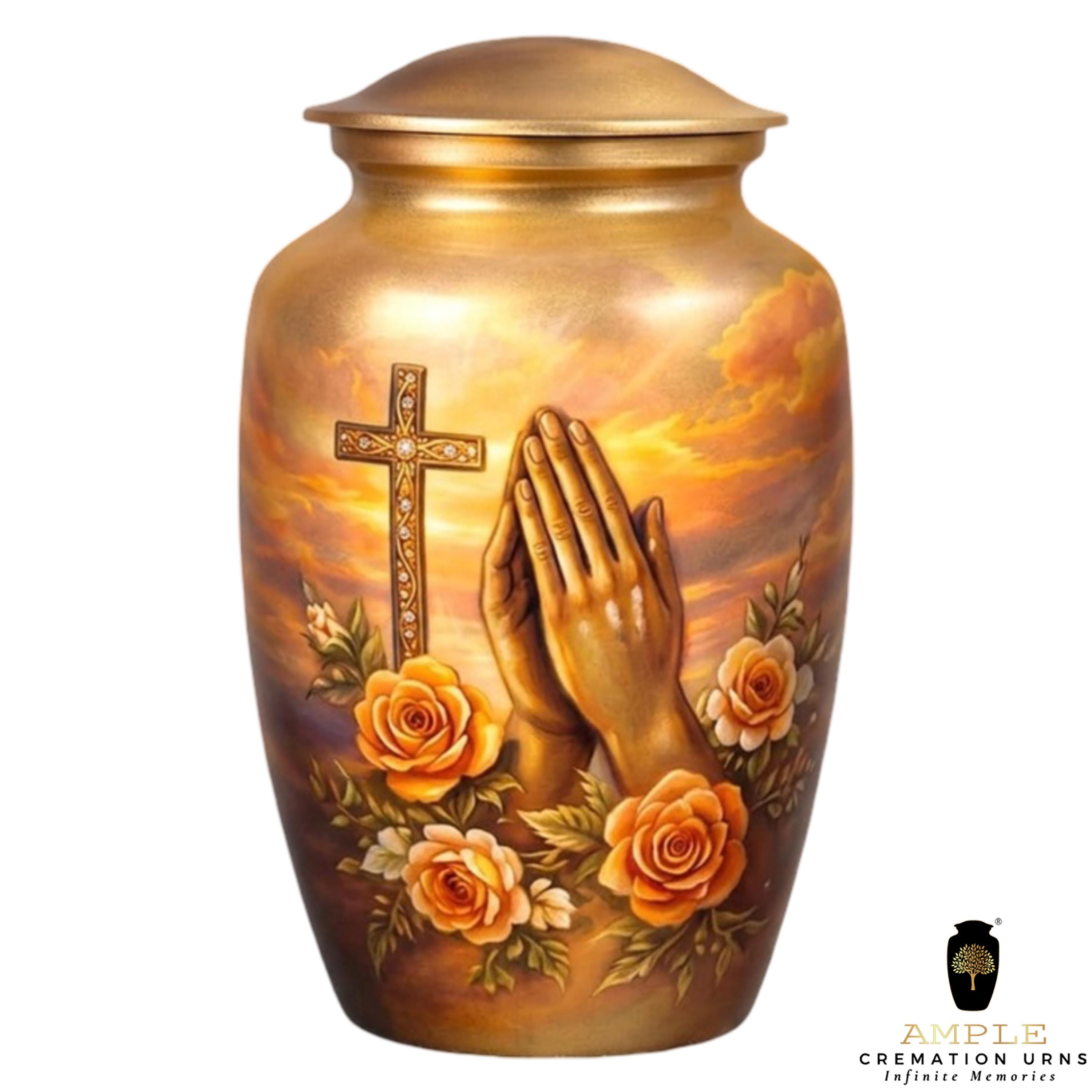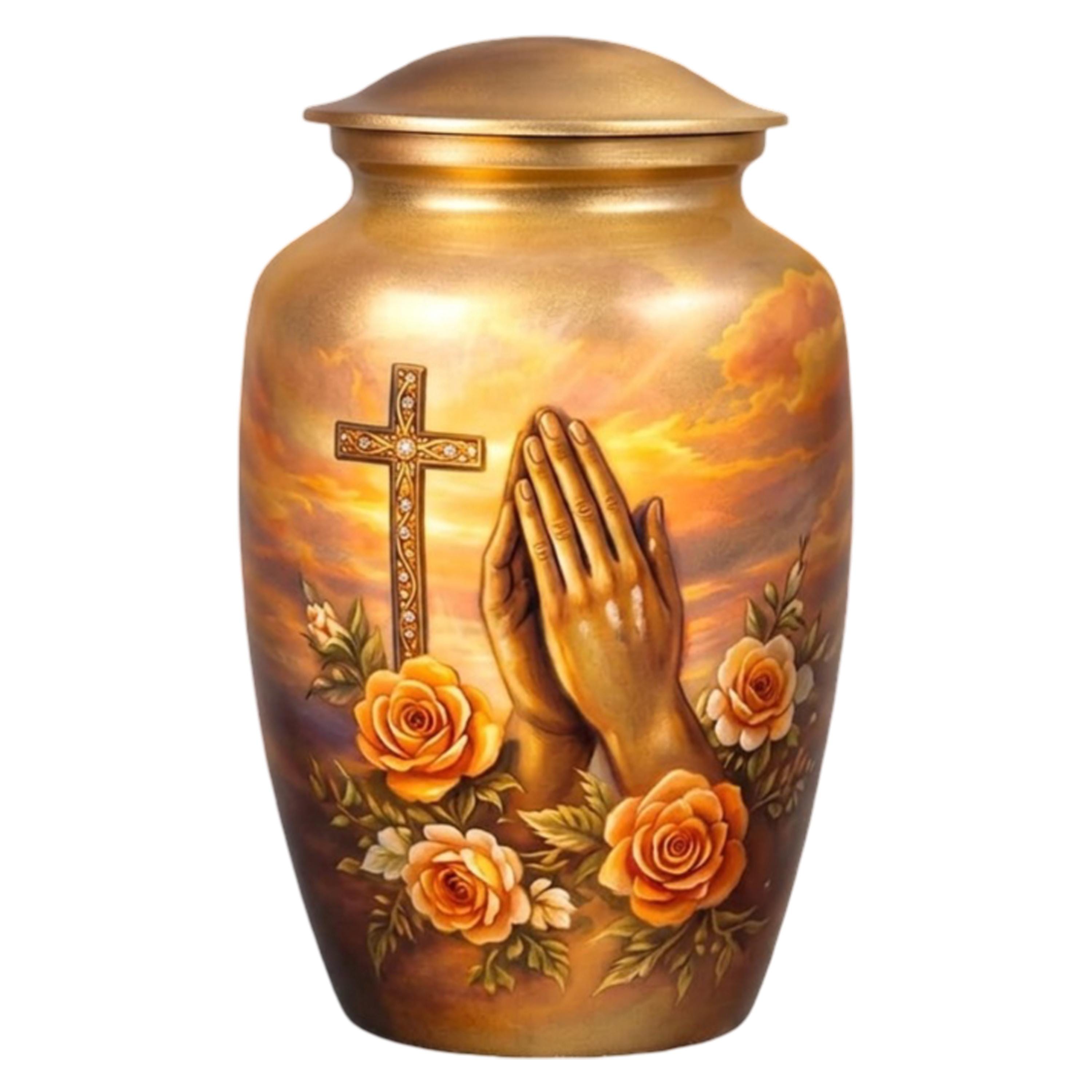 This deeply spiritual memorial features a serene illustration of praying hands set against a radiant, sunset-hued sky. A golden cross, intricately detailed with sparkling accents, stands as a pillar of faith, while a lush arrangement of blooming orange roses symbolizes eternal love and grace. The warm, golden tones of the vessel and the soft clouds create a peaceful atmosphere, offering a dignified final resting place for a loved one whose spirit was guided by prayer and divine light.
