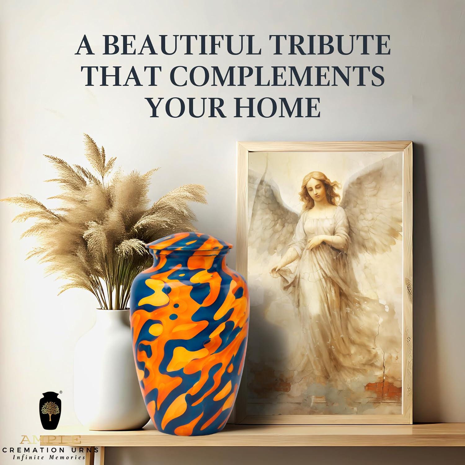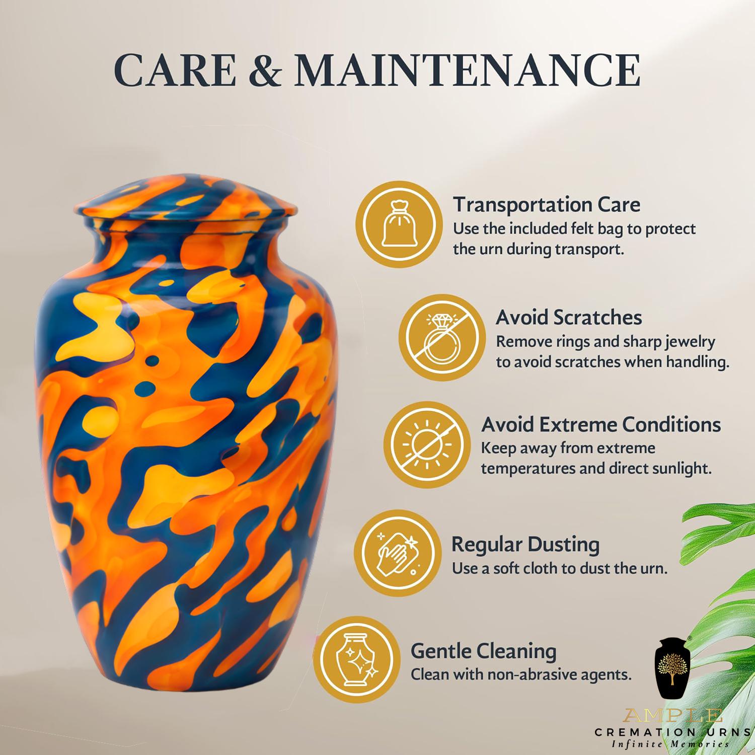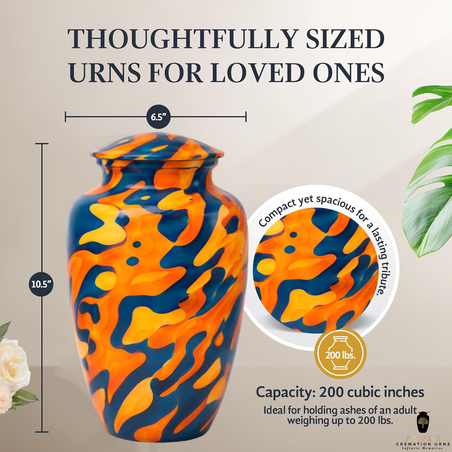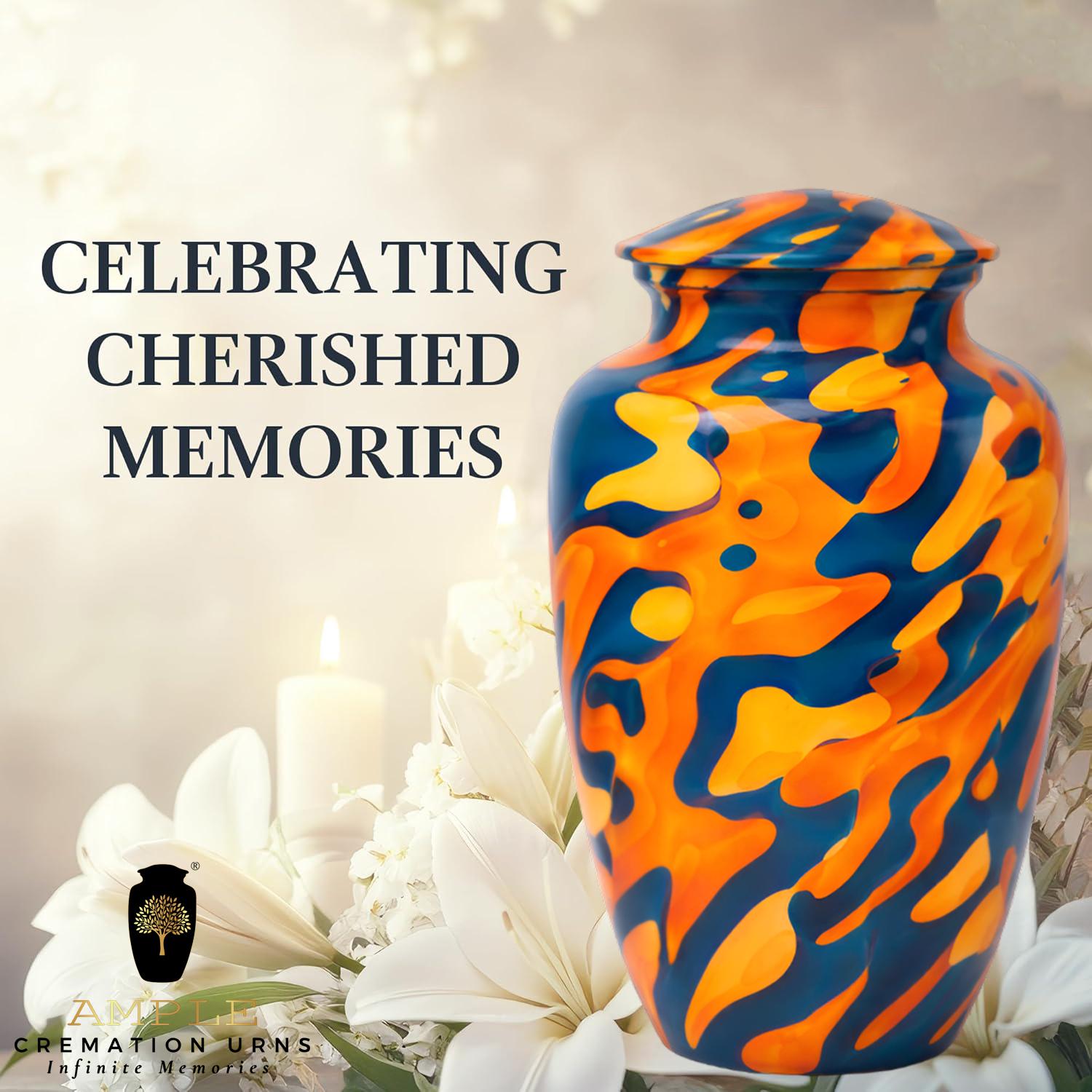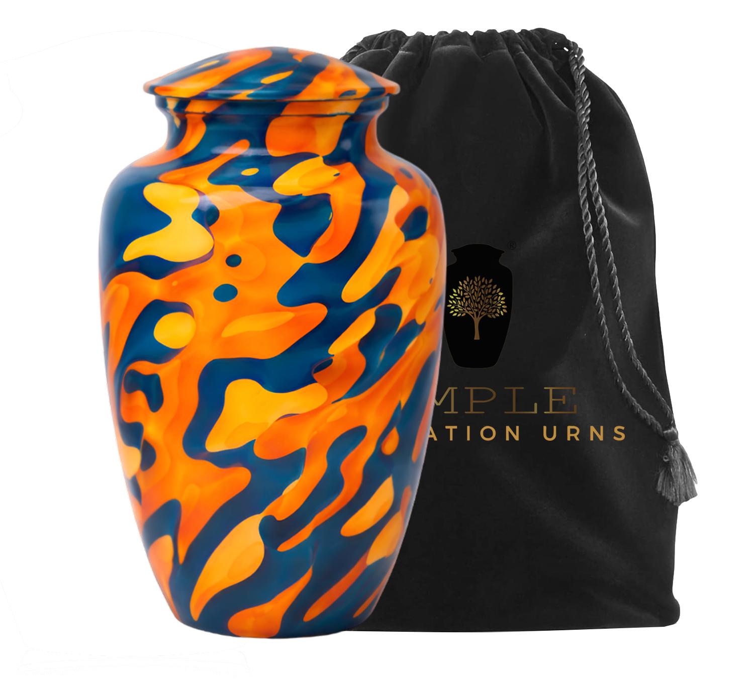 This eye-catching urn features a bold, high-definition abstract design reminiscent of liquid marble or flowing paint. The striking contrast between deep indigo blue and vibrant amber orange creates a sense of movement and energy, symbolizing a soul that was full of life and modern style. The organic, swirling patterns wrap seamlessly around the vessel, offering a unique perspective from every angle. This urn comes with a premium black velvet drawstring bag featuring a gold-stamped logo, providing both a dignified presentation and extra protection for this artistic final resting place.