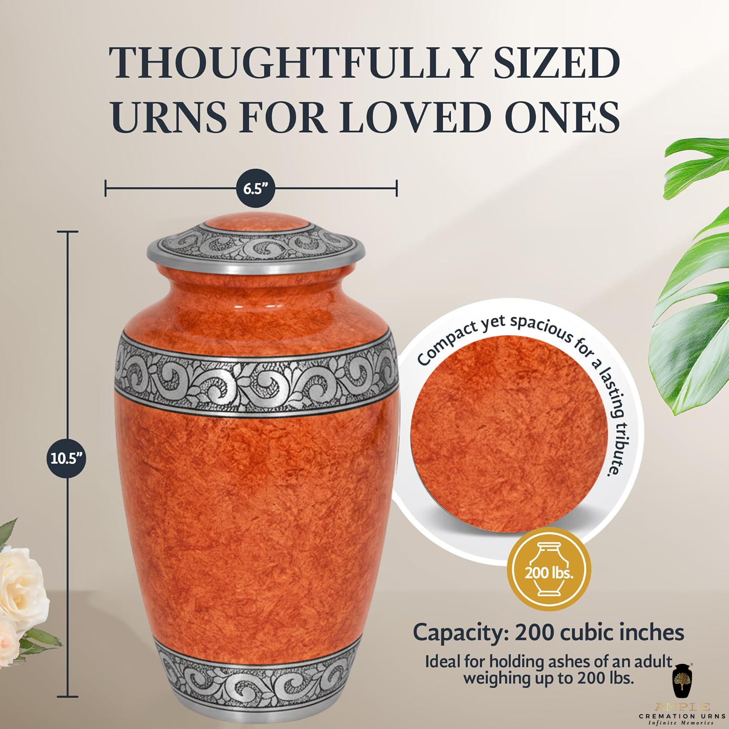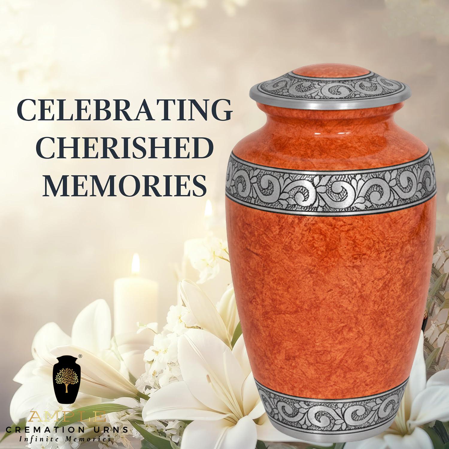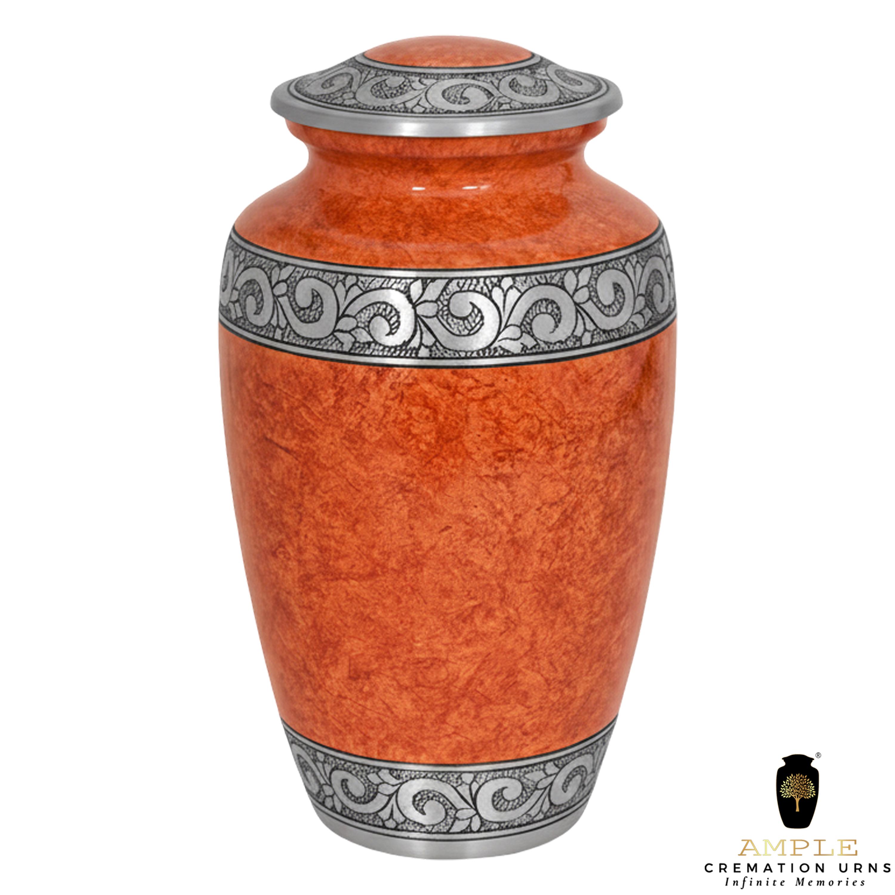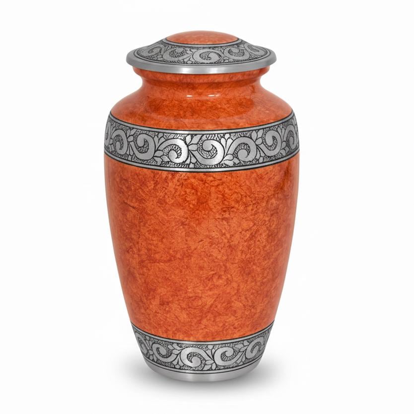 This sophisticated vessel features a rich, textured finish in warm amber and terracotta tones, reminiscent of natural stone or polished marble. The earthy palette is beautifully contrasted by a series of three hand-engraved silver bands located at the lid, the center, and the base. Each band showcases an intricate, flowing floral and vine motif, symbolizing the cycle of life and the lasting beauty of cherished memories. With its timeless silhouette and balanced design, this urn provides a dignified and elegant final resting place for a loved one whose legacy remains rooted in grace.