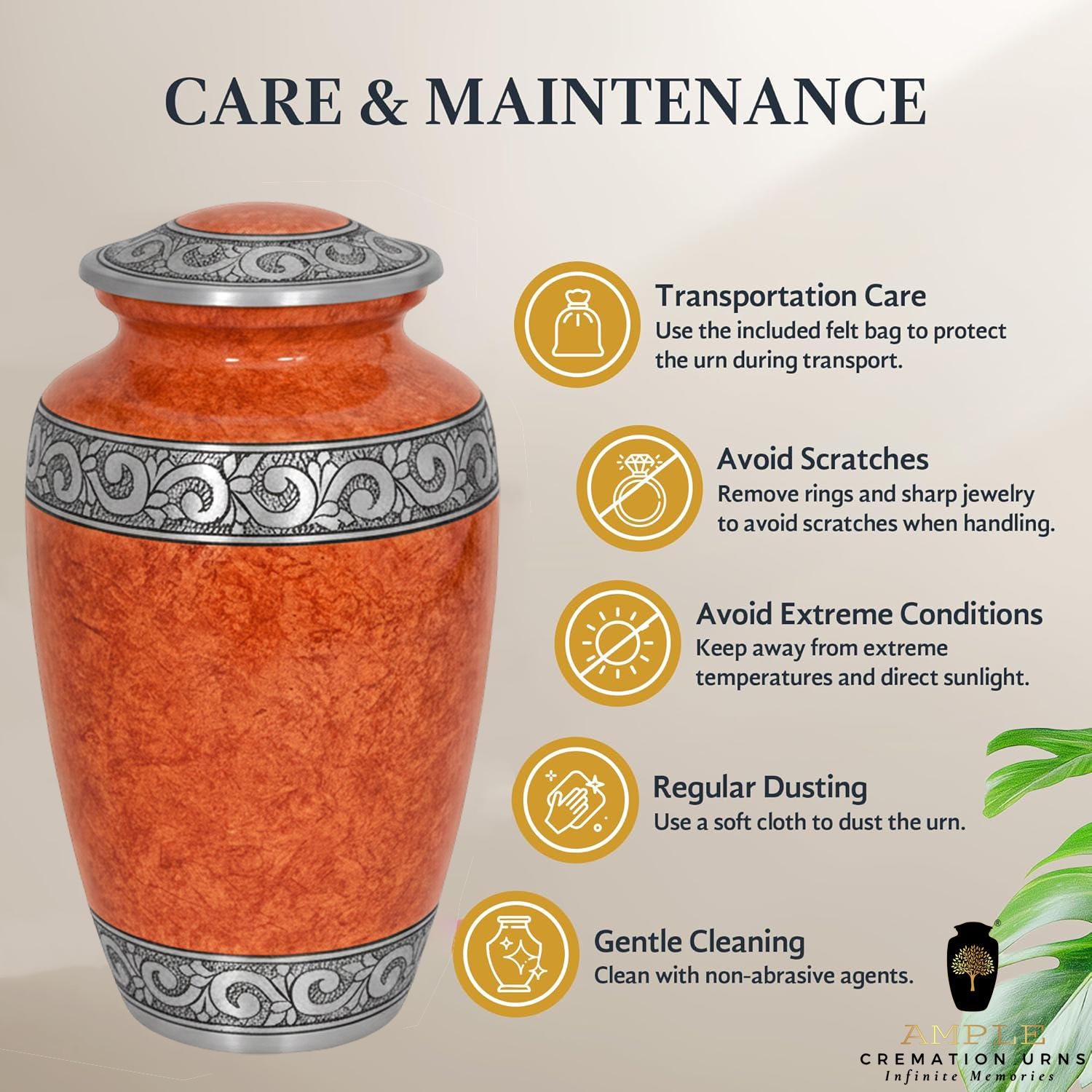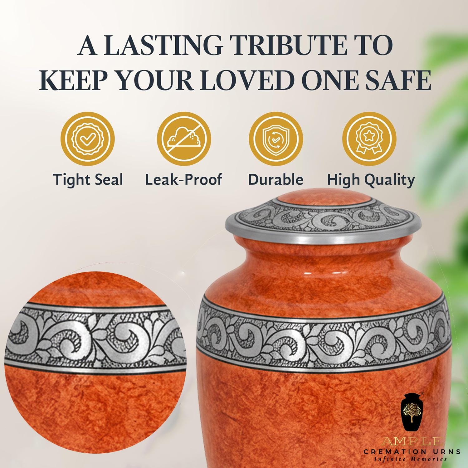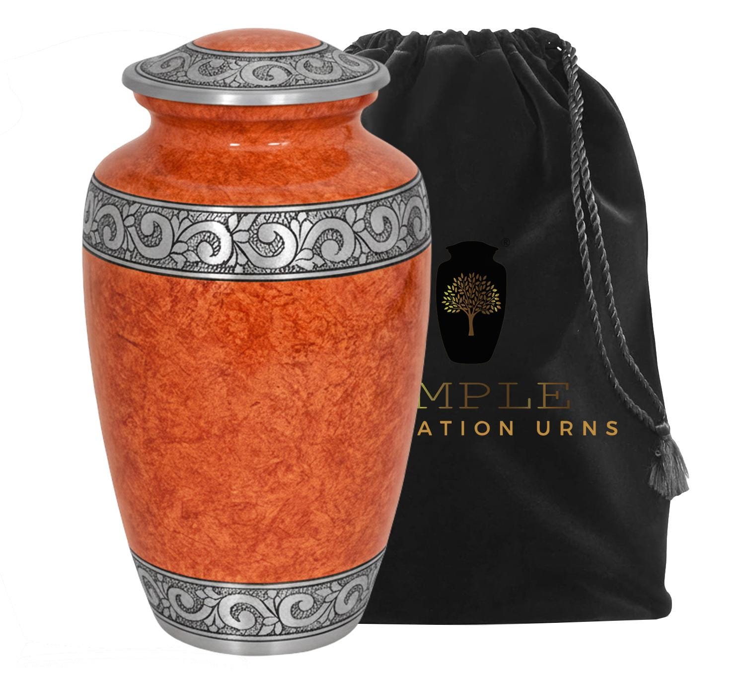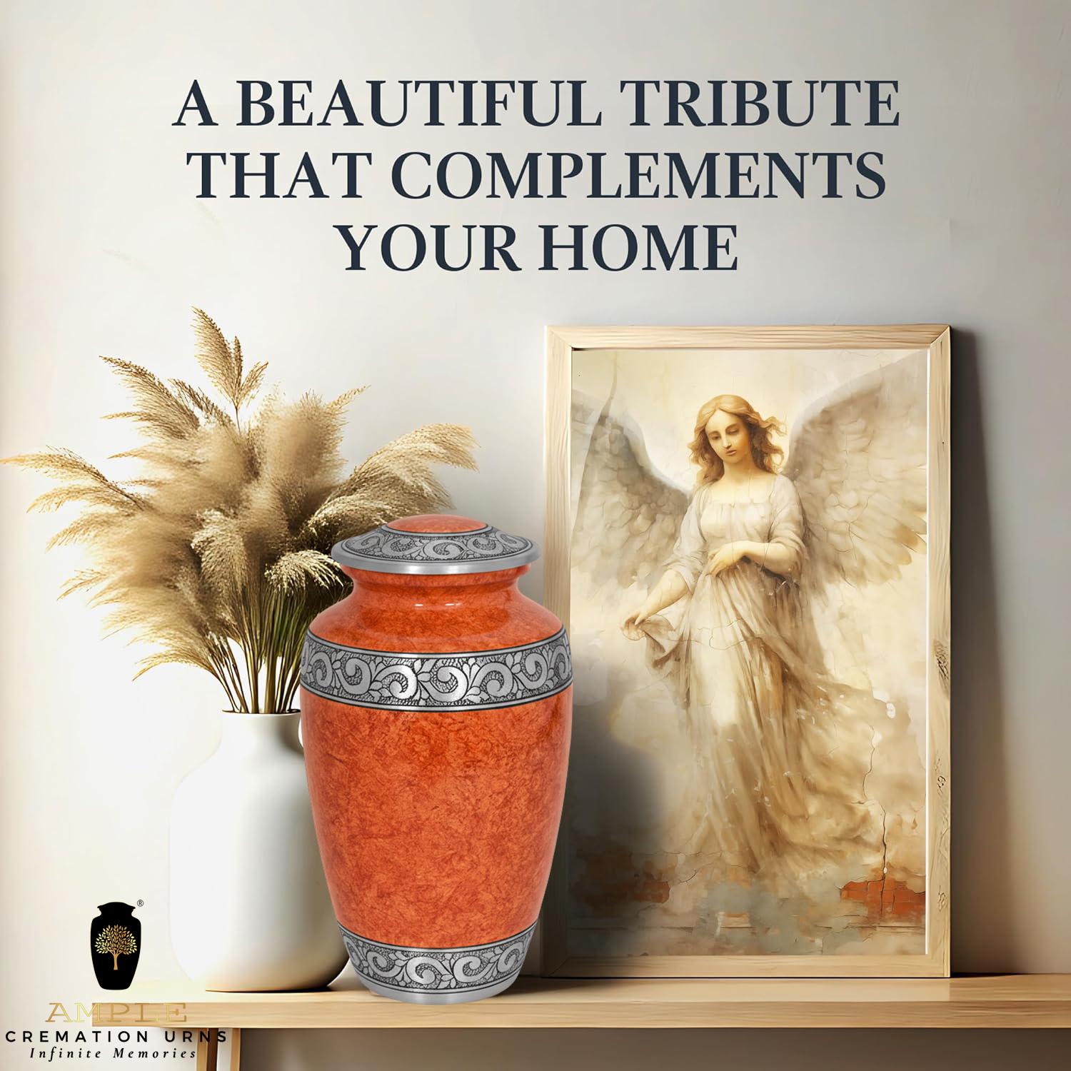 This sophisticated vessel features a rich, textured finish in warm amber and terracotta tones, reminiscent of natural stone or polished marble. The earthy palette is beautifully contrasted by a series of three hand-engraved silver bands located at the lid, the center, and the base. Each band showcases an intricate, flowing floral and vine motif, symbolizing the cycle of life and the lasting beauty of cherished memories. With its timeless silhouette and balanced design, this urn provides a dignified and elegant final resting place for a loved one whose legacy remains rooted in grace.