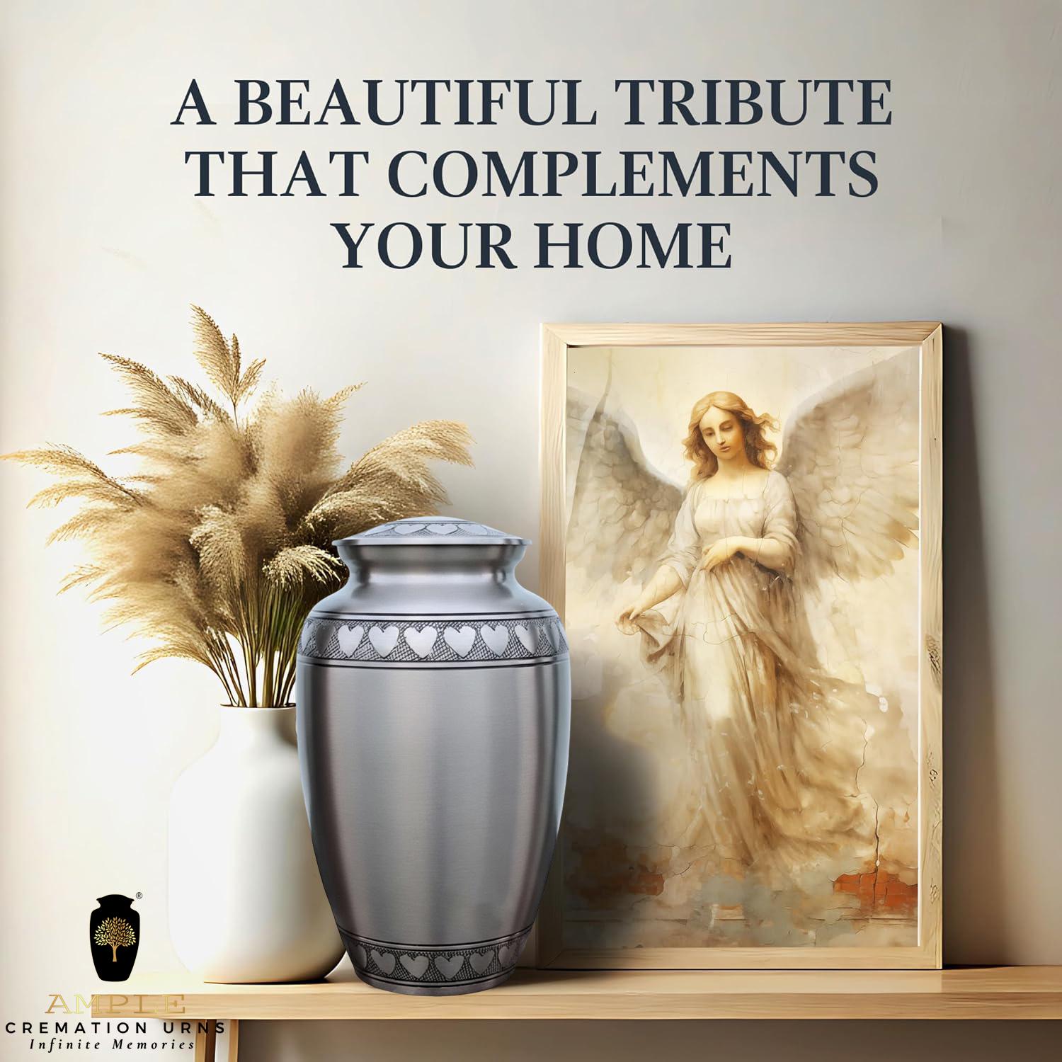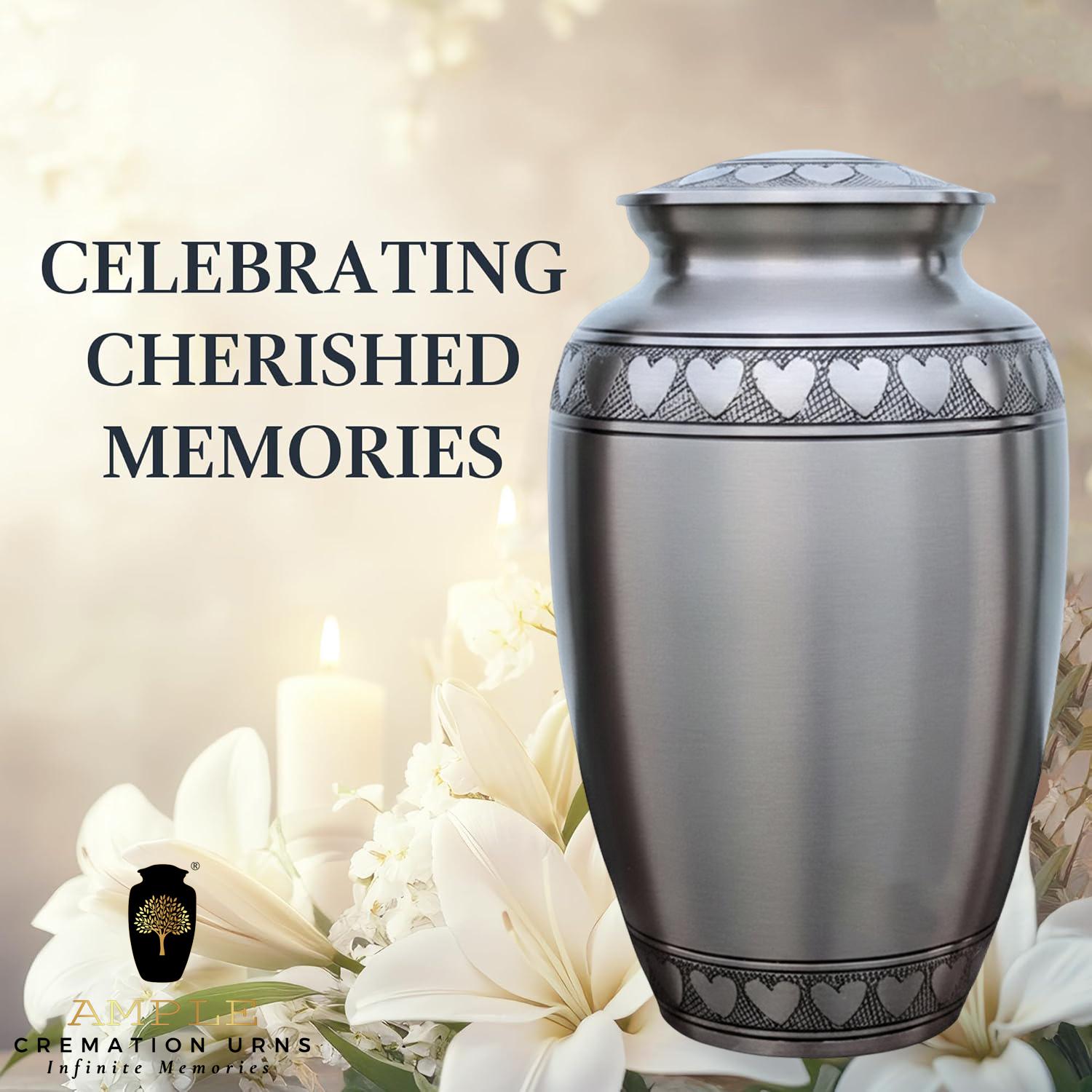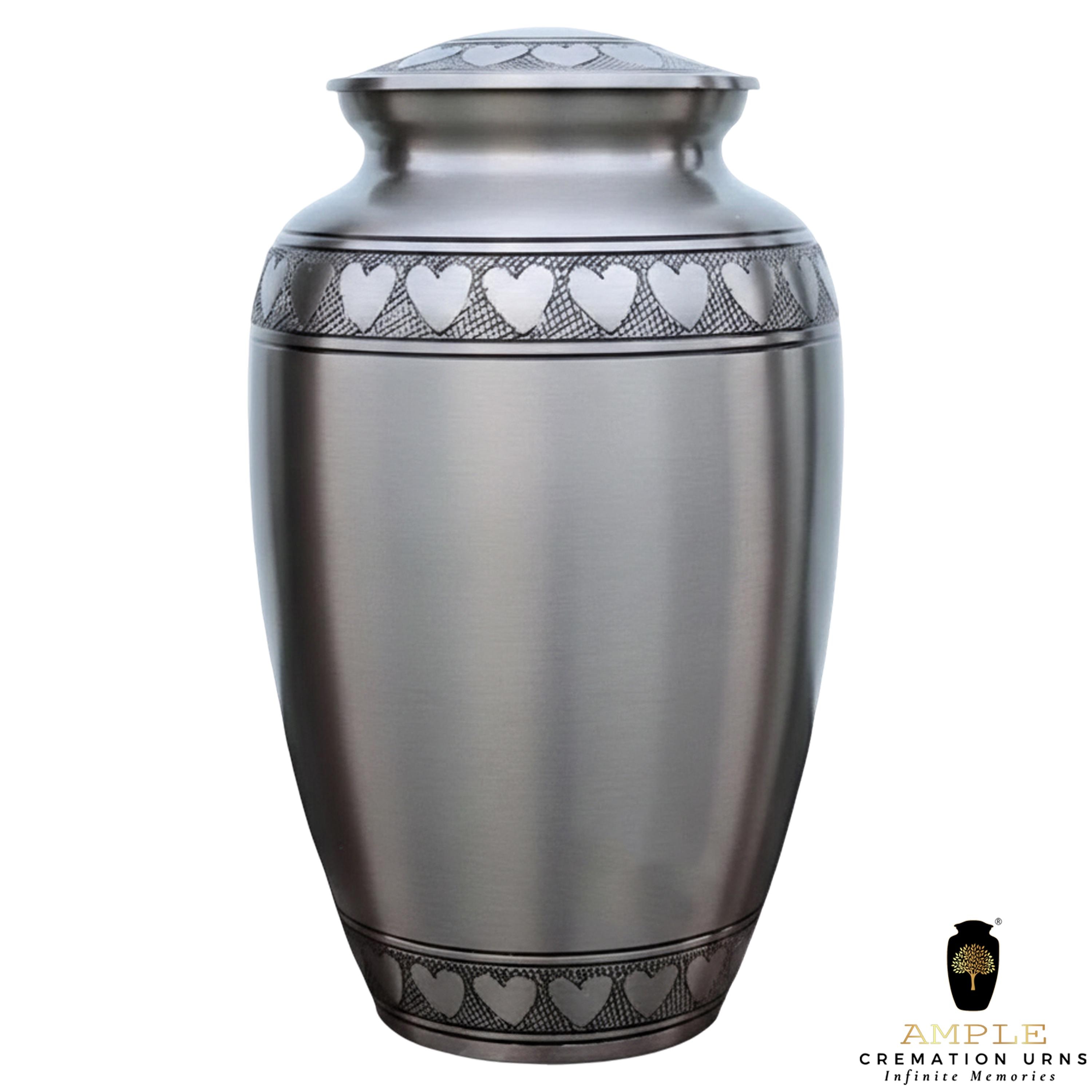 This classic and dignified vessel features a sophisticated brushed pewter finish that offers a timeless, understated elegance. The design is centered around a beautifully hand-engraved band of interlocking silver hearts that circles the lid, the base, and the shoulder of the urn. These hearts serve as a powerful symbol of an unbreakable bond and a love that continues beyond time. Crafted from high-grade metal with a refined matte texture, this urn provides a secure and respectful final resting place, blending traditional craftsmanship with a modern aesthetic of grace and remembrance.