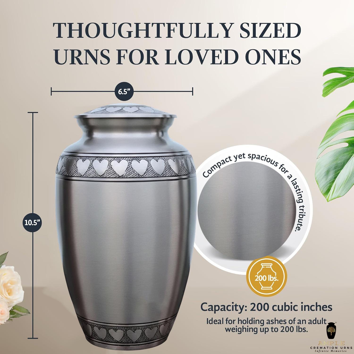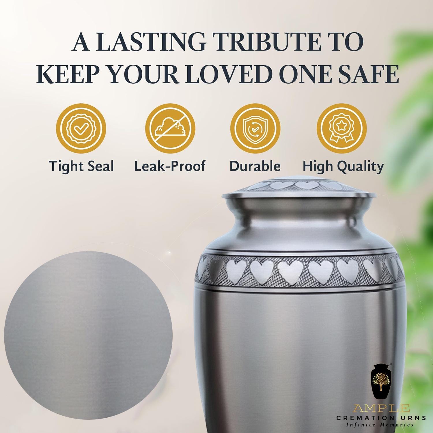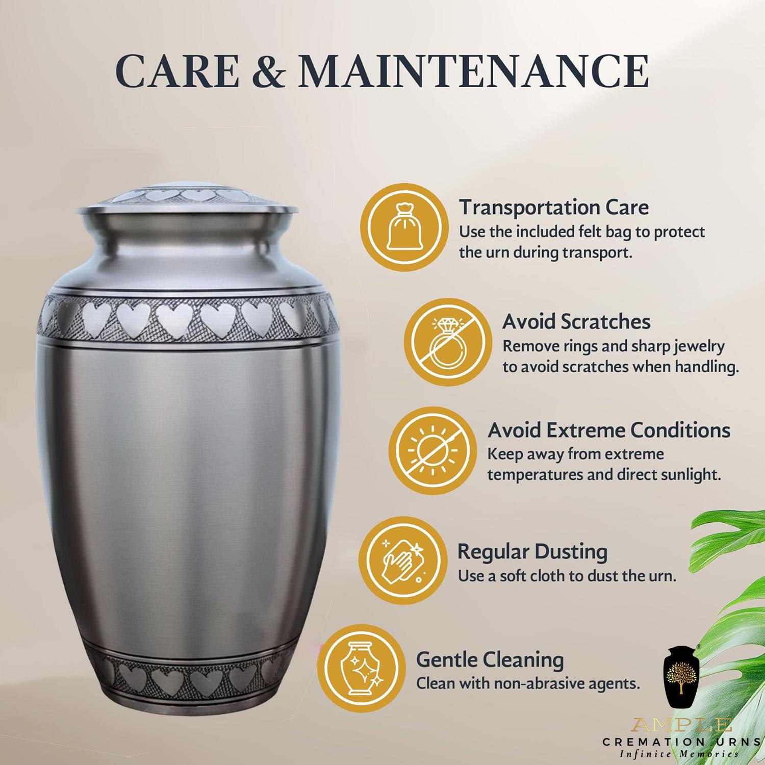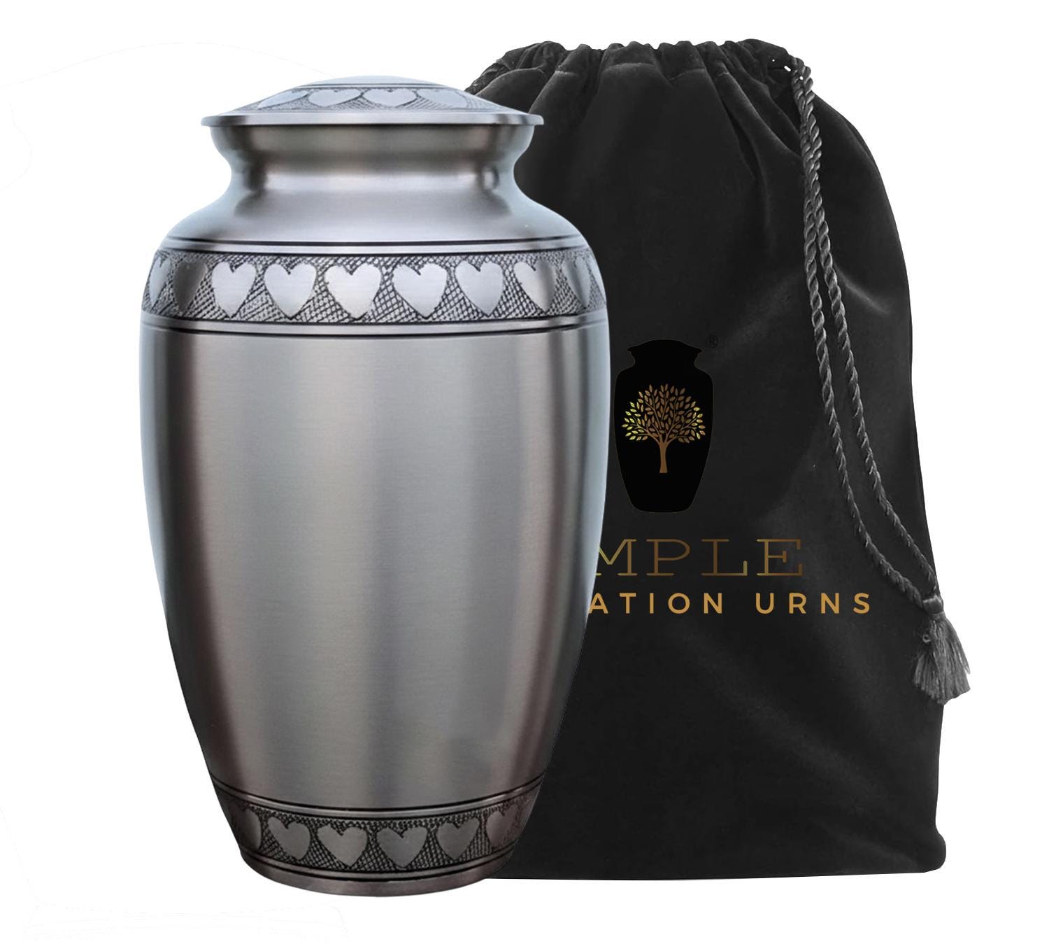 This classic and dignified vessel features a sophisticated brushed pewter finish that offers a timeless, understated elegance. The design is centered around a beautifully hand-engraved band of interlocking silver hearts that circles the lid, the base, and the shoulder of the urn. These hearts serve as a powerful symbol of an unbreakable bond and a love that continues beyond time. Crafted from high-grade metal with a refined matte texture, this urn provides a secure and respectful final resting place, blending traditional craftsmanship with a modern aesthetic of grace and remembrance.