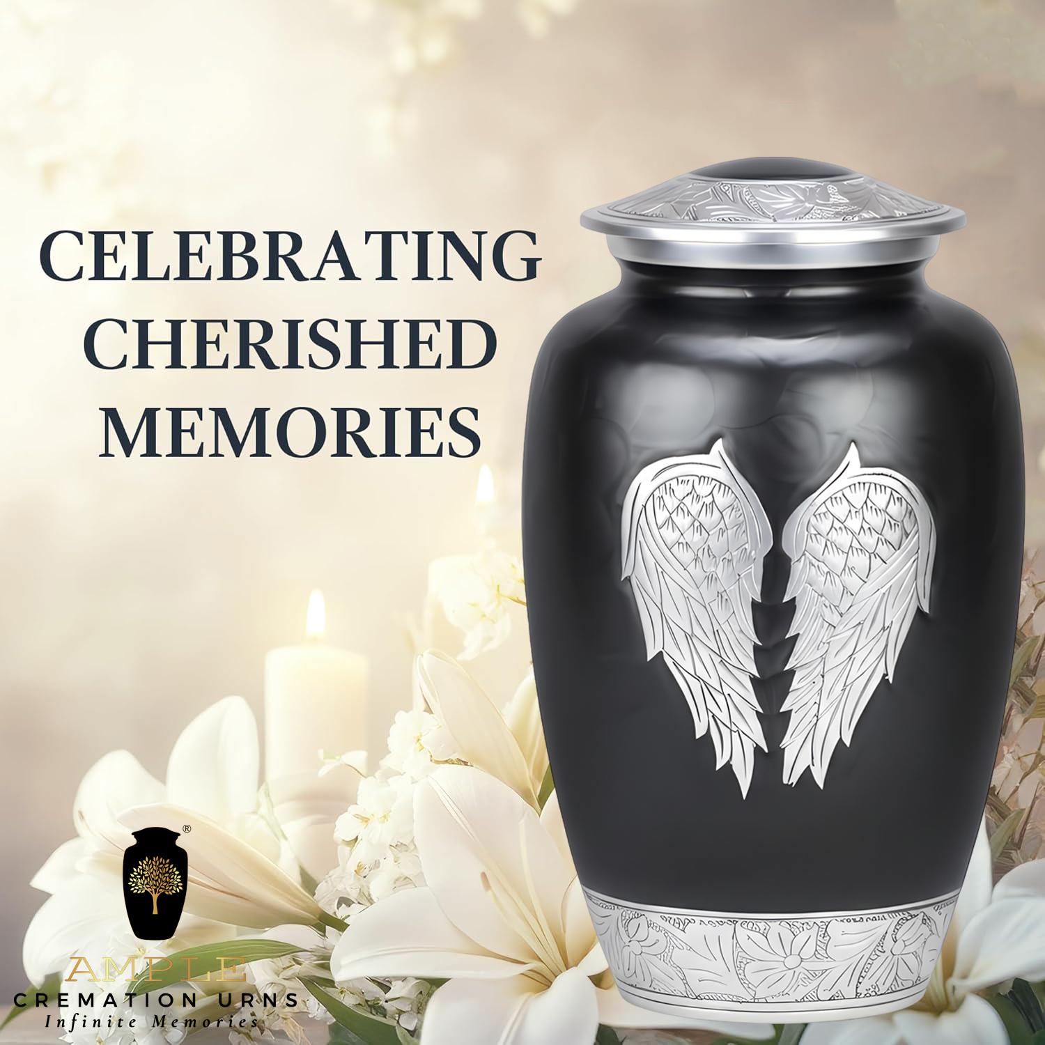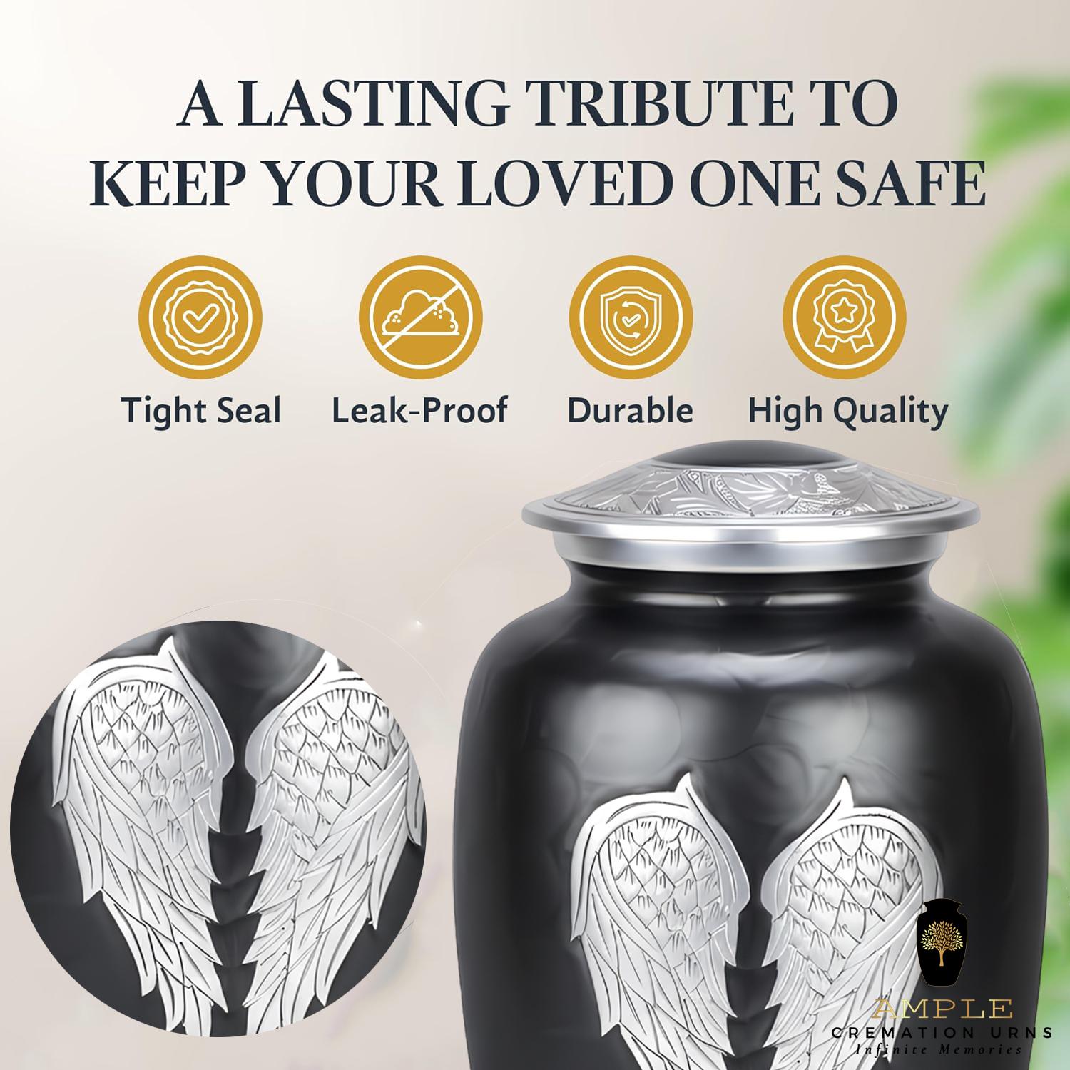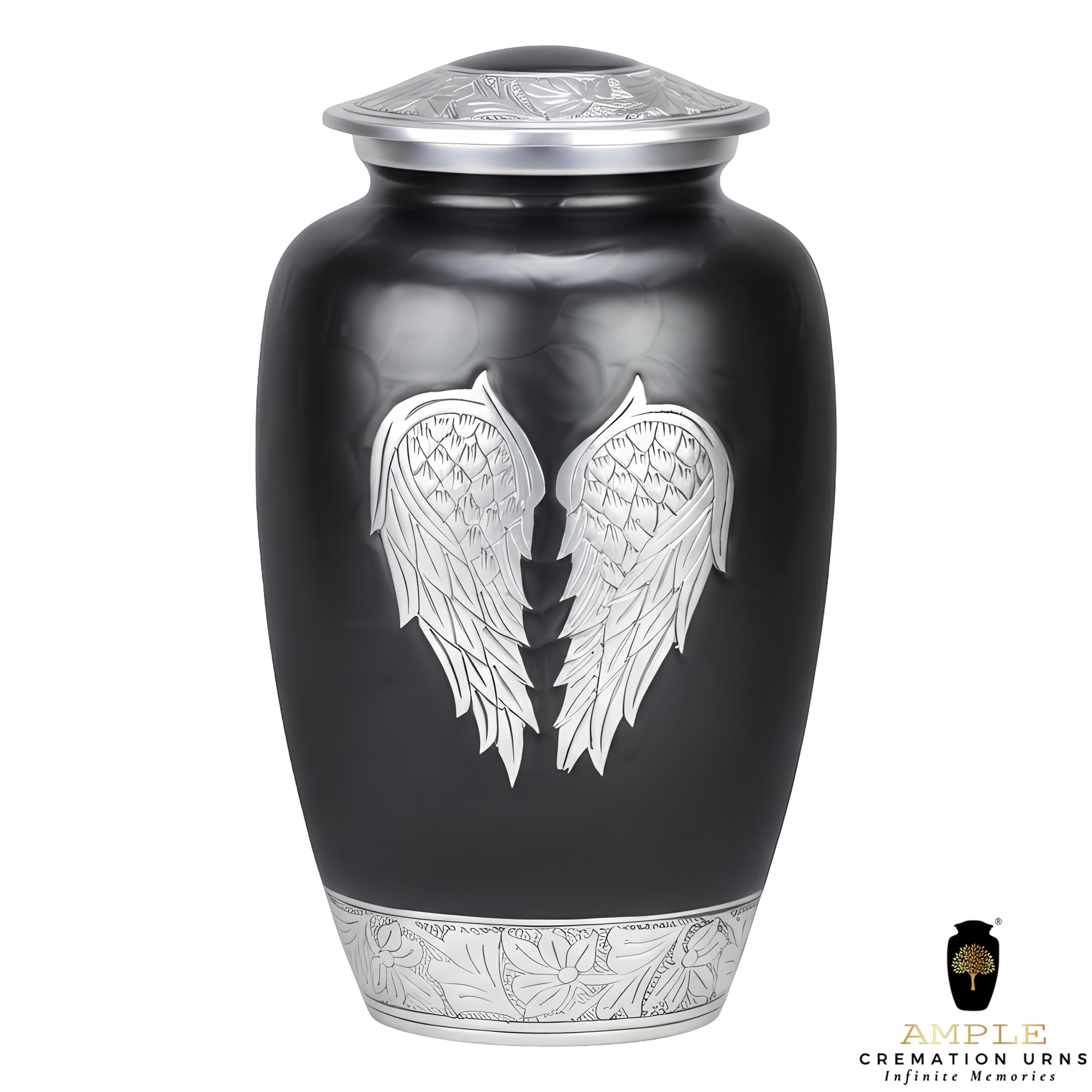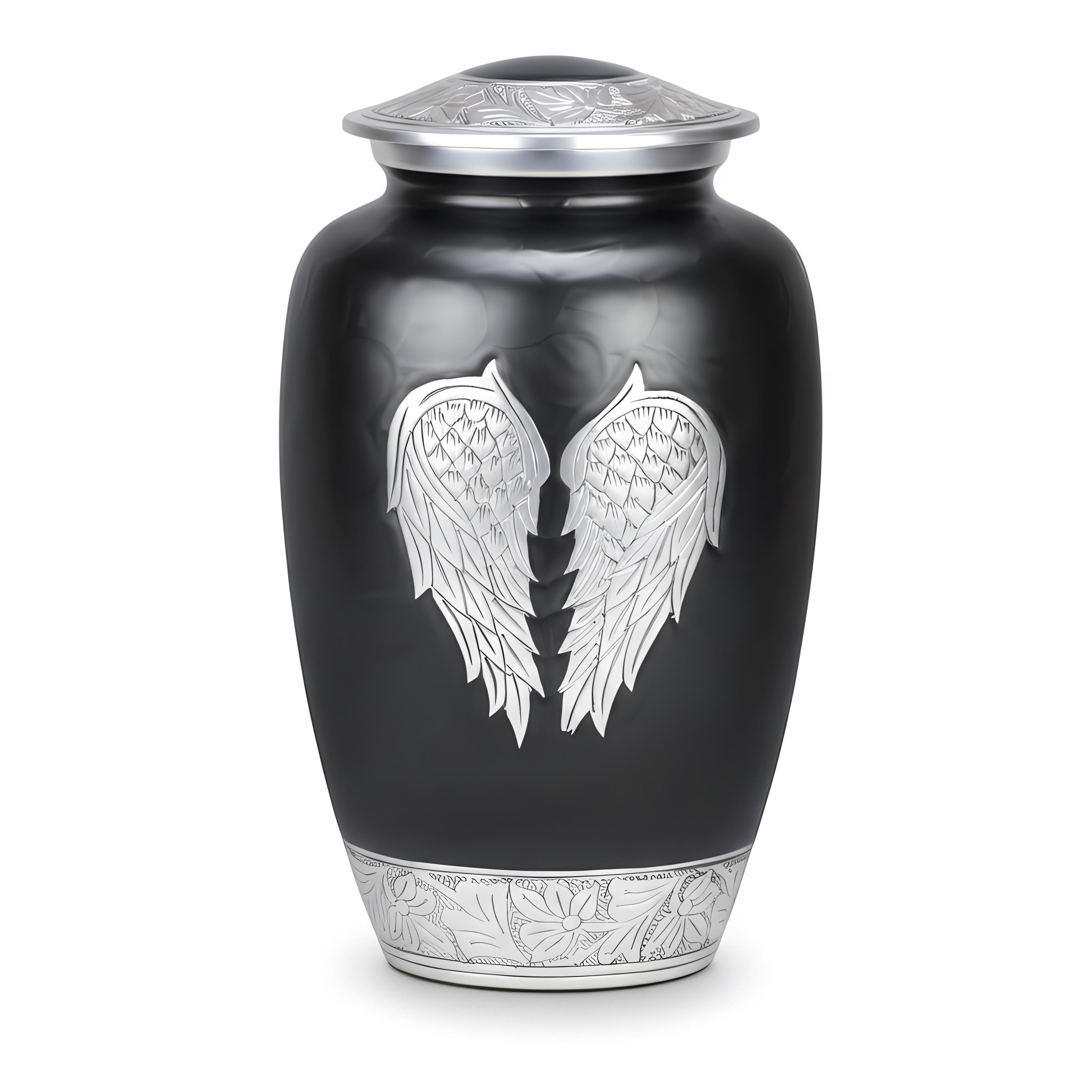 This poignant vessel features a sophisticated matte black finish that provides a dignified and modern backdrop for its central artistry. The front of the urn is adorned with a pair of expansive, hand-engraved silver angel wings, meticulously detailed to capture every feather in a state of peaceful rest. This imagery serves as a comforting reminder of a guardian’s love and a soul’s gentle transition. The design is further elevated by intricate floral and vine engravings on the lid and the polished silver base, creating a balanced and timeless tribute for a loved one whose spirit continues to watch over those they left behind.