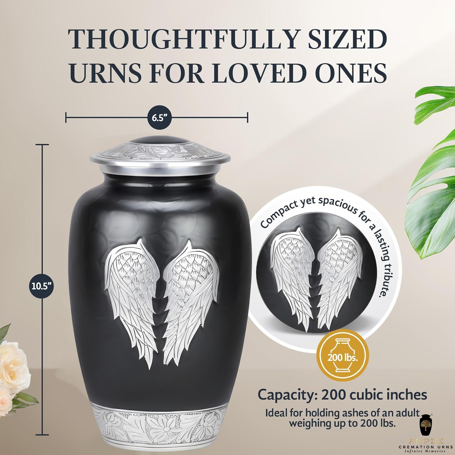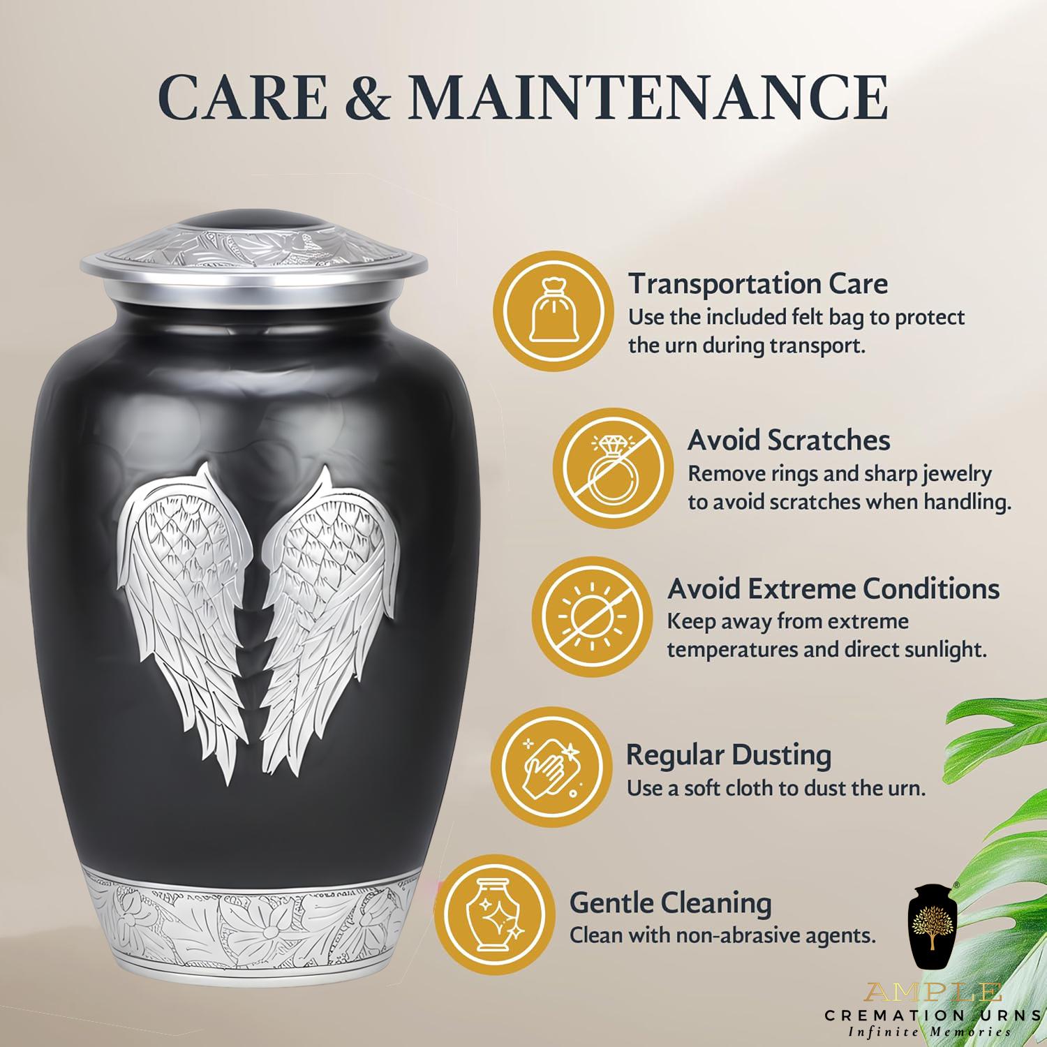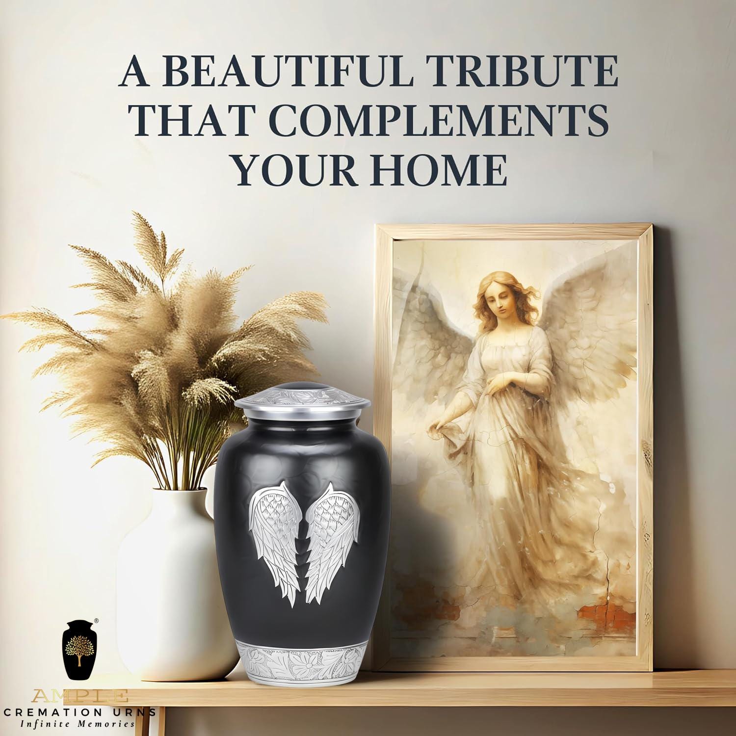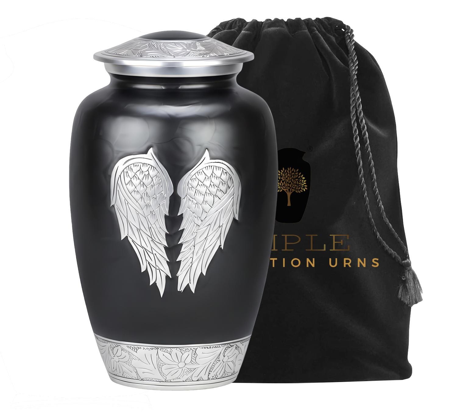 This poignant vessel features a sophisticated matte black finish that provides a dignified and modern backdrop for its central artistry. The front of the urn is adorned with a pair of expansive, hand-engraved silver angel wings, meticulously detailed to capture every feather in a state of peaceful rest. This imagery serves as a comforting reminder of a guardian’s love and a soul’s gentle transition. The design is further elevated by intricate floral and vine engravings on the lid and the polished silver base, creating a balanced and timeless tribute for a loved one whose spirit continues to watch over those they left behind.