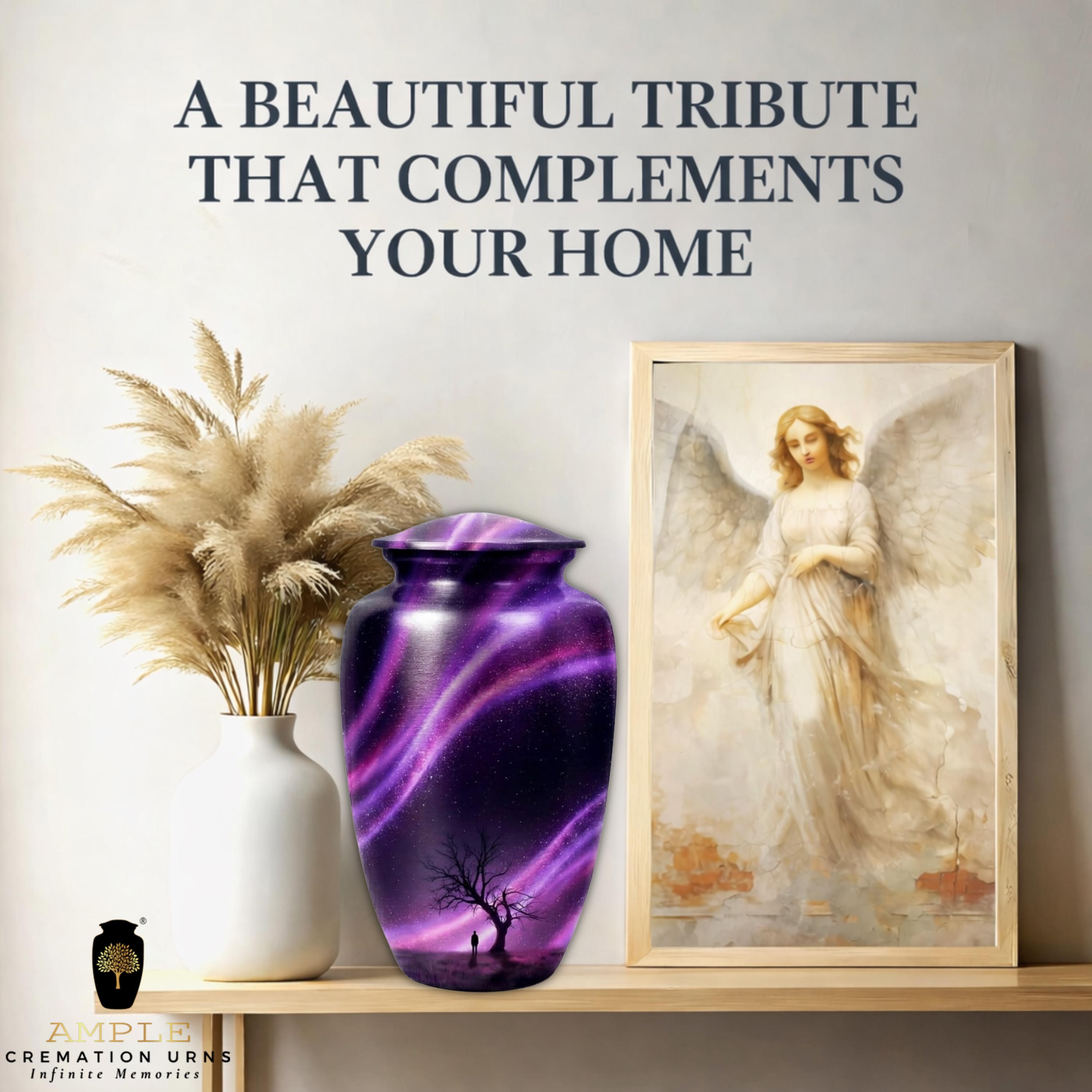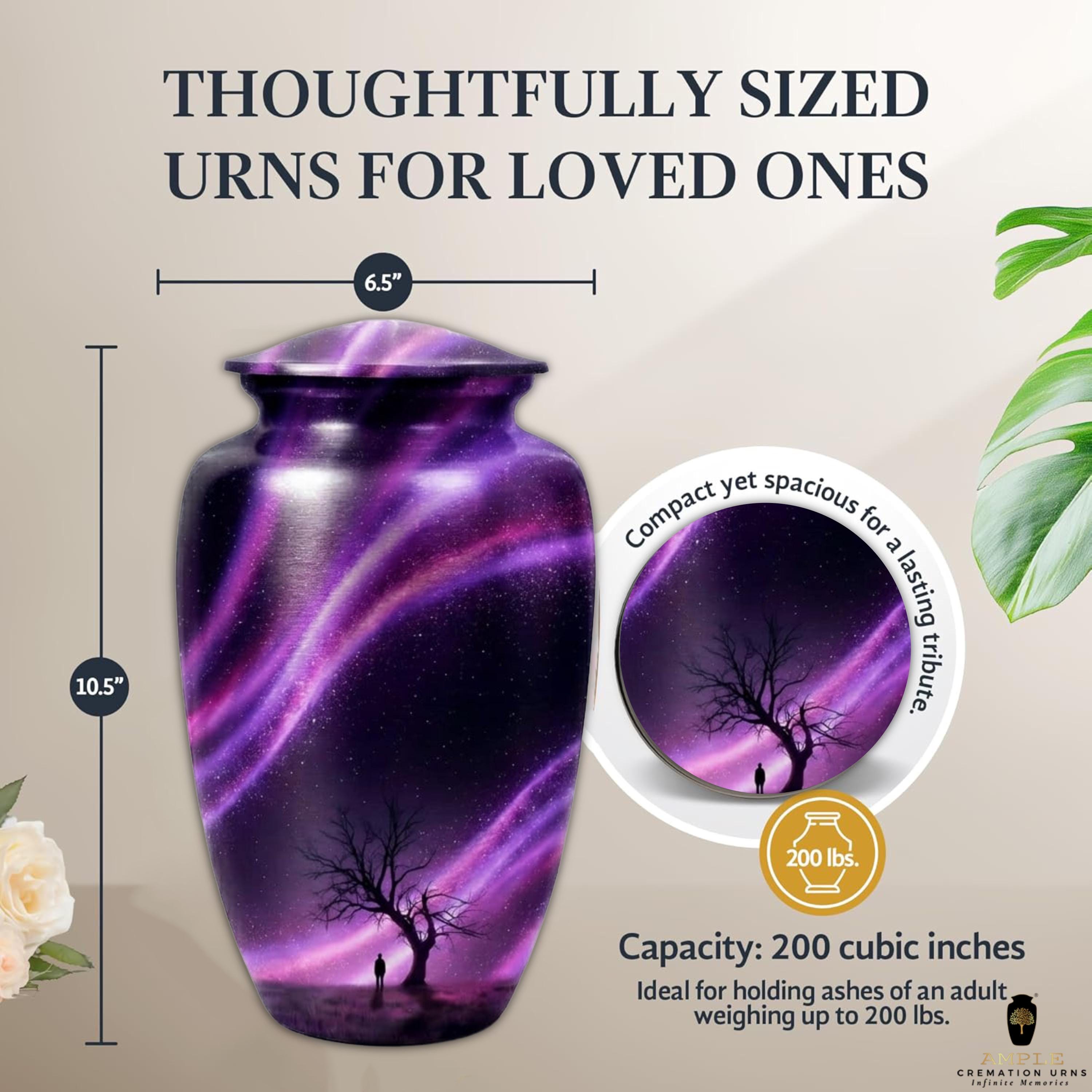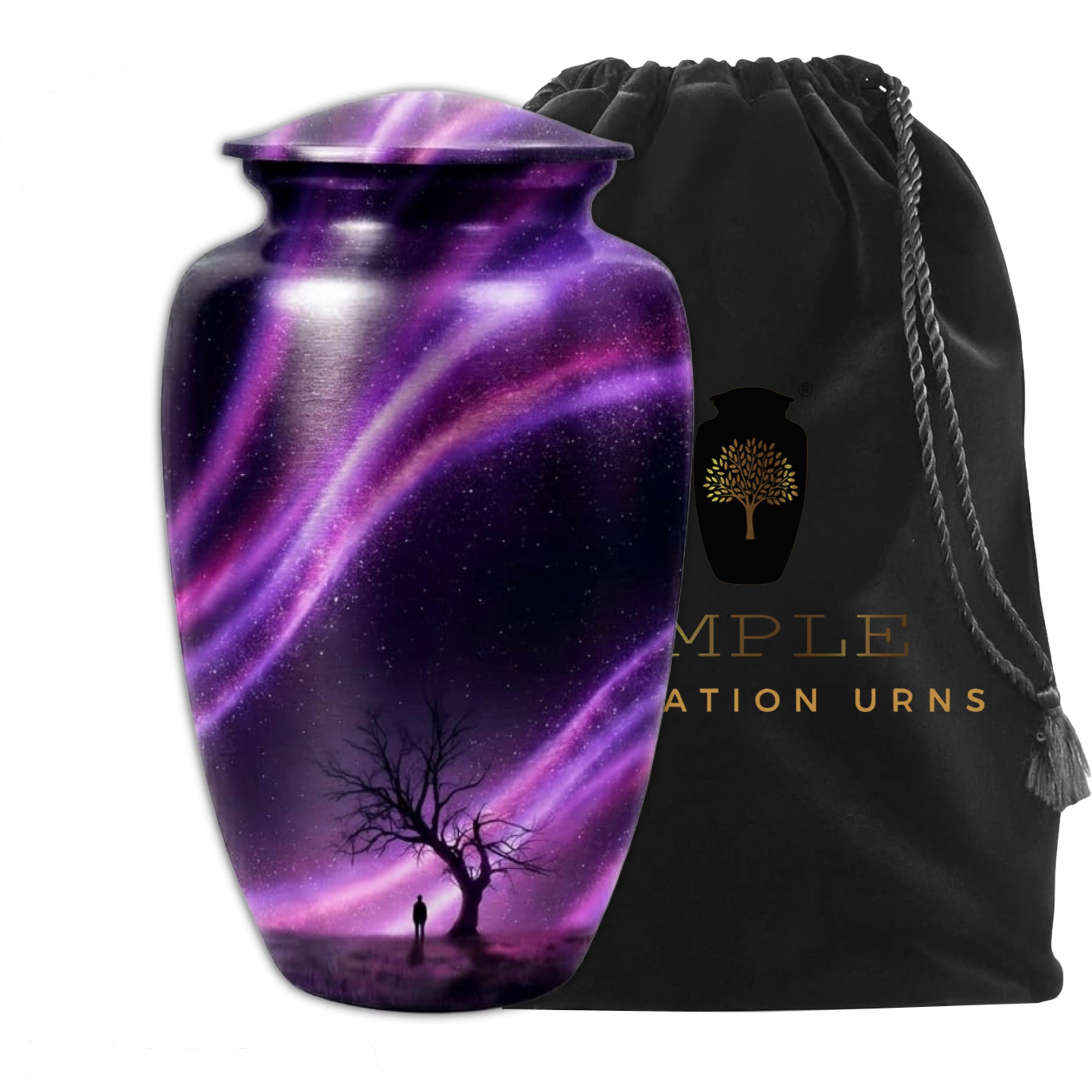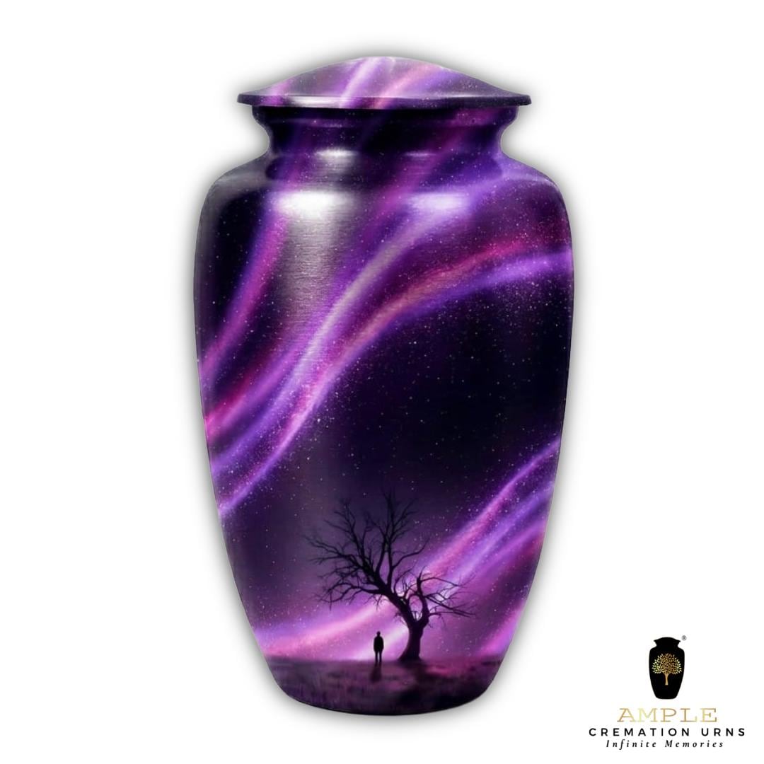 This breathtaking artistic vessel captures the ethereal beauty of a star-filled night sky illuminated by the dancing ribbons of the Northern Lights. The design features a lone, silhouetted tree and a solitary figure standing beneath a vibrant purple and pink aurora, symbolizing peace, solitude, and the vastness of the cosmos. Finished with a high-gloss protective coating, this urn serves as a moving tribute for someone who loved the majesty of the night sky or found beauty in quiet, meditative moments.