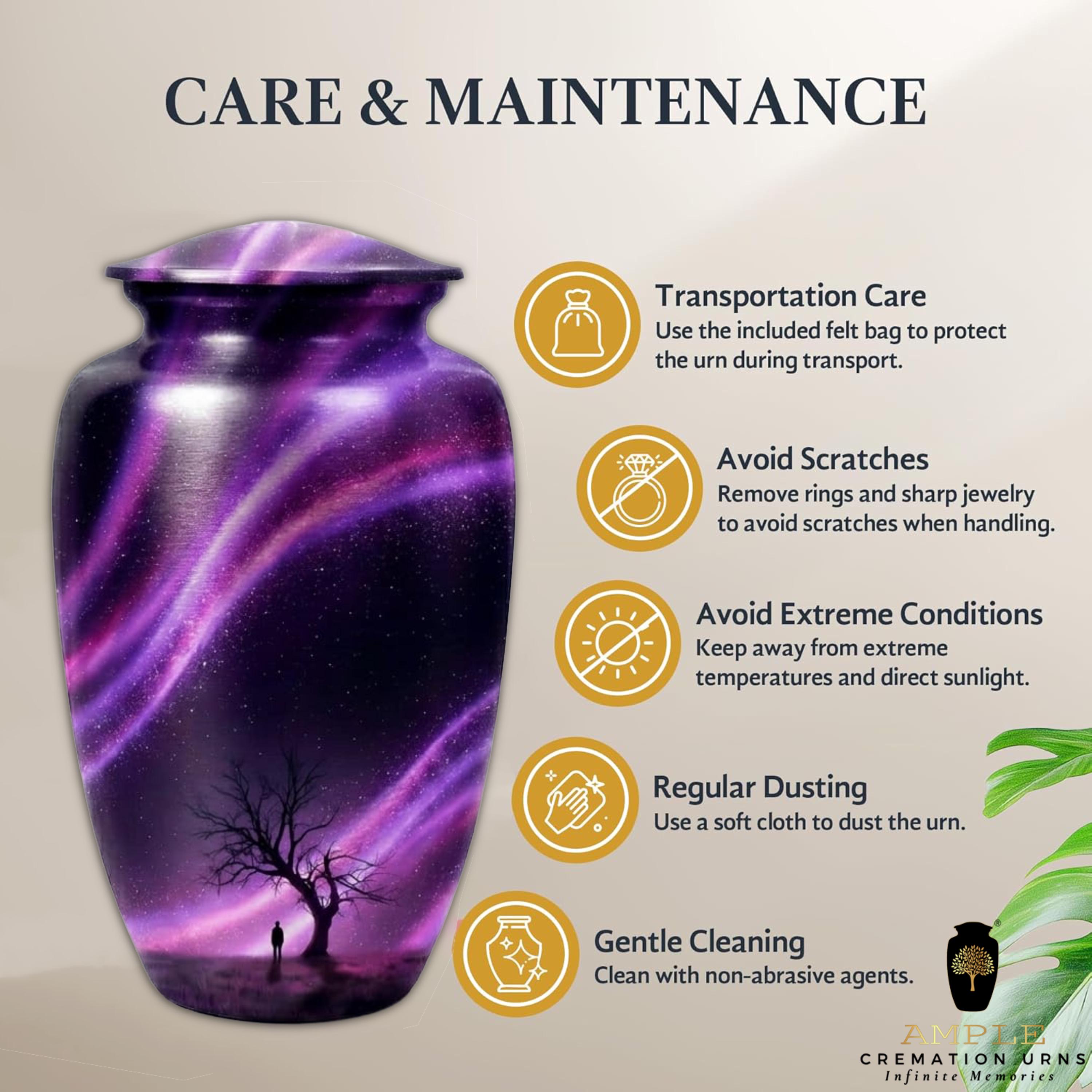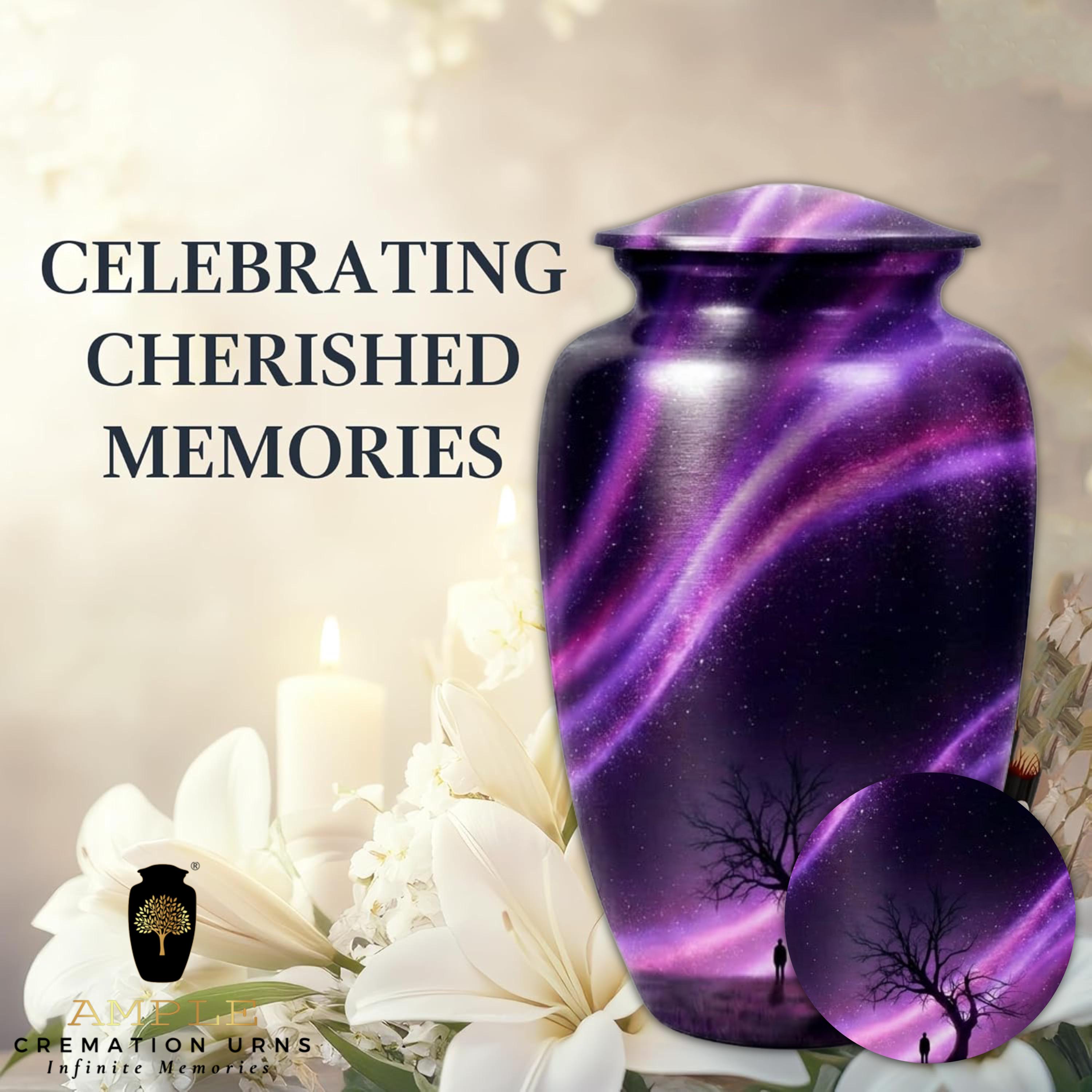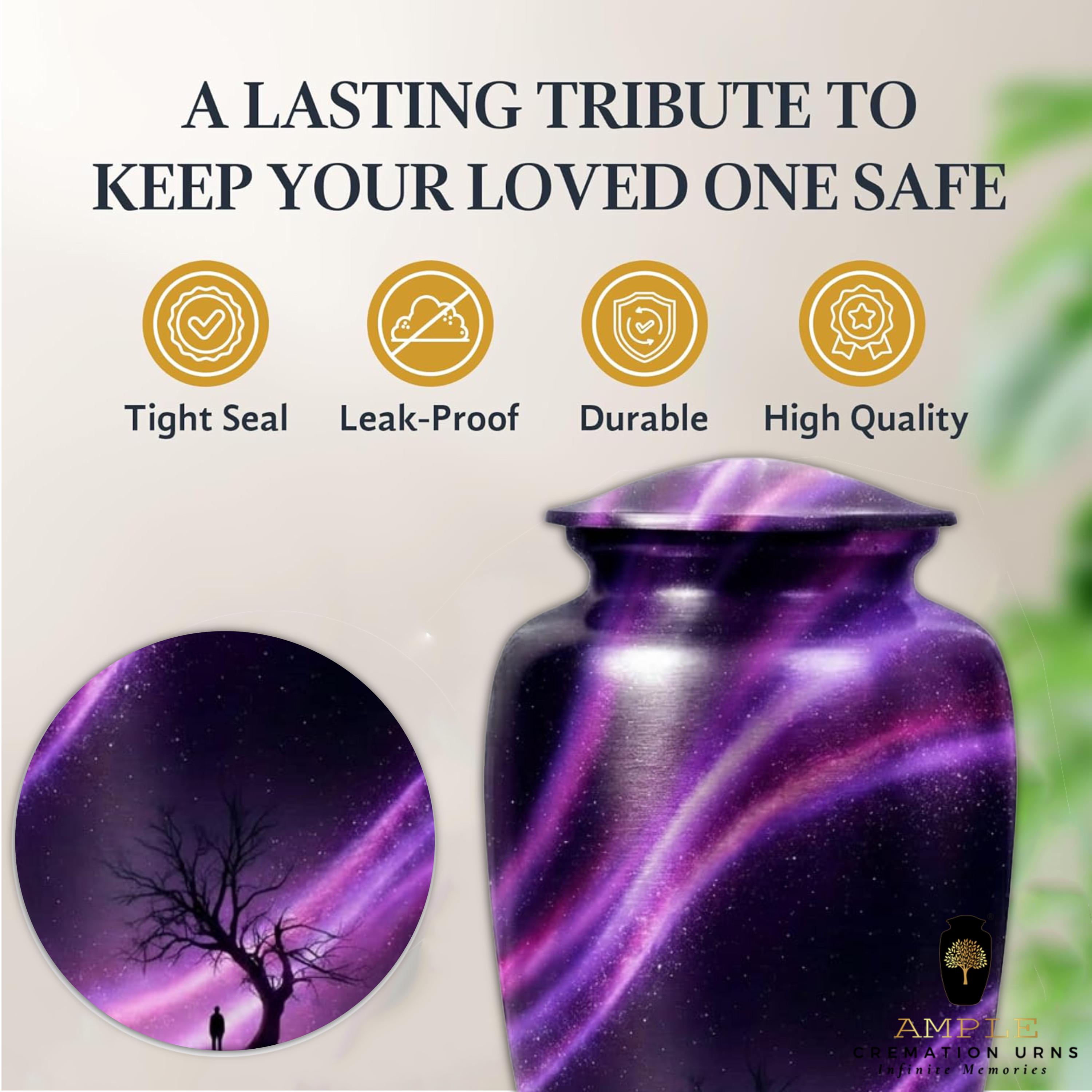 This breathtaking artistic vessel captures the ethereal beauty of a star-filled night sky illuminated by the dancing ribbons of the Northern Lights. The design features a lone, silhouetted tree and a solitary figure standing beneath a vibrant purple and pink aurora, symbolizing peace, solitude, and the vastness of the cosmos. Finished with a high-gloss protective coating, this urn serves as a moving tribute for someone who loved the majesty of the night sky or found beauty in quiet, meditative moments.