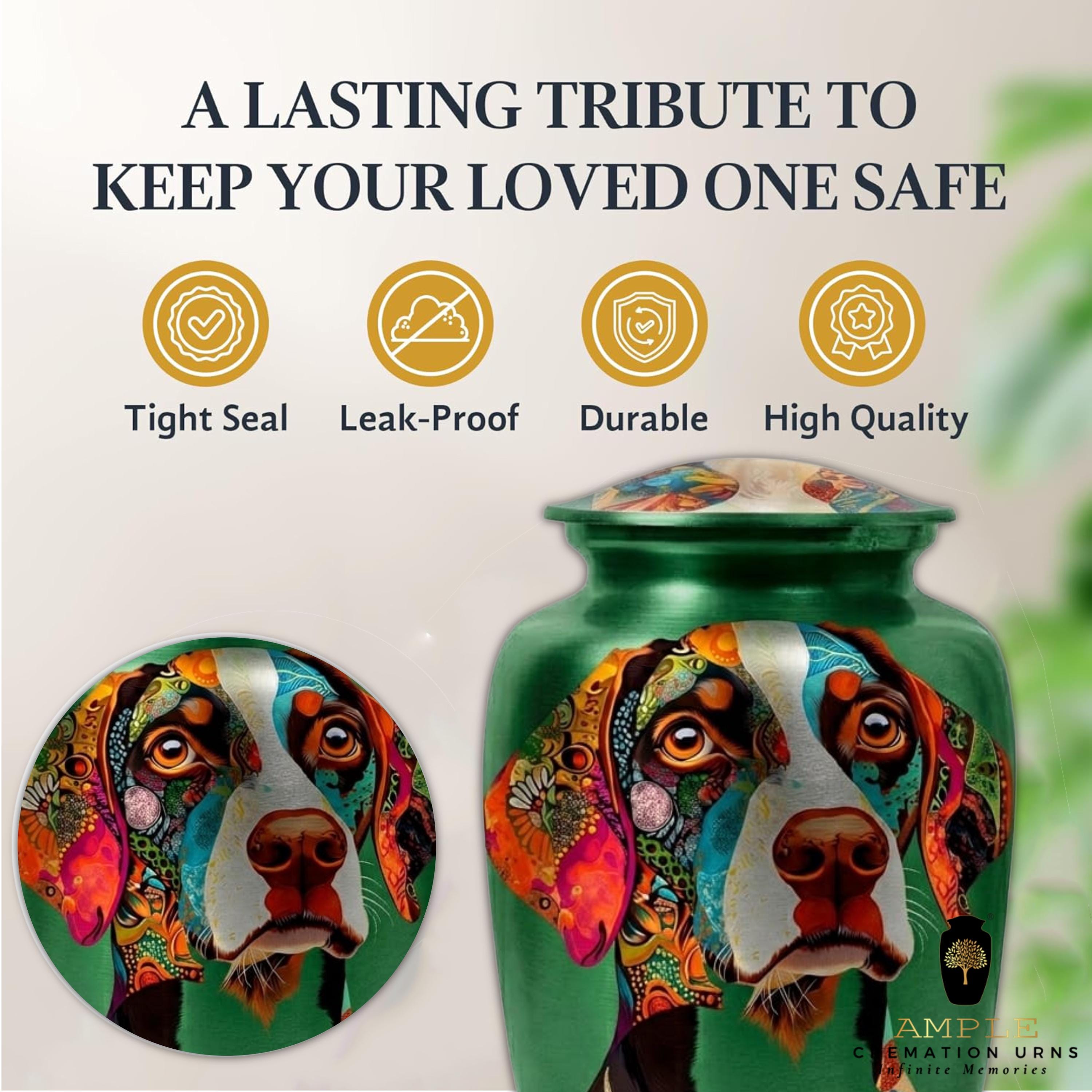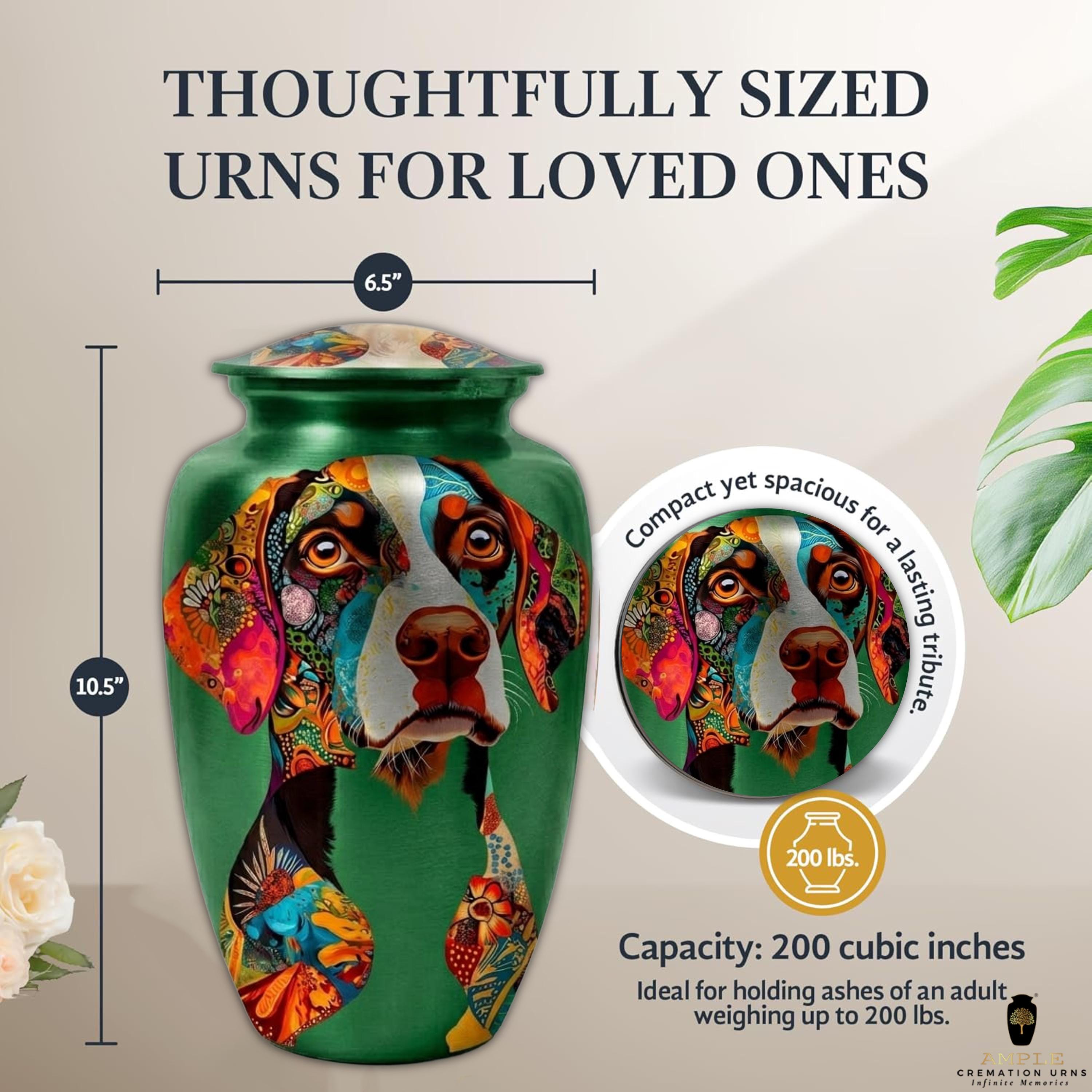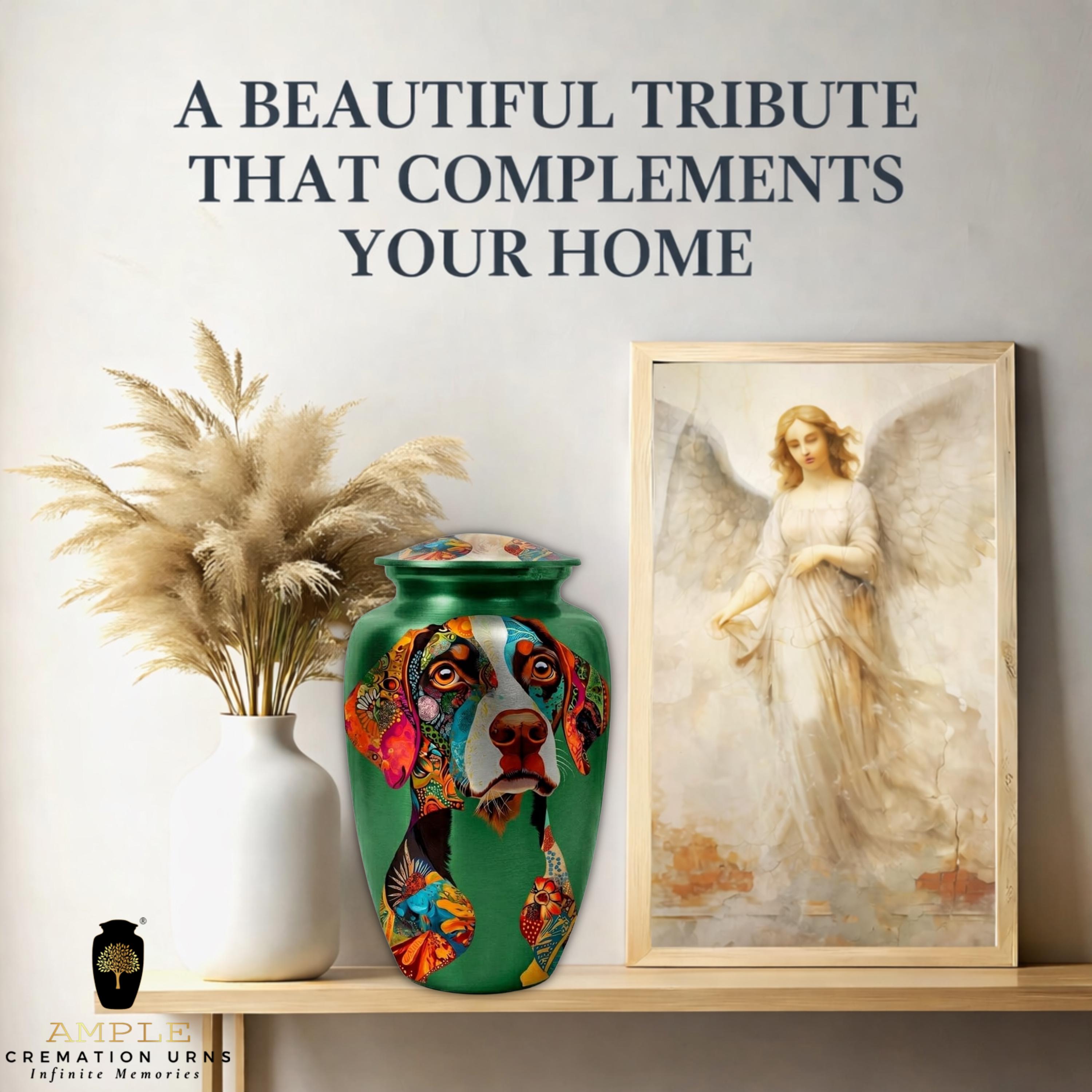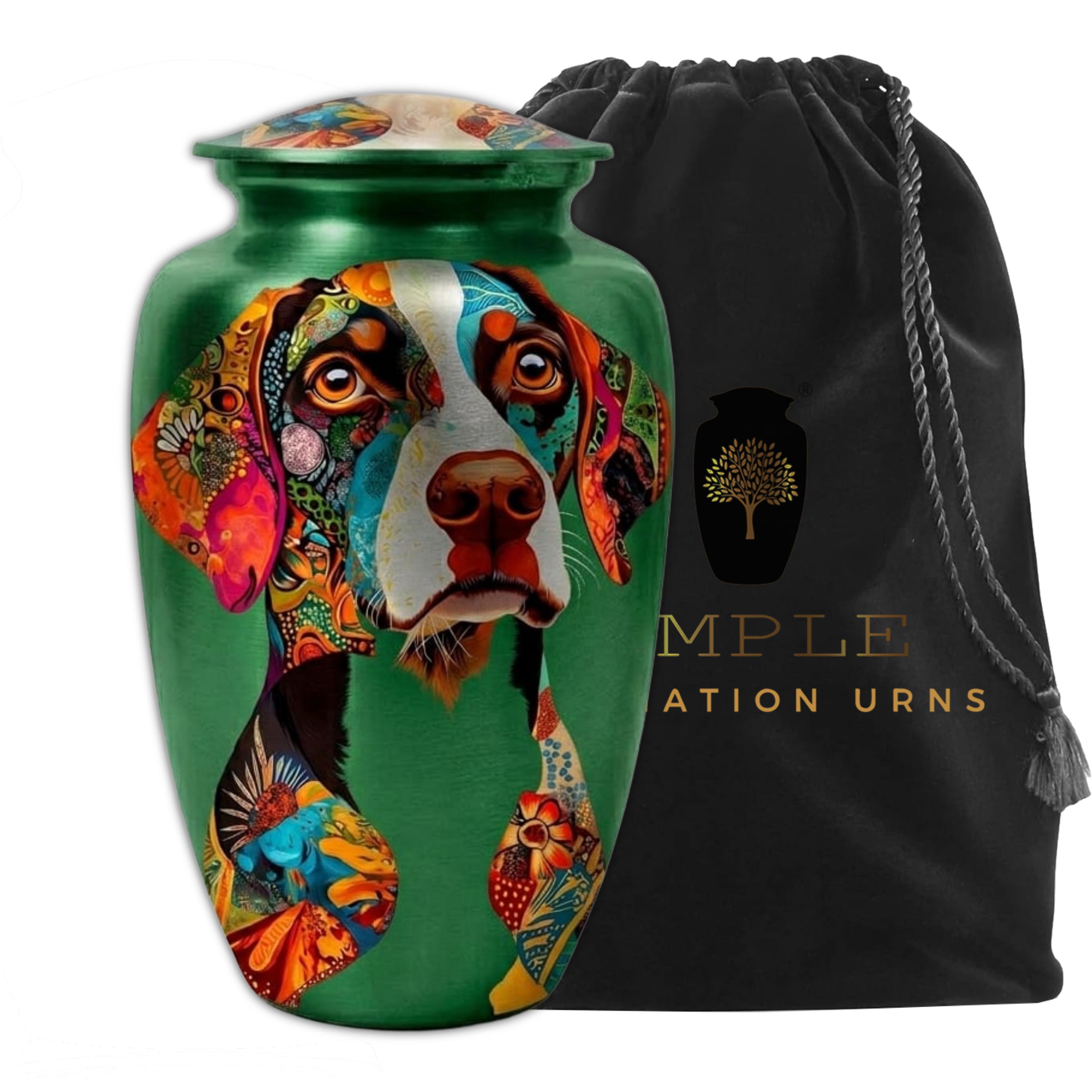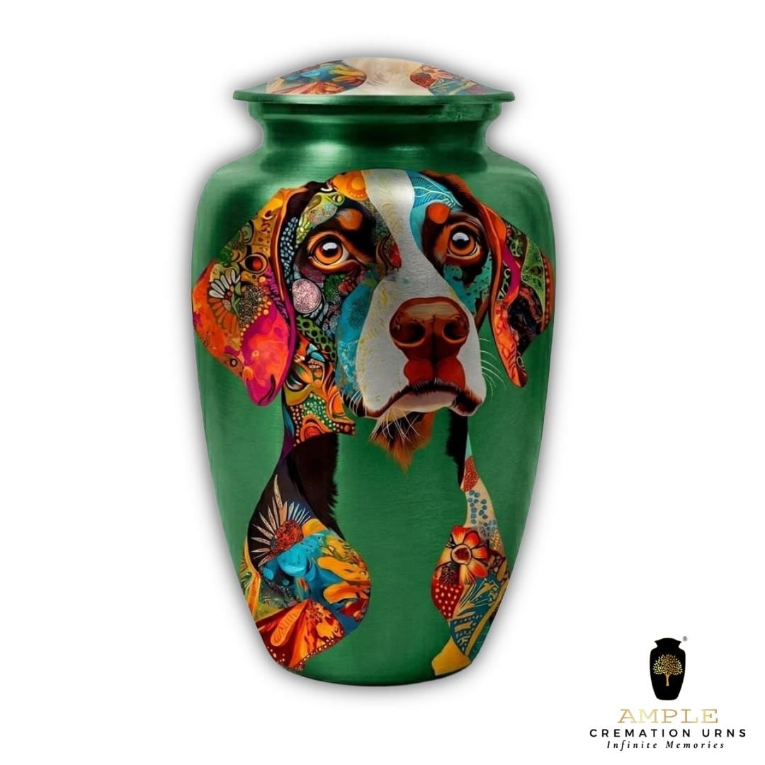 This unique artistic vessel features a soulful portrait of a Pointer dog, beautifully rendered with intricate, colorful mosaic patterns across the face and ears. Set against a rich emerald green background, this design captures the alert and gentle nature of one of the world's most beloved hunting and family companions. Finished with a high-gloss protective coating, this urn is a dignified and deeply personal tribute for a Pointer enthusiast or anyone who shared an unbreakable bond with their faithful four-legged friend.