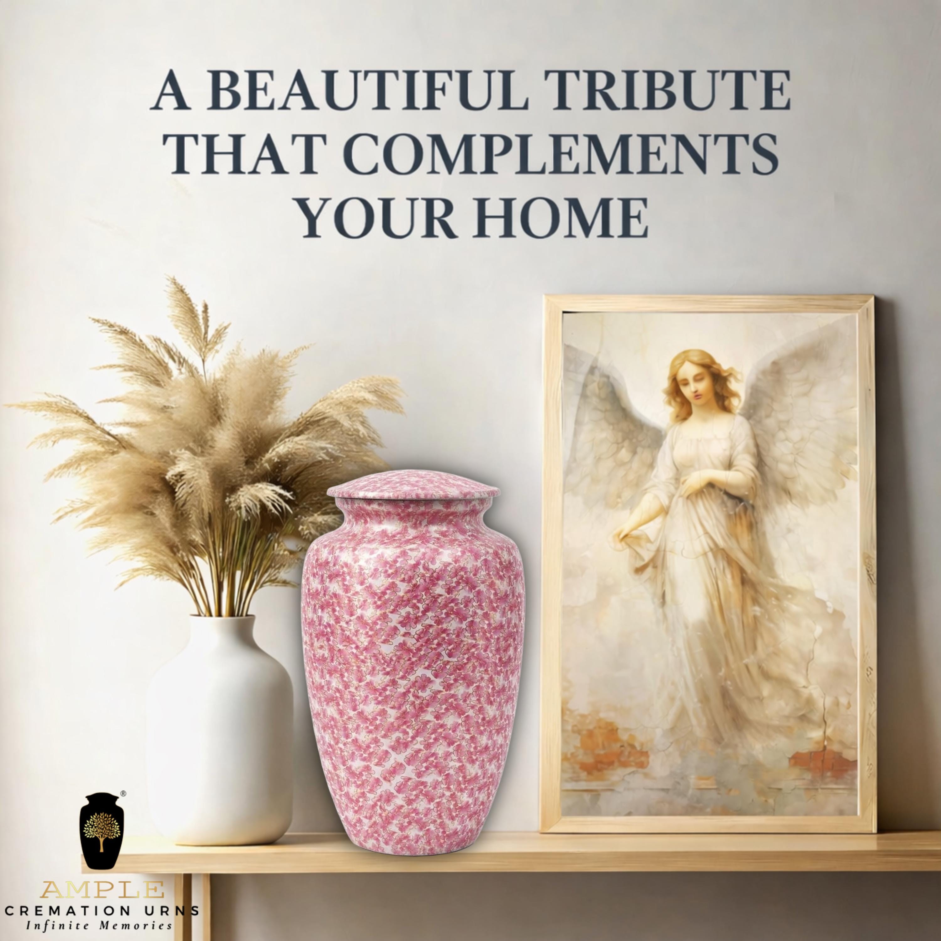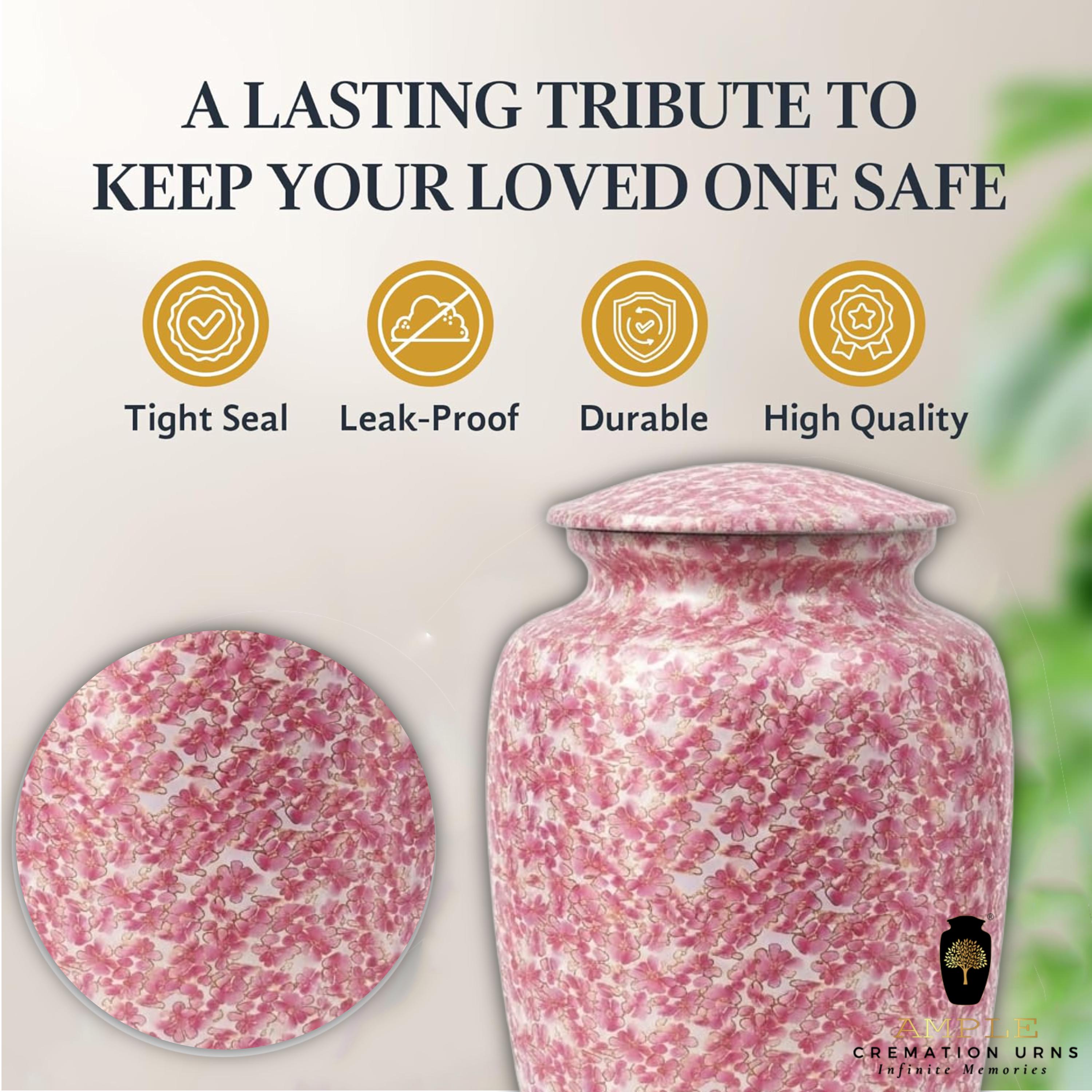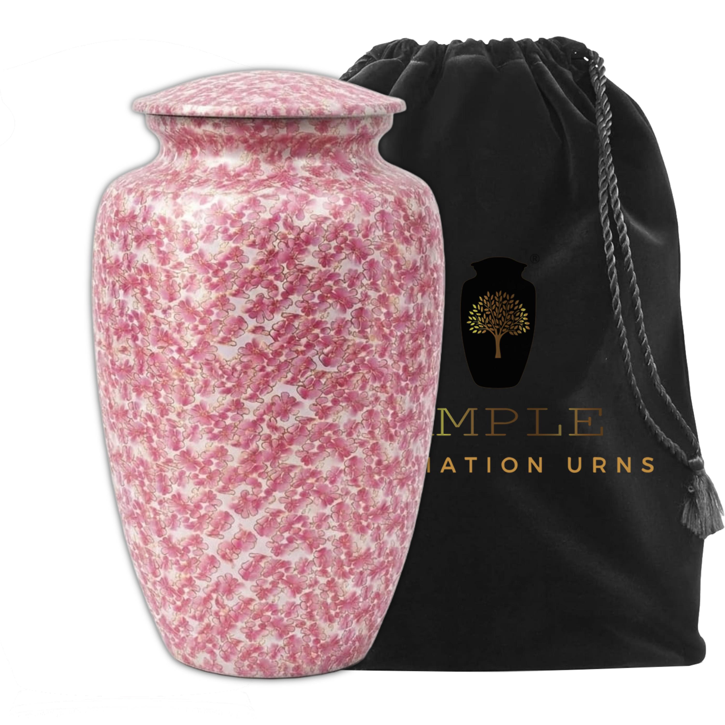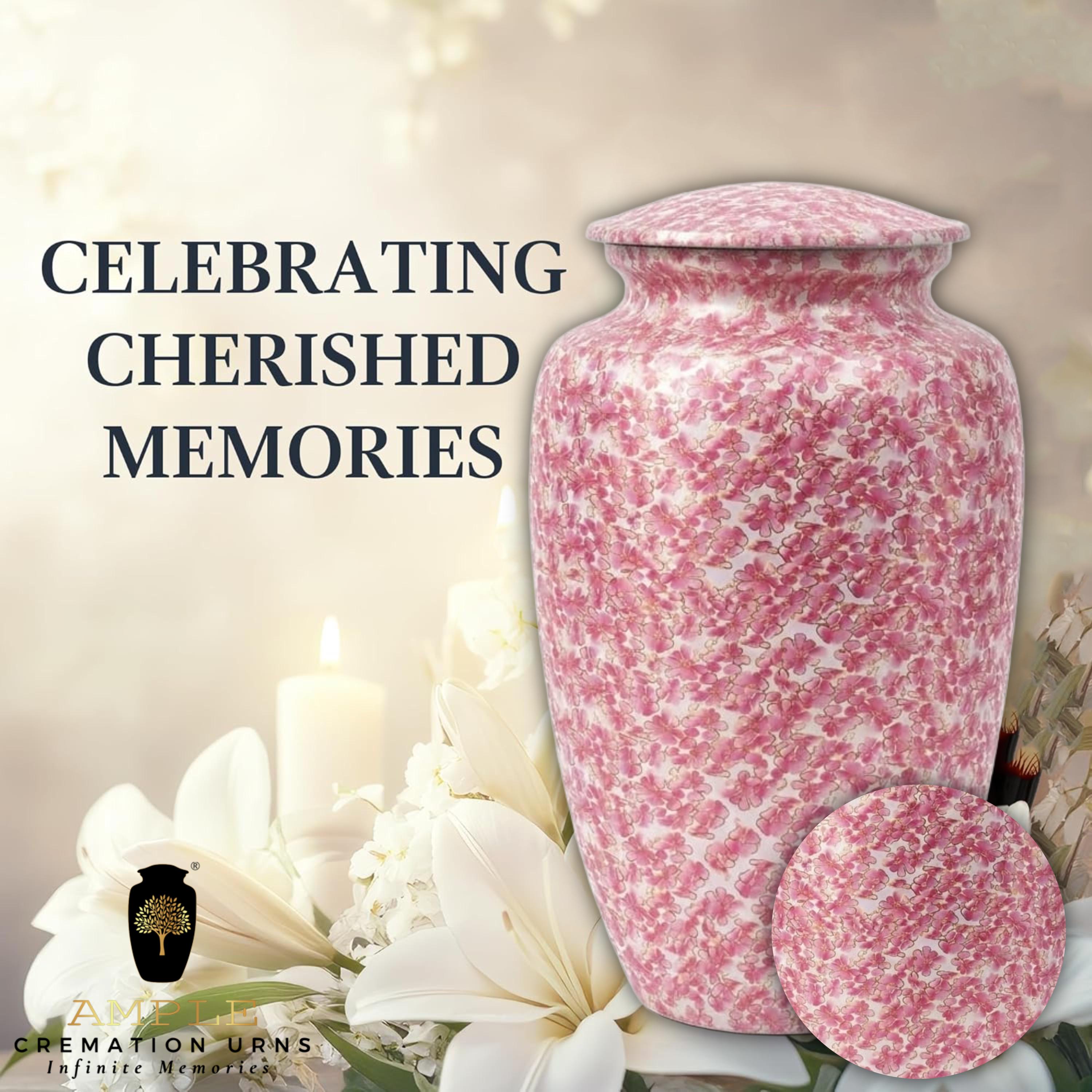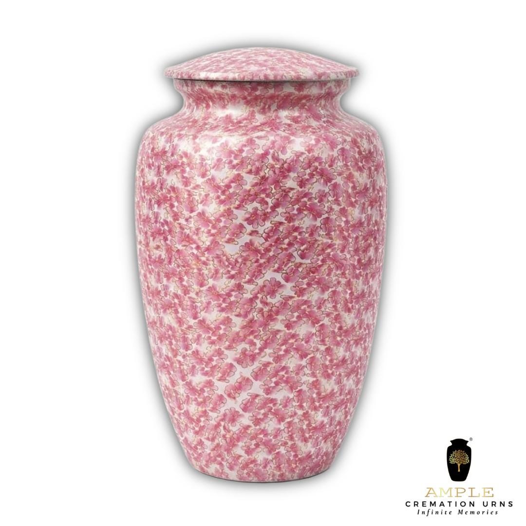 This exquisite vessel is adorned with a delicate, all-over pattern of blooming pink cherry blossoms, symbolizing the precious and fleeting nature of life. The soft pink and white floral details are accented with subtle gold outlines, creating a shimmering effect that evokes the peaceful atmosphere of a spring garden in full bloom. This urn serves as a gentle and elegant tribute for a loved one who appreciated the wonders of nature and the timeless beauty of flowers.