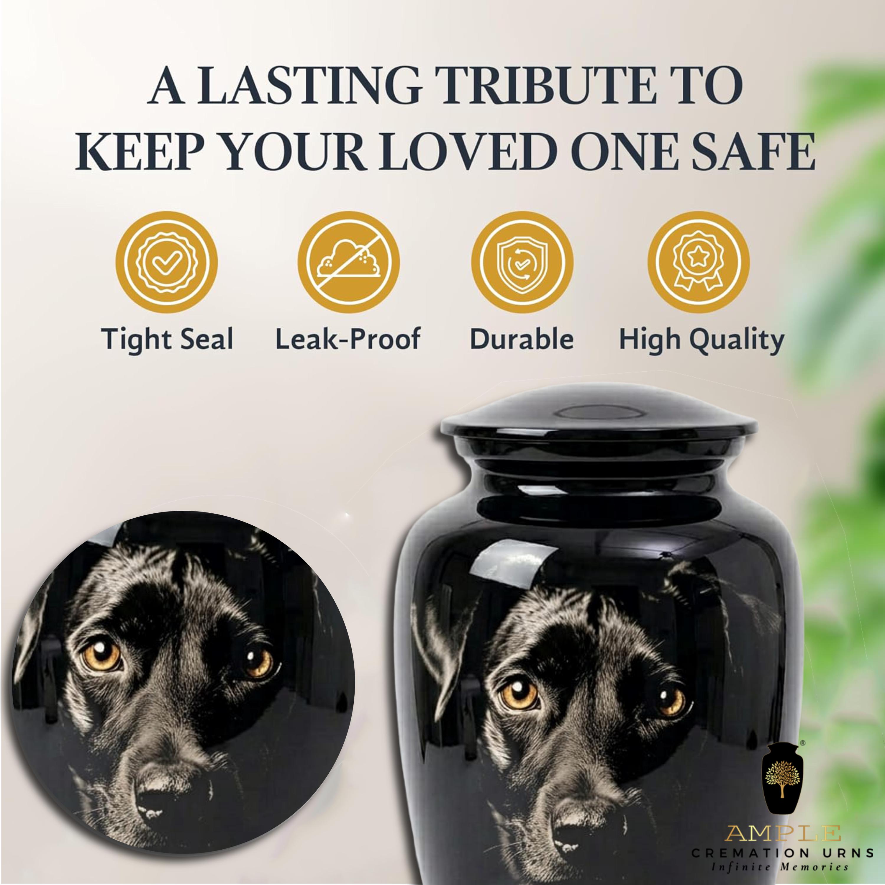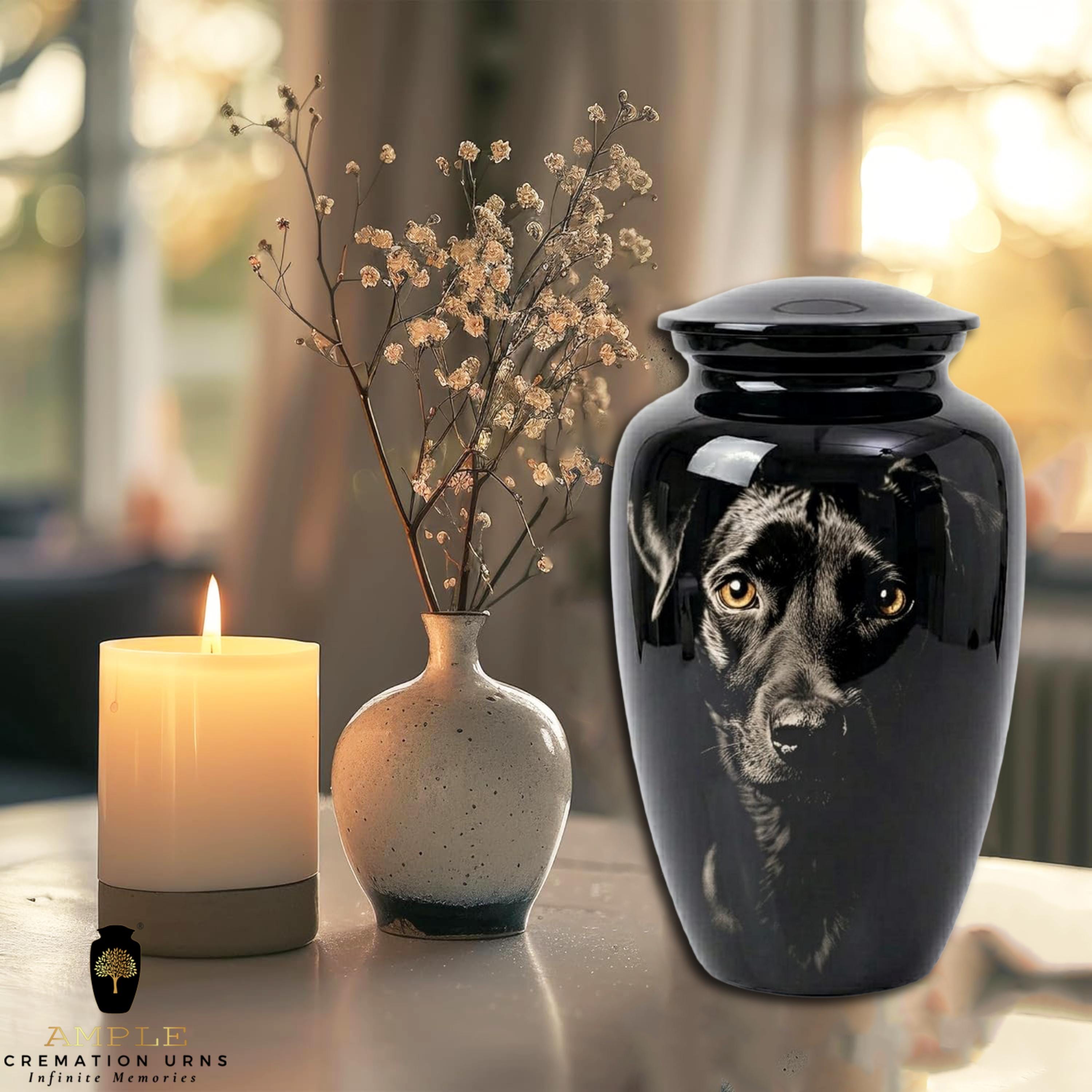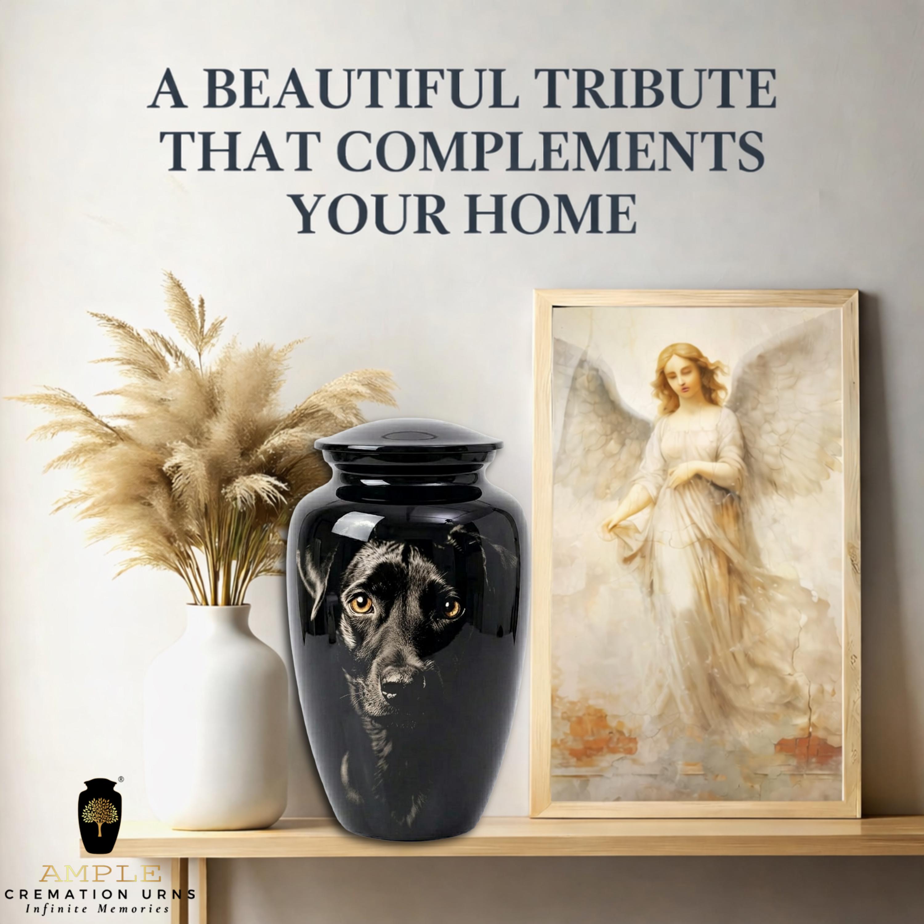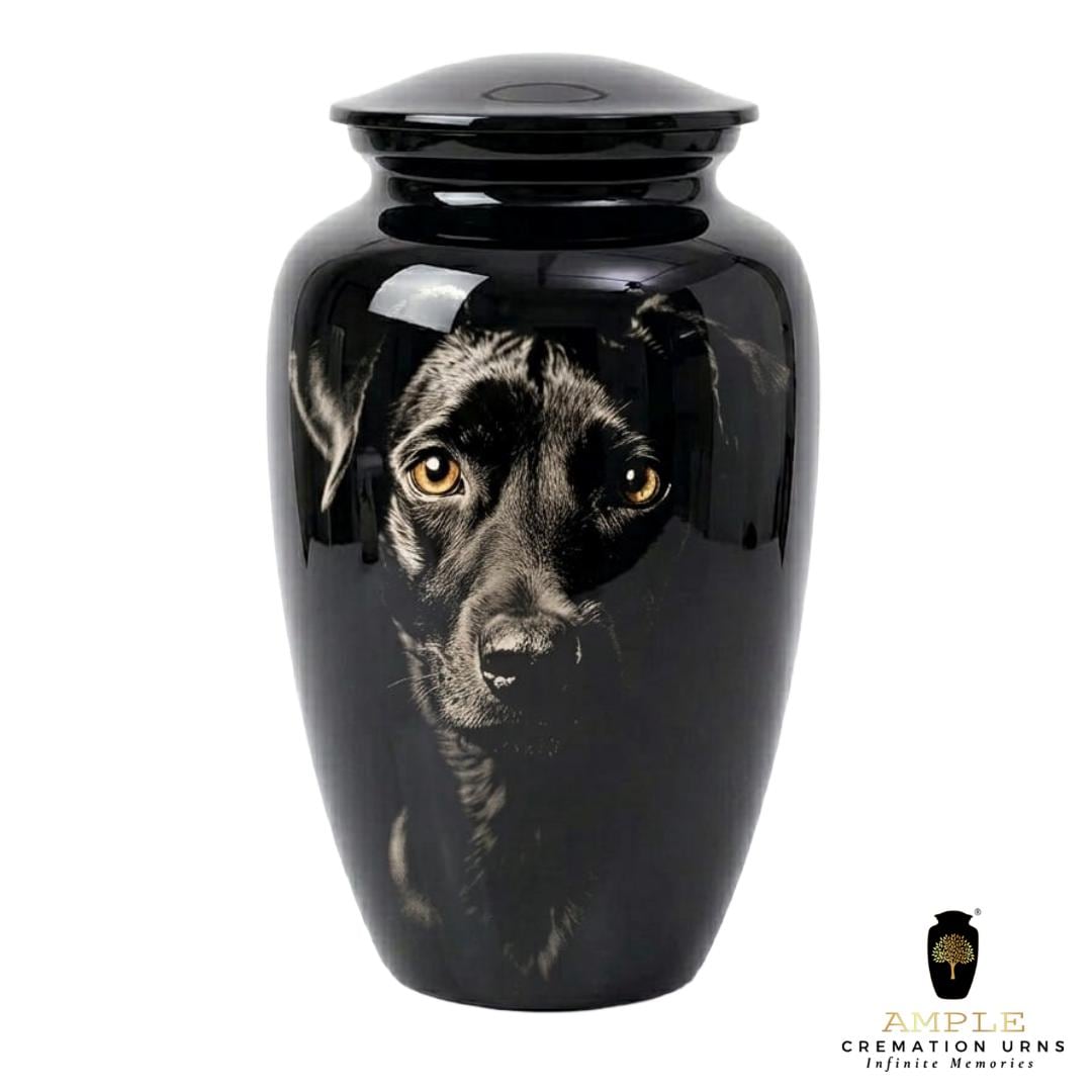 This deeply moving vessel features a realistic, monochromatic portrait of a Black Labrador Retriever emerging from a rich, high-gloss black finish. The detailed artwork focuses on the dog's soulful amber eyes and gentle expression, capturing the very essence of a faithful companion’s spirit. This urn is a perfect final resting place for a dedicated dog lover or anyone who shared a profound bond with a "loyal shadow," offering a timeless and dignified tribute to a love that remains even in the quietest moments.