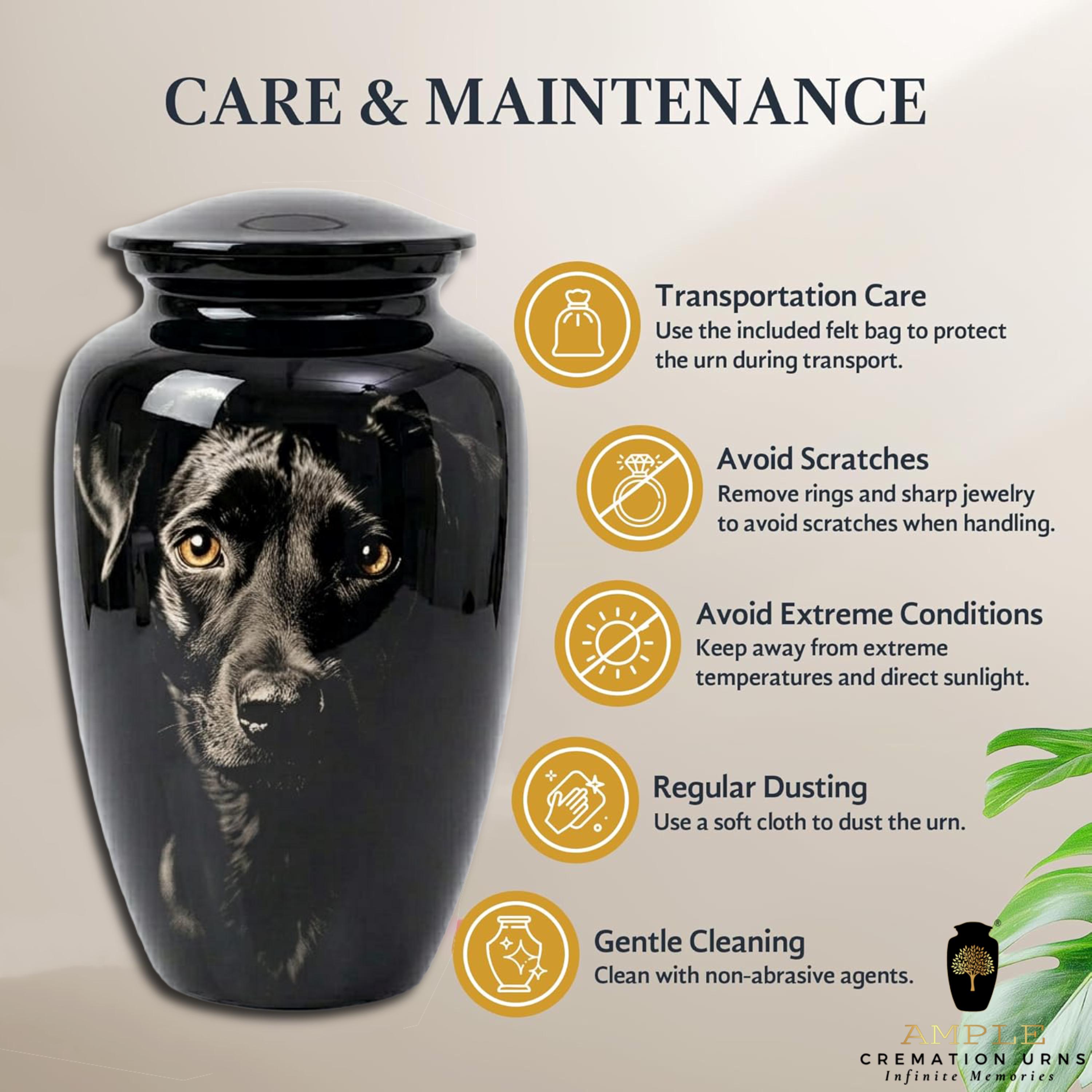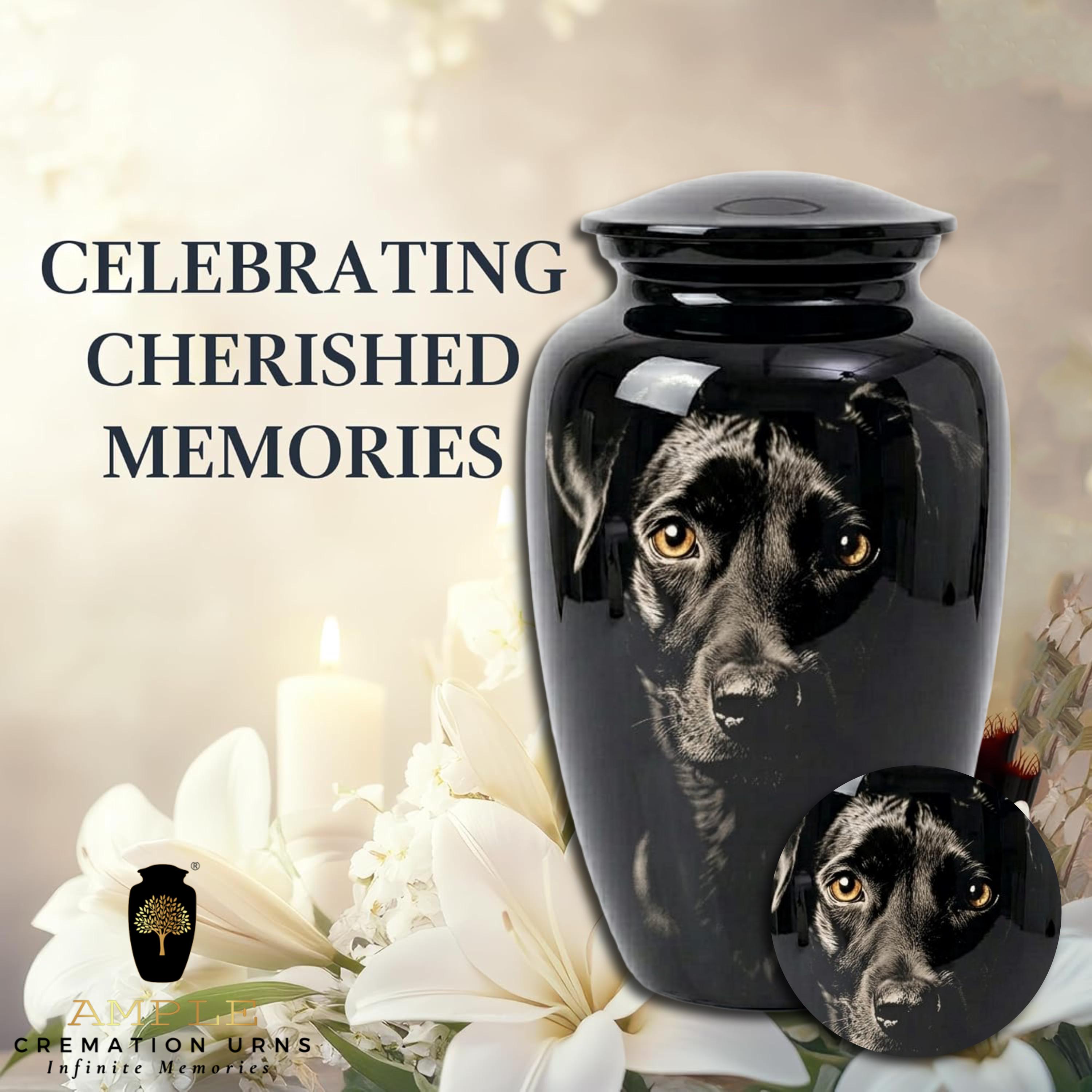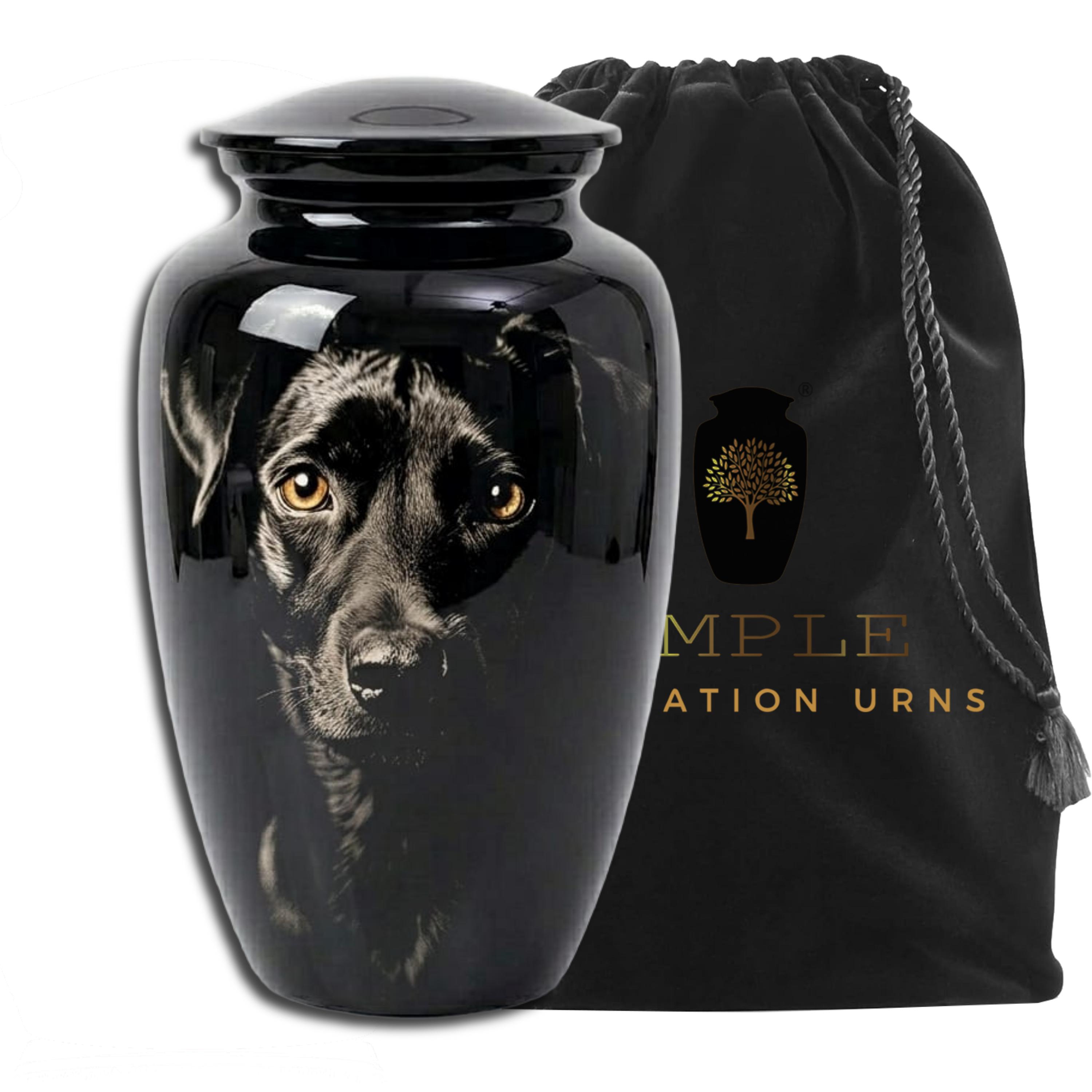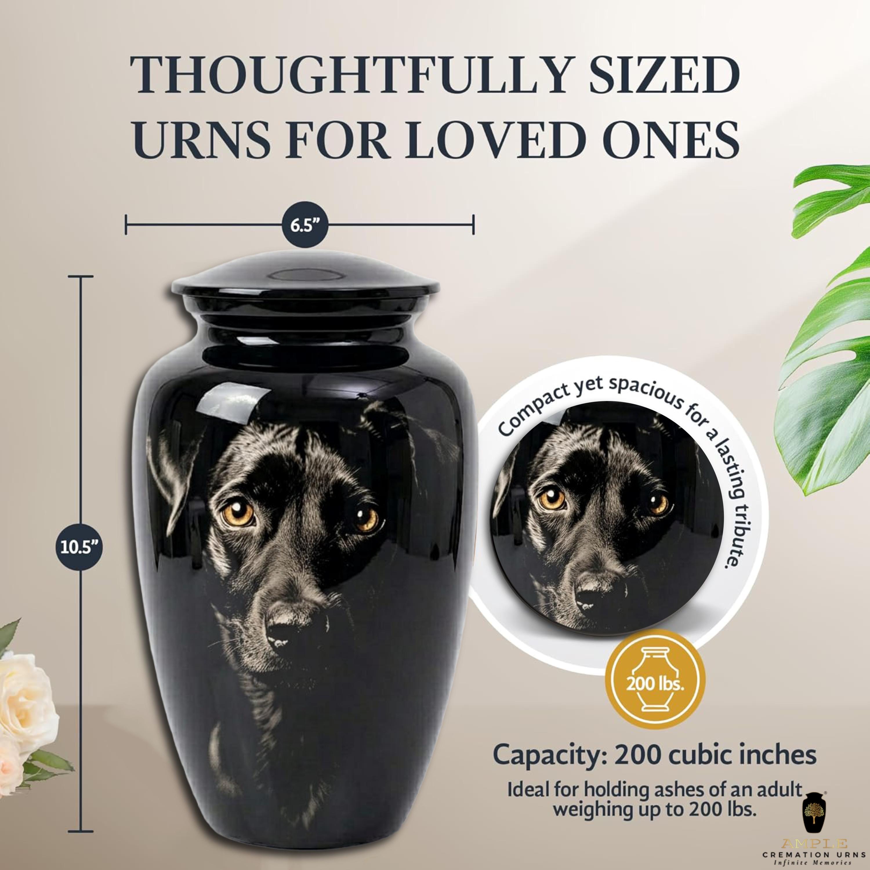 This deeply moving vessel features a realistic, monochromatic portrait of a Black Labrador Retriever emerging from a rich, high-gloss black finish. The detailed artwork focuses on the dog's soulful amber eyes and gentle expression, capturing the very essence of a faithful companion’s spirit. This urn is a perfect final resting place for a dedicated dog lover or anyone who shared a profound bond with a "loyal shadow," offering a timeless and dignified tribute to a love that remains even in the quietest moments.