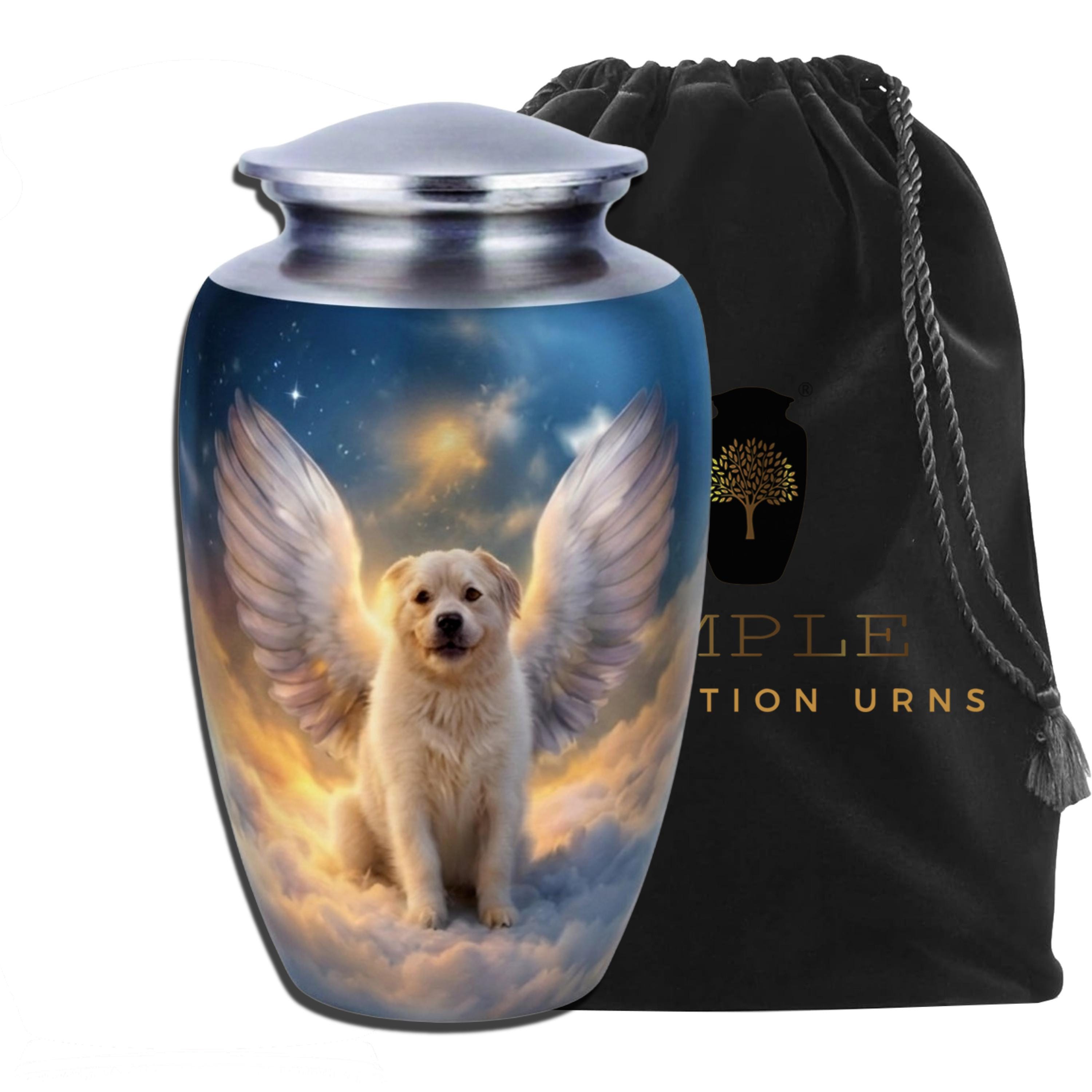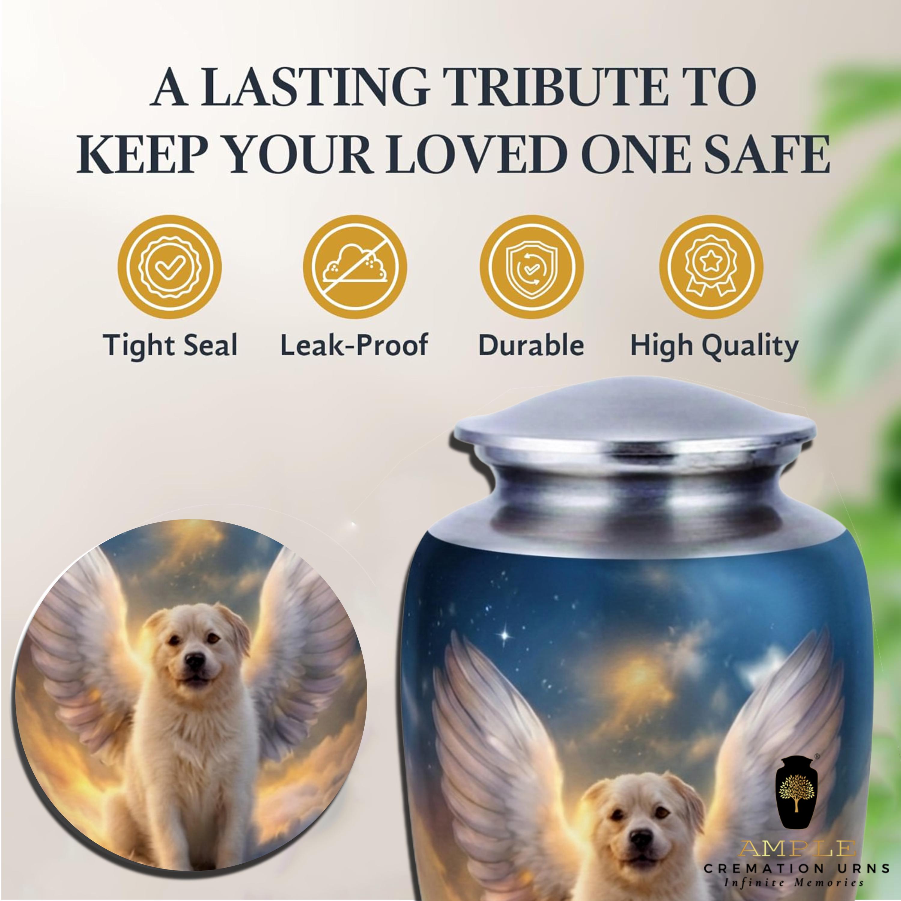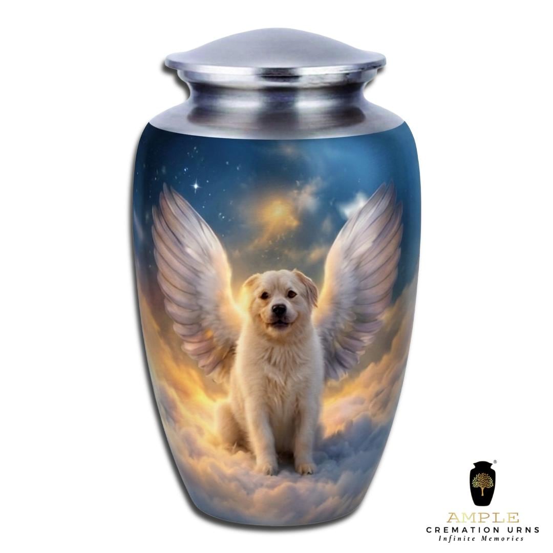 This moving vessel features a serene, high-definition portrait of a white Golden Retriever puppy sitting peacefully among ethereal clouds, adorned with majestic white angel wings. Radiant stars and a warm celestial glow break through the twilight sky, symbolizing the timeless bond and the divine peace of a faithful friend watching over you from above. Rendered on a beautiful brushed blue metal finish, this urn serves as a comforting final resting place for a devoted pet lover or a family wishing to honor the angelic joy their companion brought into their lives.