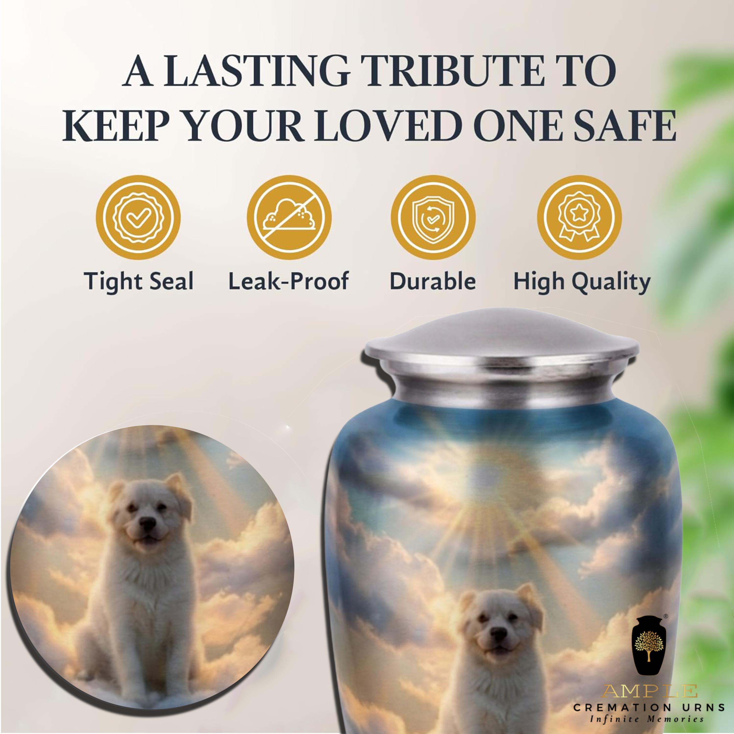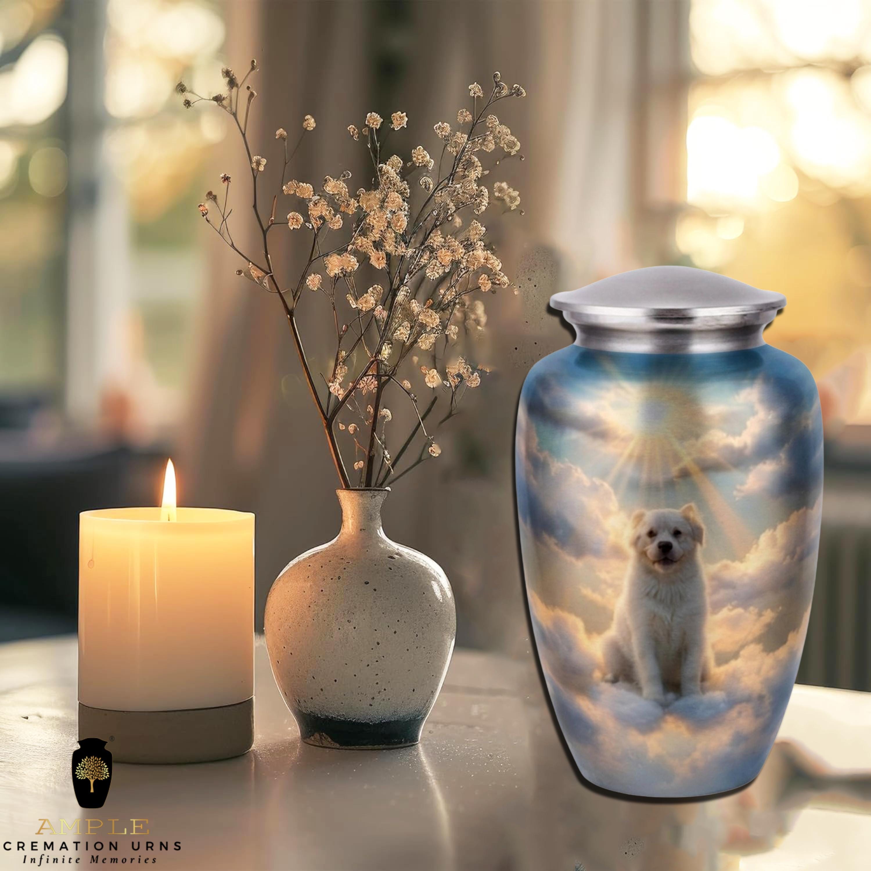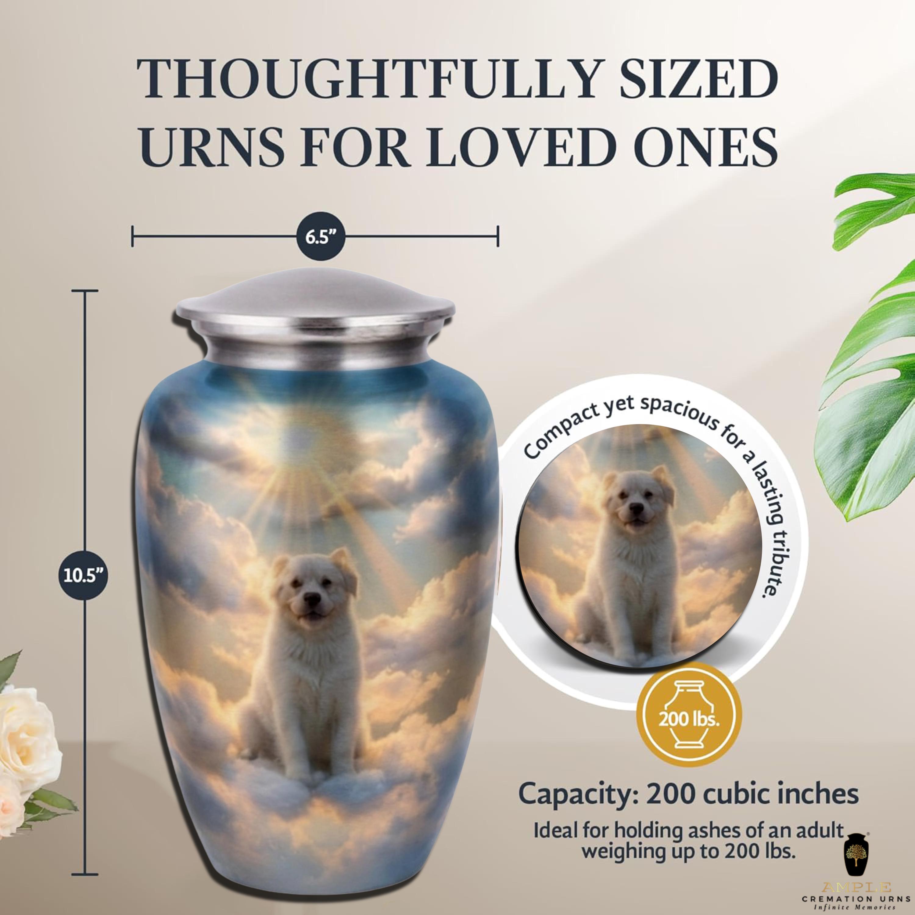 This moving vessel features a serene, high-definition portrait of a white Golden Retriever puppy sitting peacefully among ethereal clouds. Radiant sunbeams break through the celestial sky, symbolizing hope, peace, and the timeless bond shared with a faithful friend who has crossed the rainbow bridge. Rendered on a beautiful brushed blue metal finish, this urn serves as a comforting final resting place for a devoted pet lover or a family wishing to honor the divine joy their companion brought into their lives.