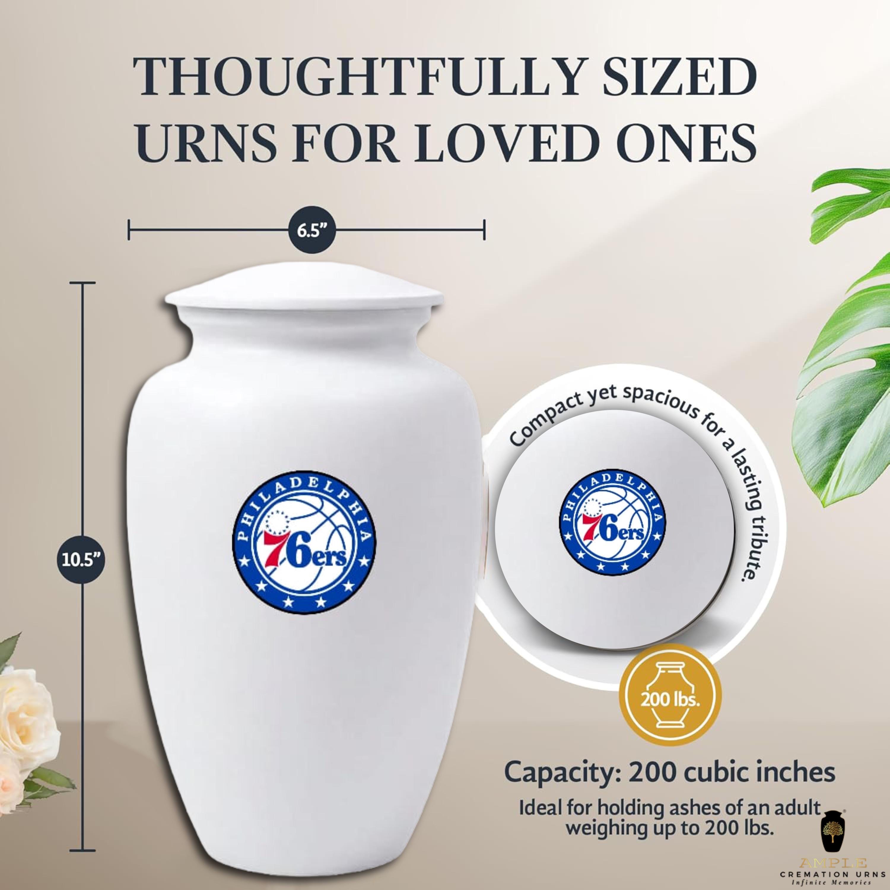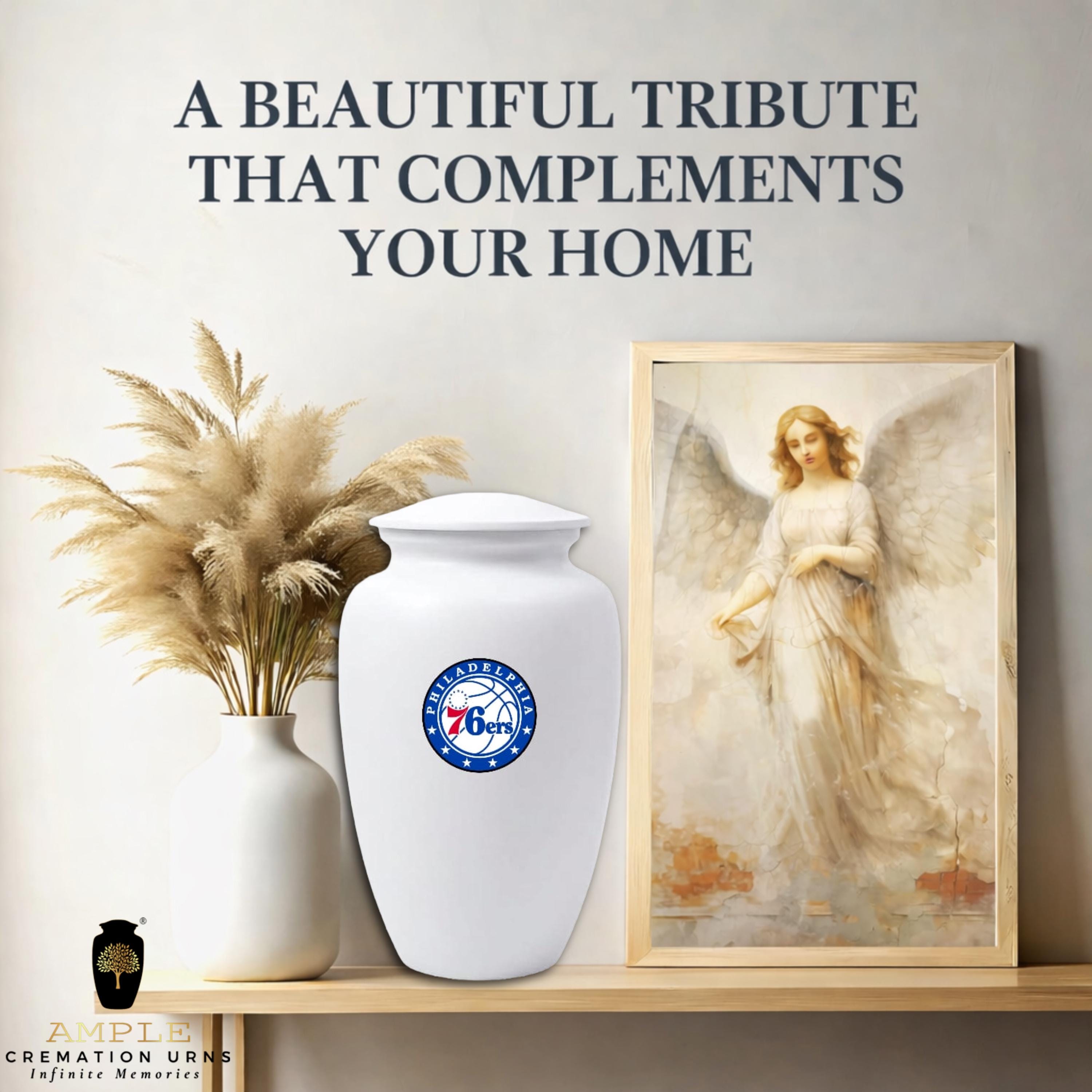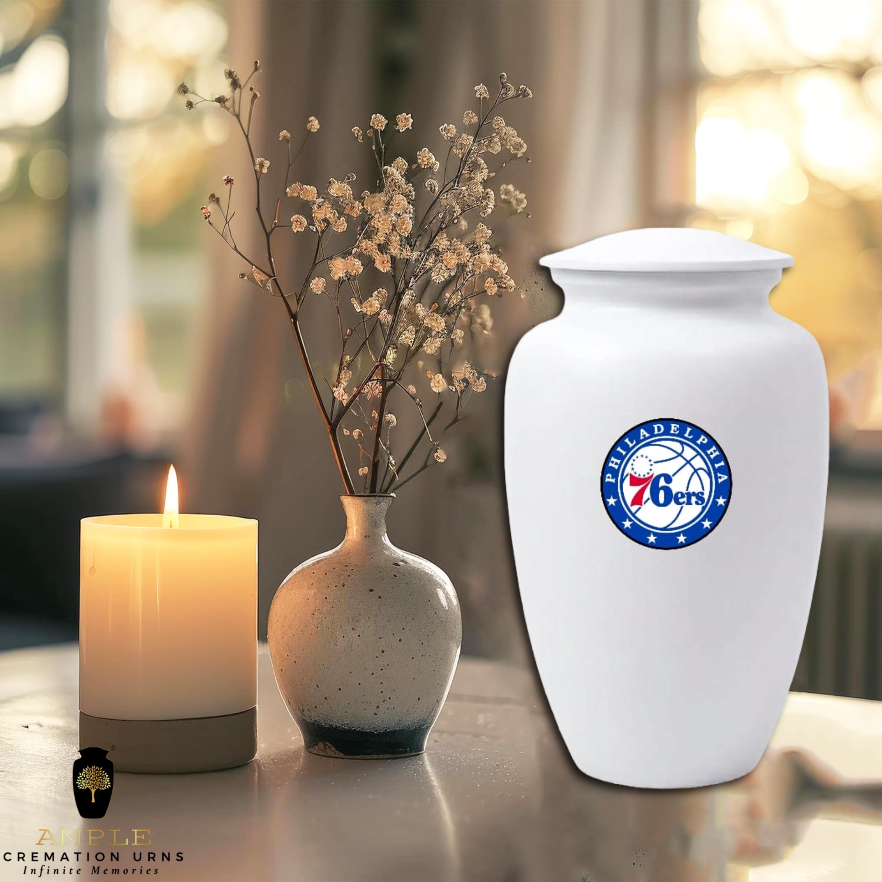This clean and striking vessel features the iconic Philadelphia 76ers logo centered on a pristine, high-gloss white finish. Symbolizing the unwavering dedication of a true fan, this urn serves as a powerful tribute to those whose hearts beat for the spirit of competition and the heritage of Philadelphia basketball. Crafted with a timeless silhouette, it is a dignified final resting place for a devoted supporter who carried their team pride throughout their life.