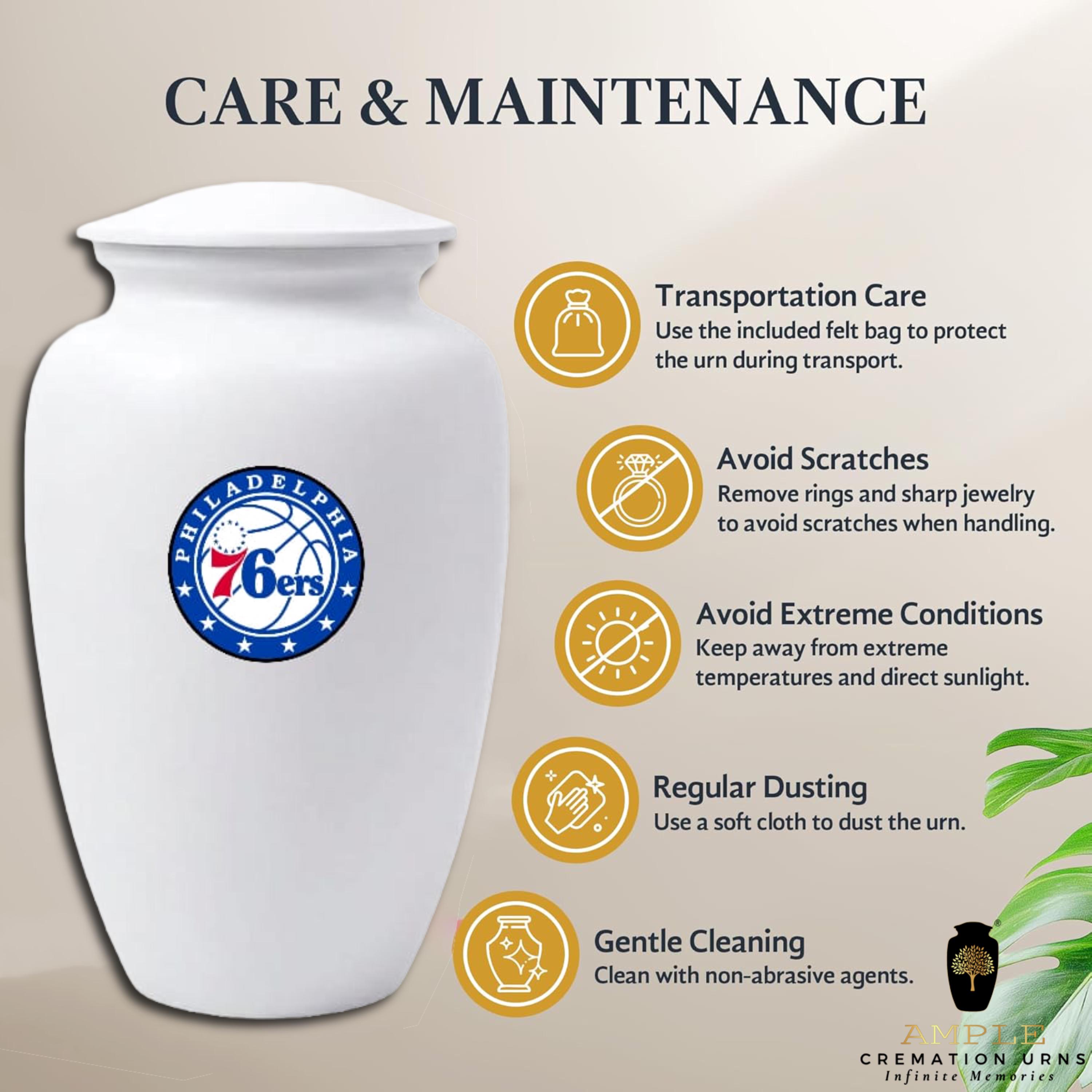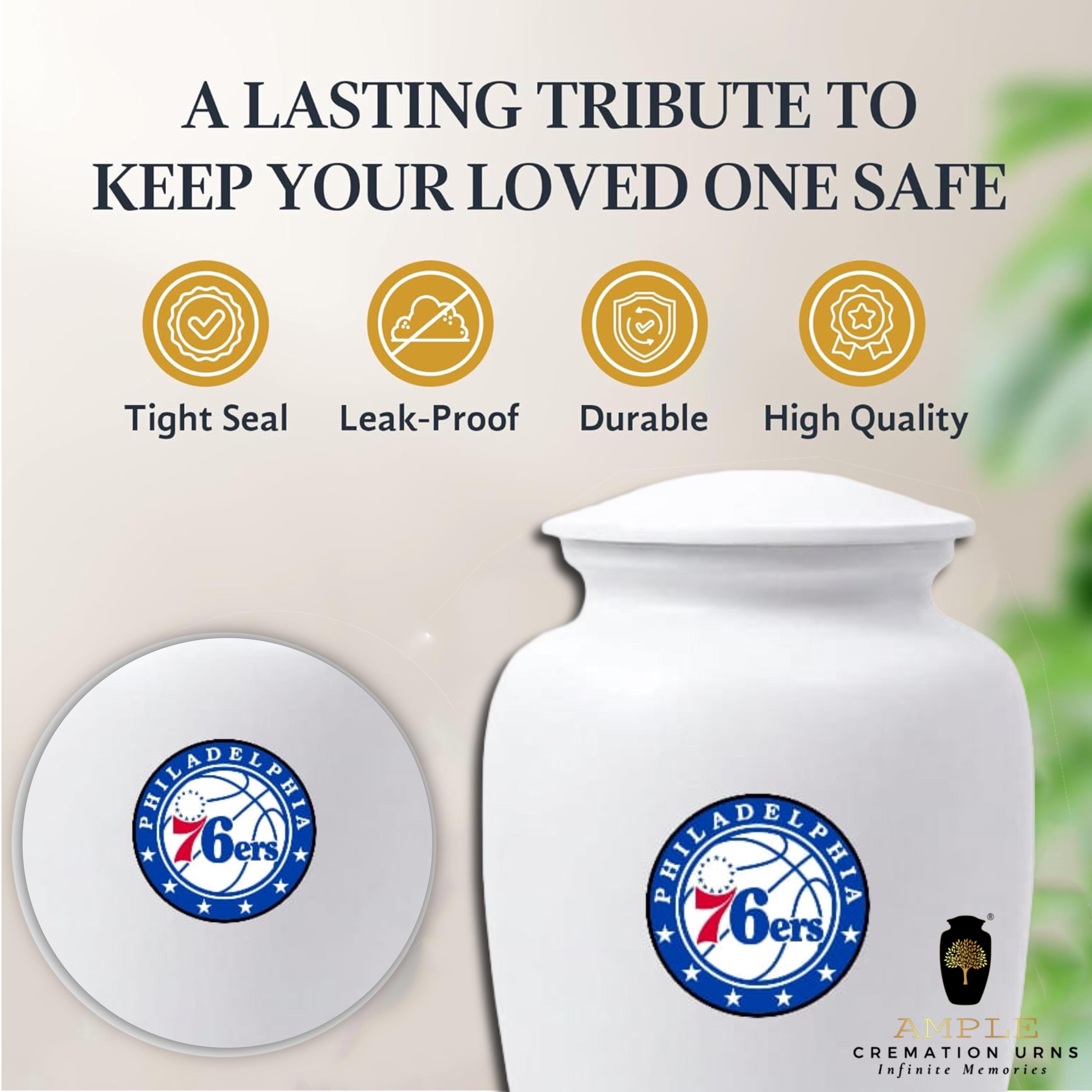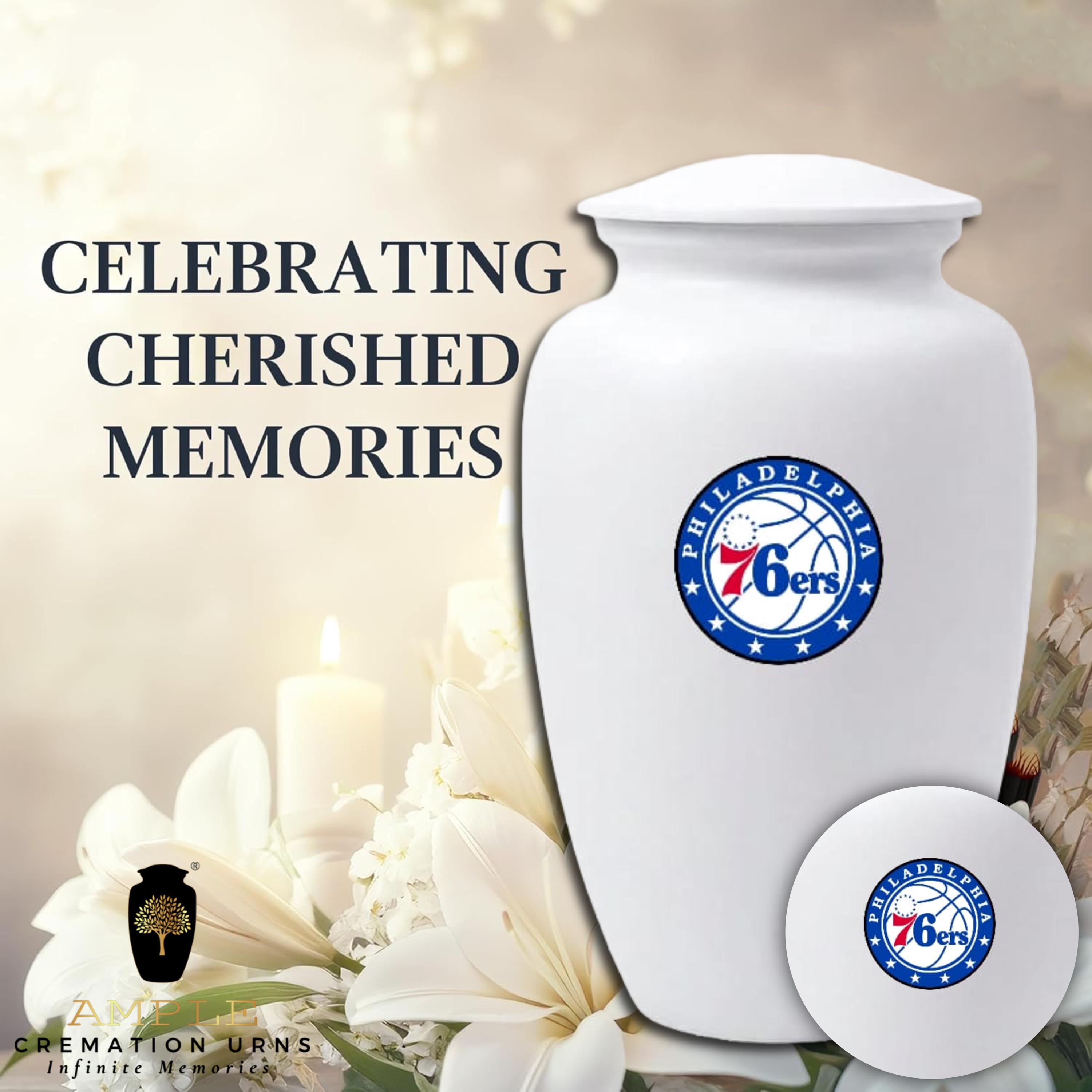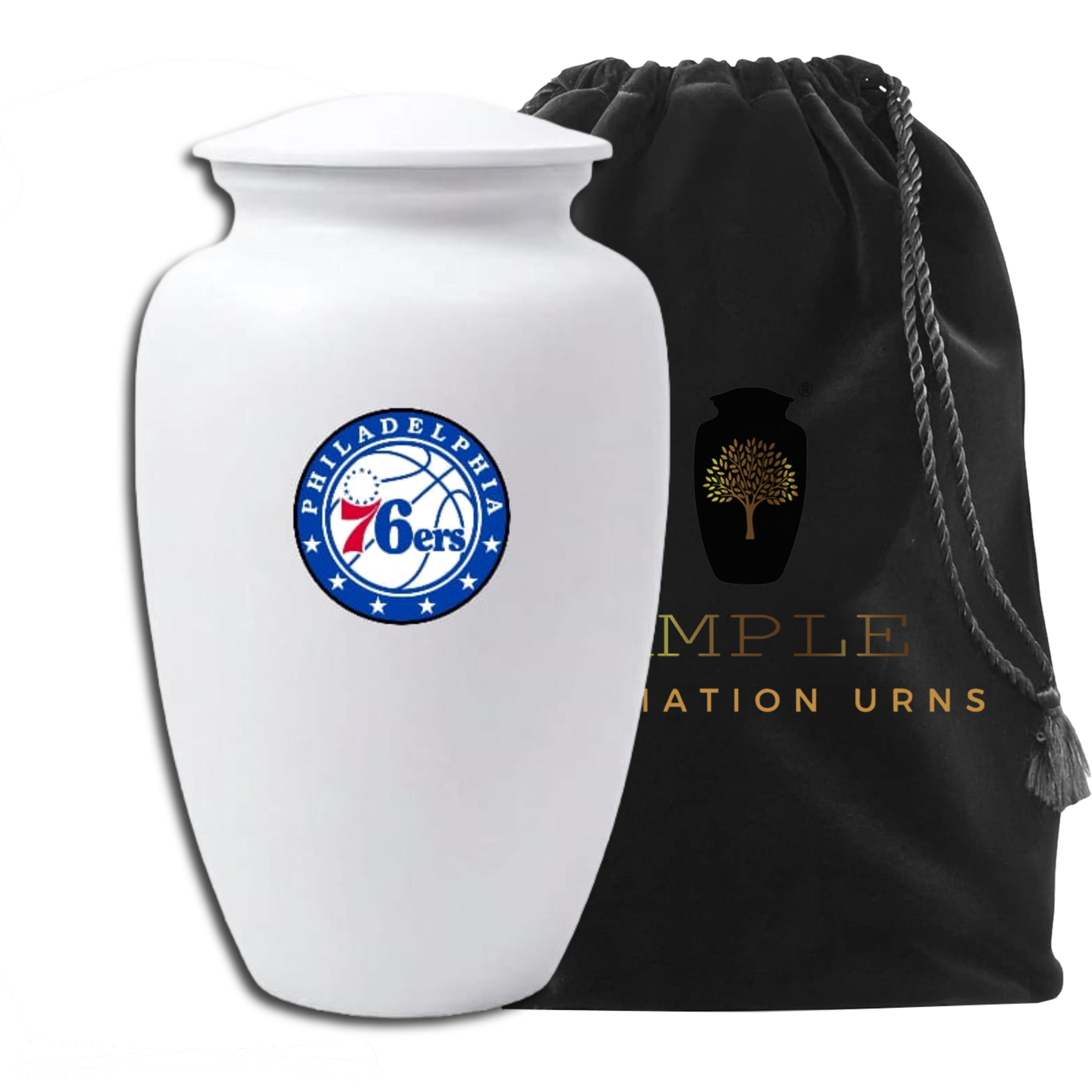 This clean and striking vessel features the iconic Philadelphia 76ers logo centered on a pristine, high-gloss white finish. Symbolizing the unwavering dedication of a true fan, this urn serves as a powerful tribute to those whose hearts beat for the spirit of competition and the heritage of Philadelphia basketball. Crafted with a timeless silhouette, it is a dignified final resting place for a devoted supporter who carried their team pride throughout their life.