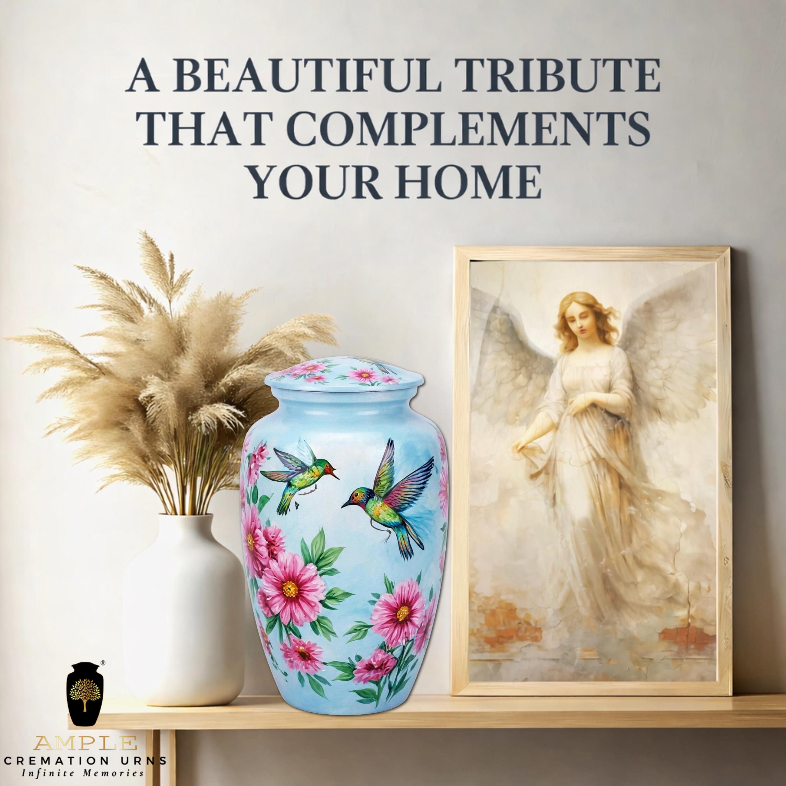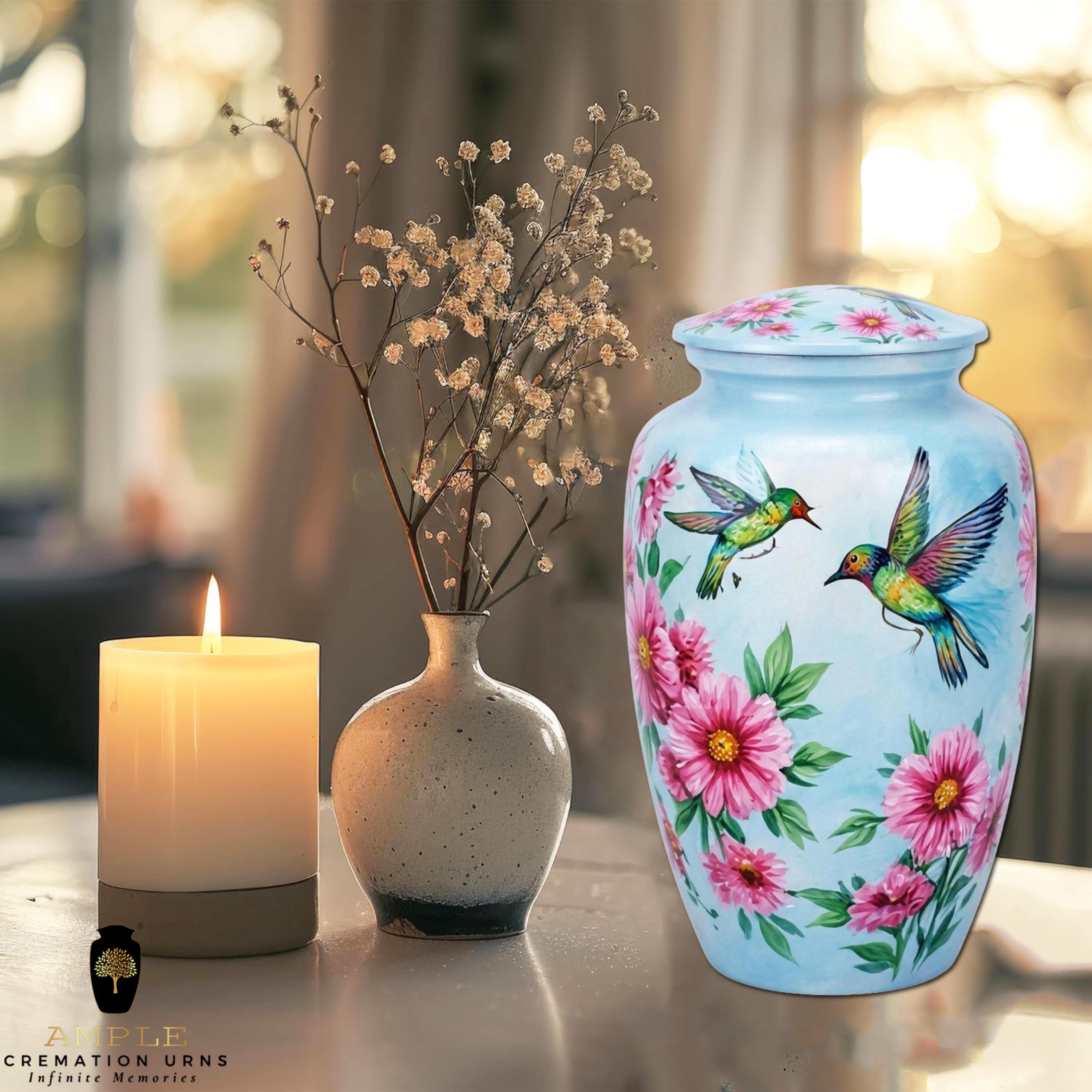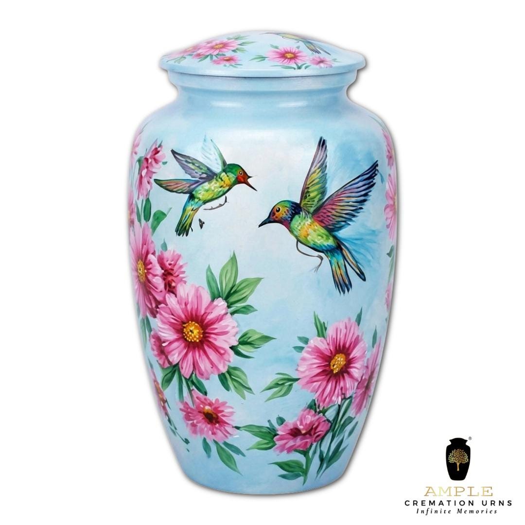 This stunning and uplifting vessel features two vibrant hummingbirds in mid-flight, their iridescent feathers captured in a dance of light and color. They are surrounded by lush, blooming pink flowers, all set against a soft, sky-blue background that evokes a peaceful day in a garden sanctuary. This artistic scene serves as a dignified final resting place for a soul who brought brightness and grace to the lives of many, mirroring the fleeting yet unforgettable presence of these extraordinary birds.