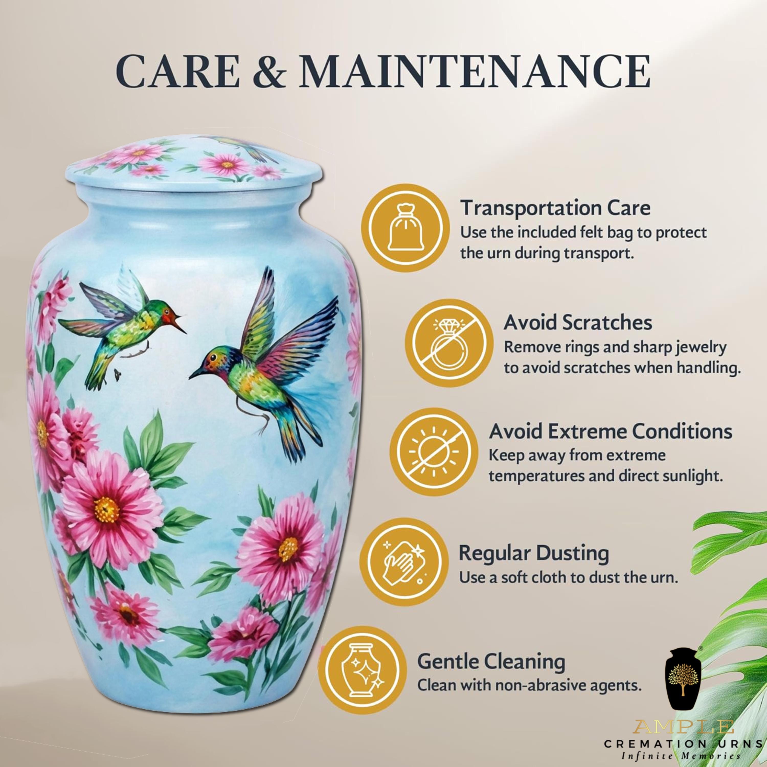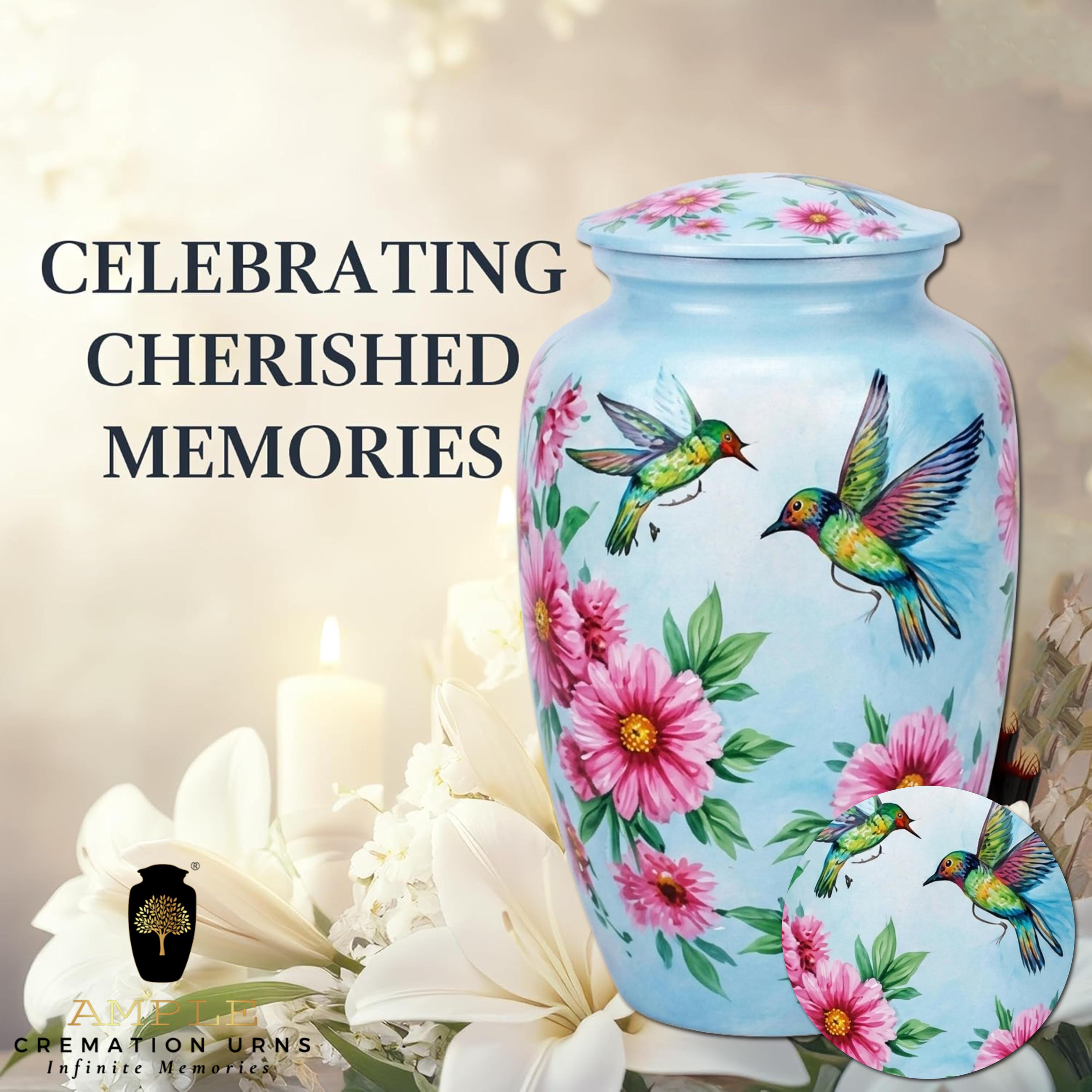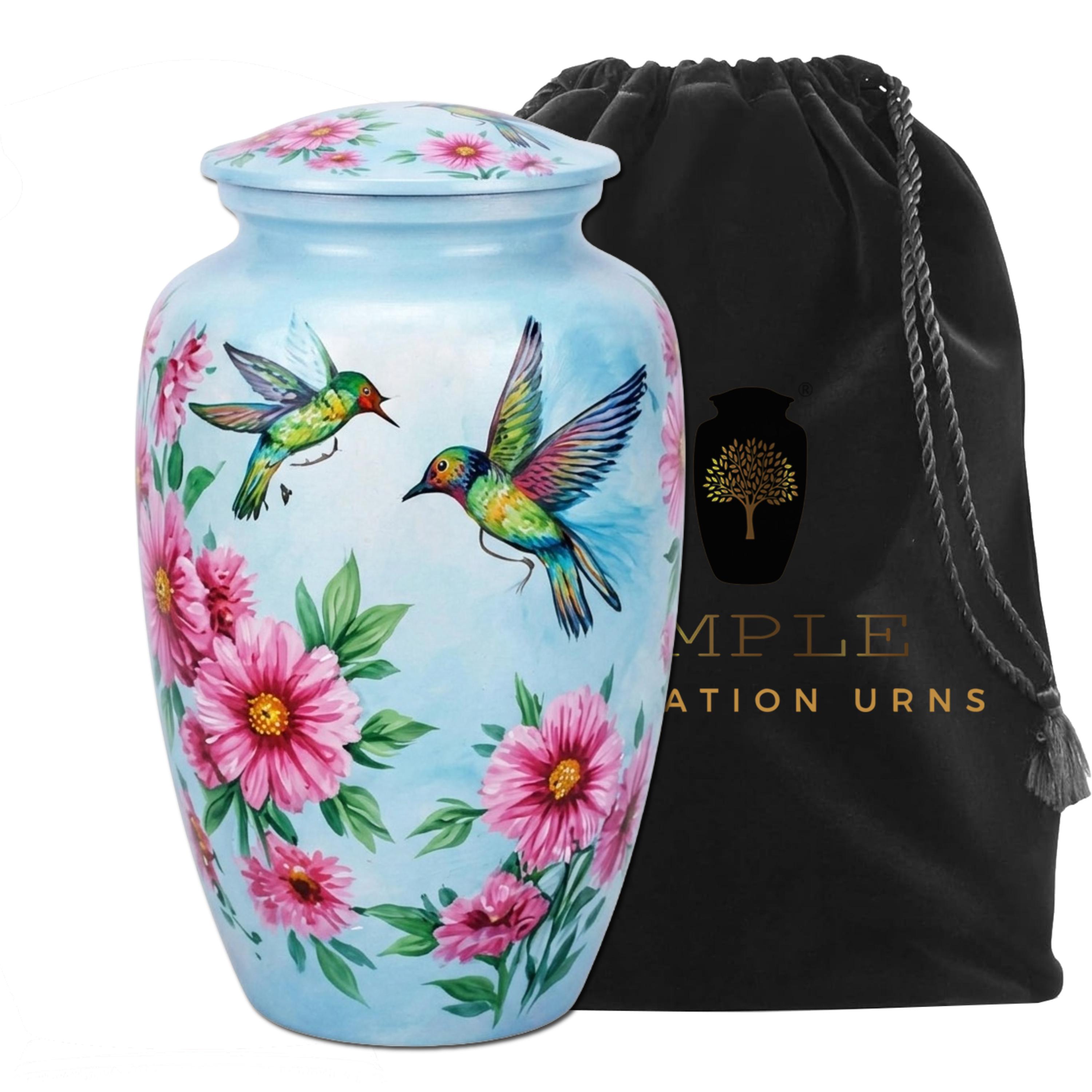 This stunning and uplifting vessel features two vibrant hummingbirds in mid-flight, their iridescent feathers captured in a dance of light and color. They are surrounded by lush, blooming pink flowers, all set against a soft, sky-blue background that evokes a peaceful day in a garden sanctuary. This artistic scene serves as a dignified final resting place for a soul who brought brightness and grace to the lives of many, mirroring the fleeting yet unforgettable presence of these extraordinary birds.