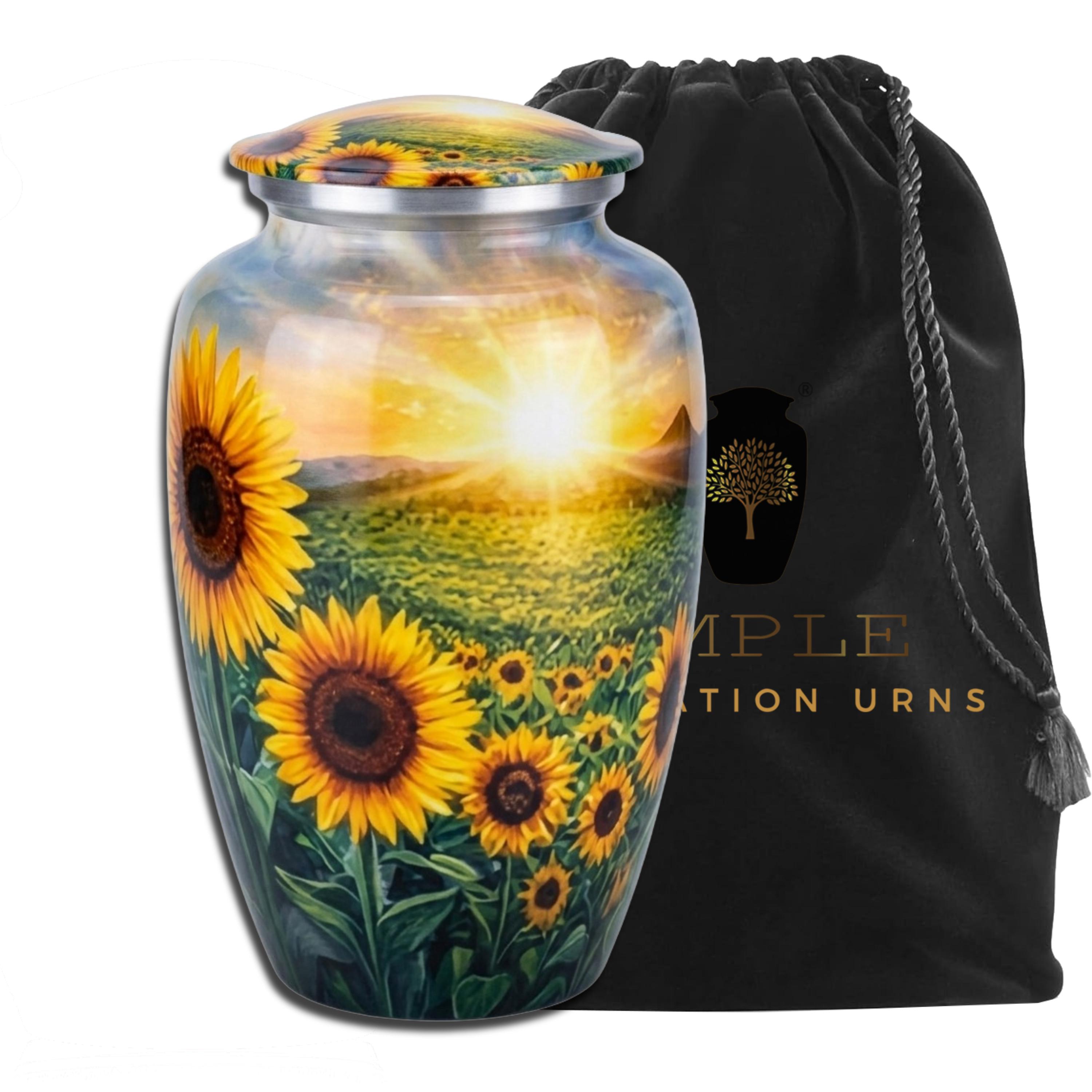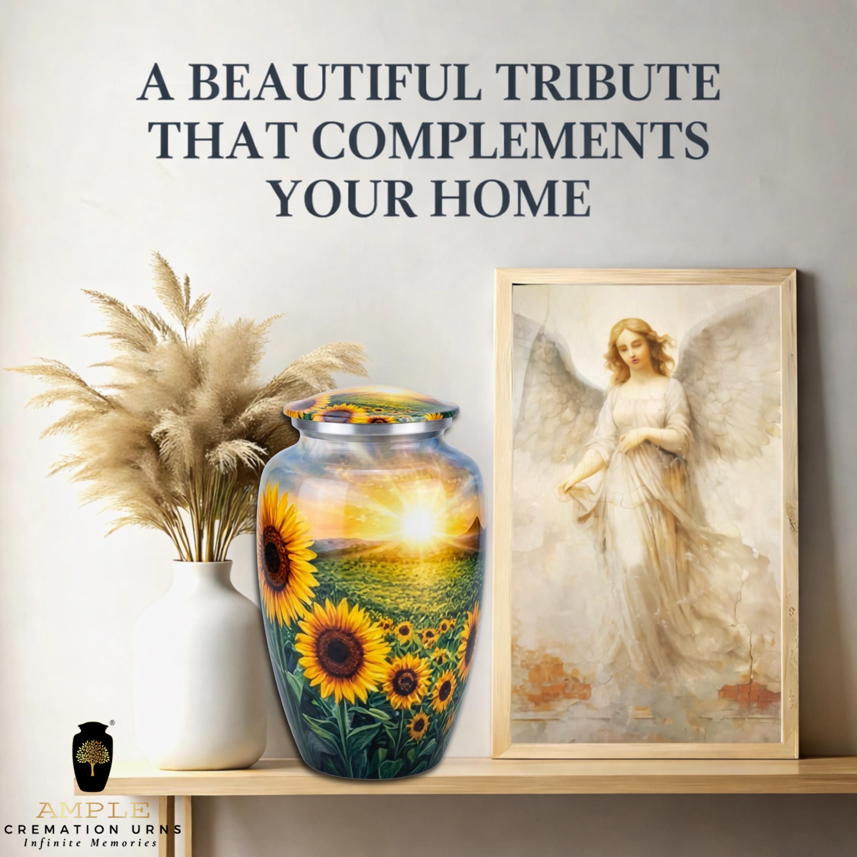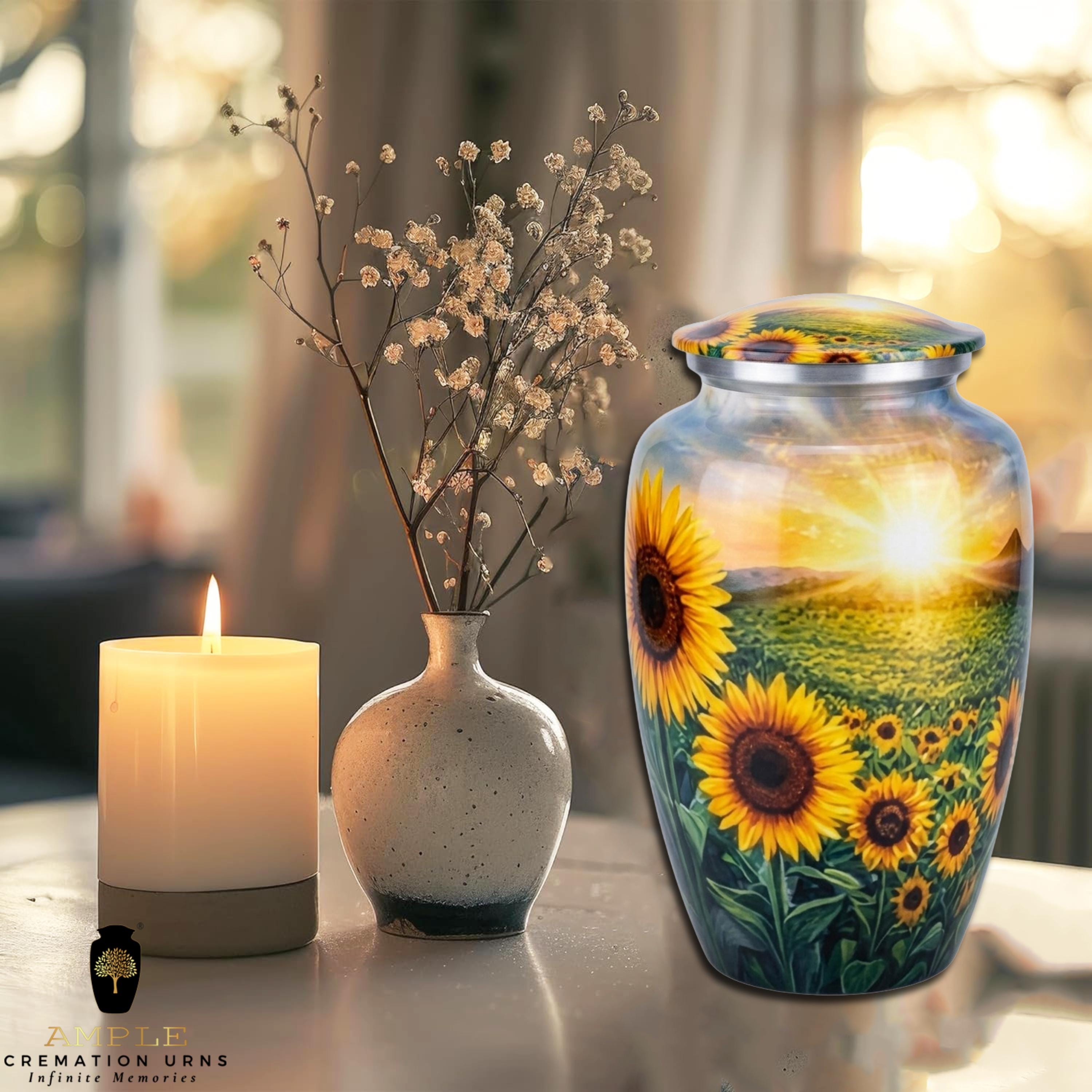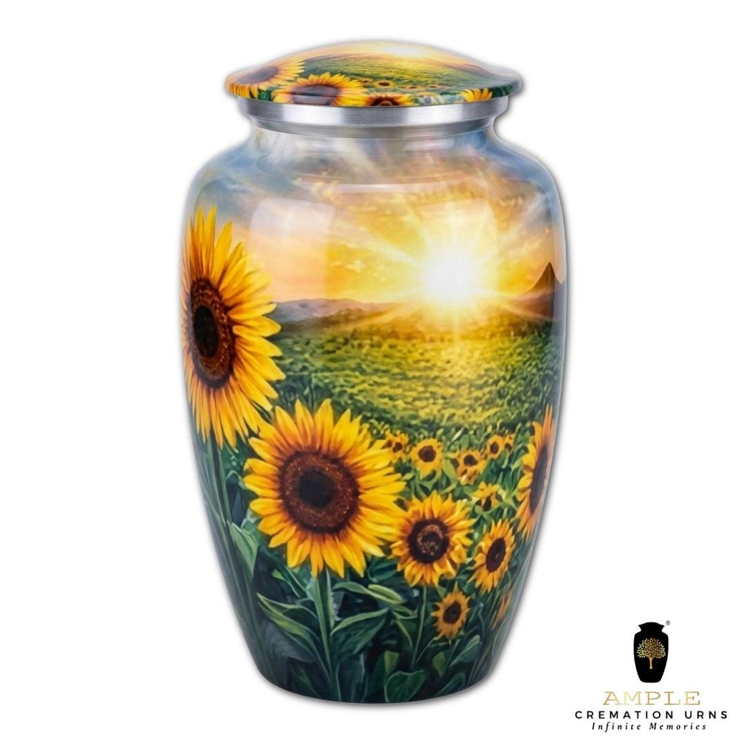 This breathtaking vessel features a panoramic scene of a flourishing sunflower field under the glow of a brilliant rising sun. The towering sunflowers, known for following the light, symbolize loyalty, adoration, and the enduring power of happiness. Set against a serene landscape of rolling hills and a sun-drenched horizon, this artistic tribute serves as a dignified final resting place for a soul who brought light and joy to every room they entered.