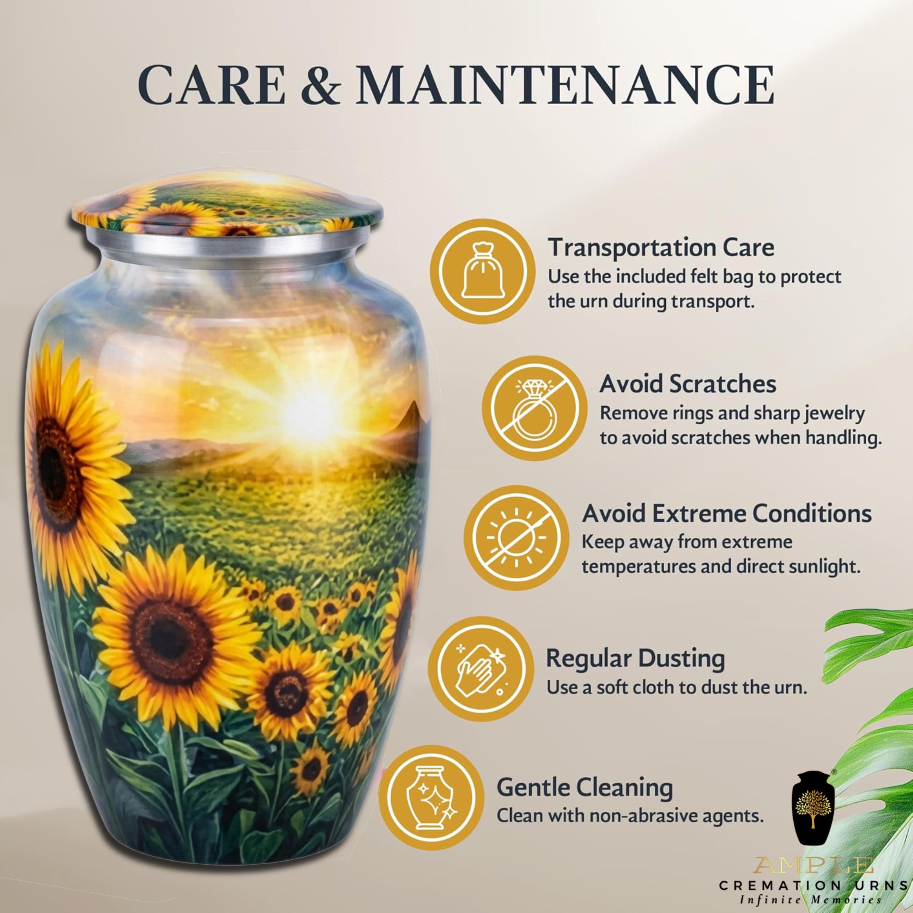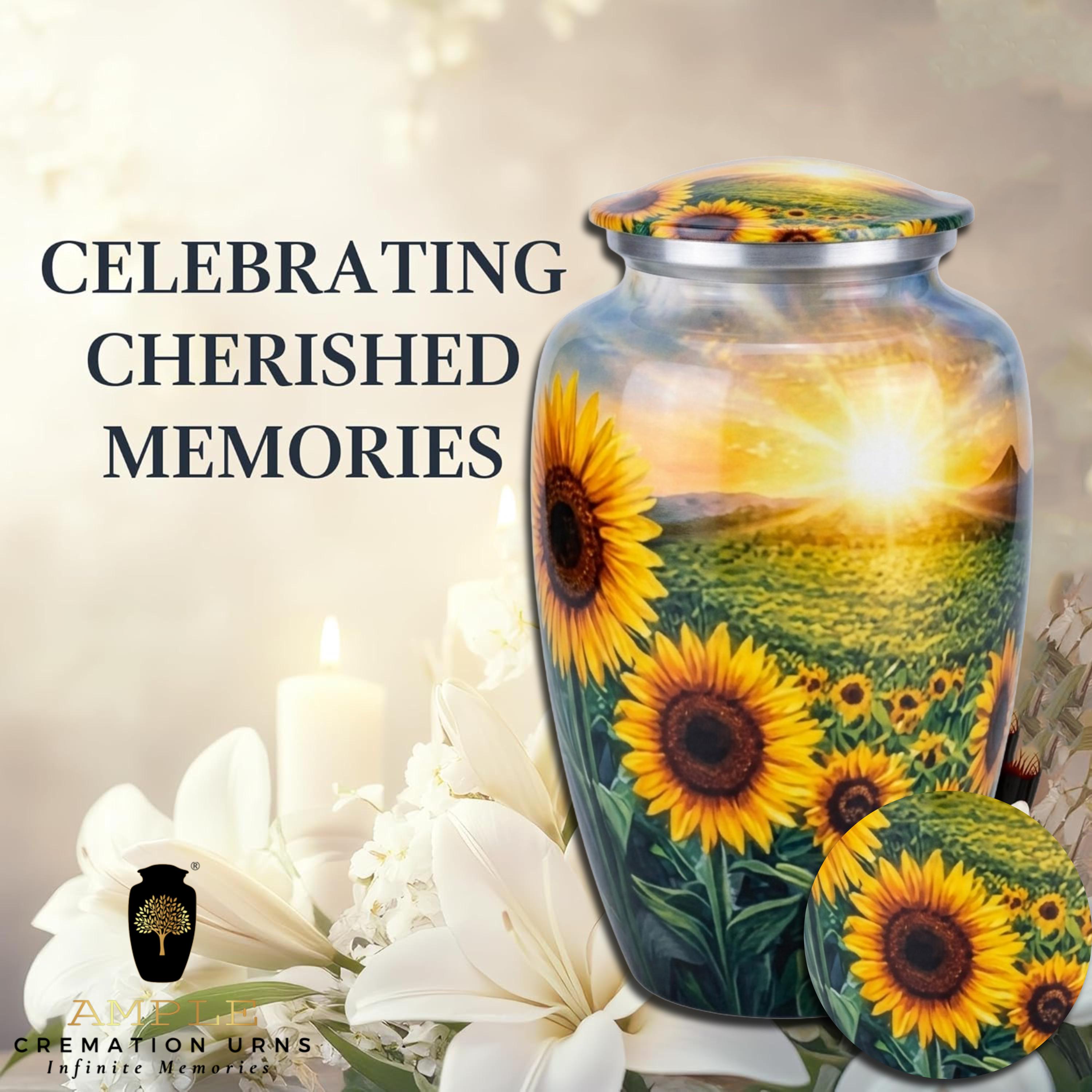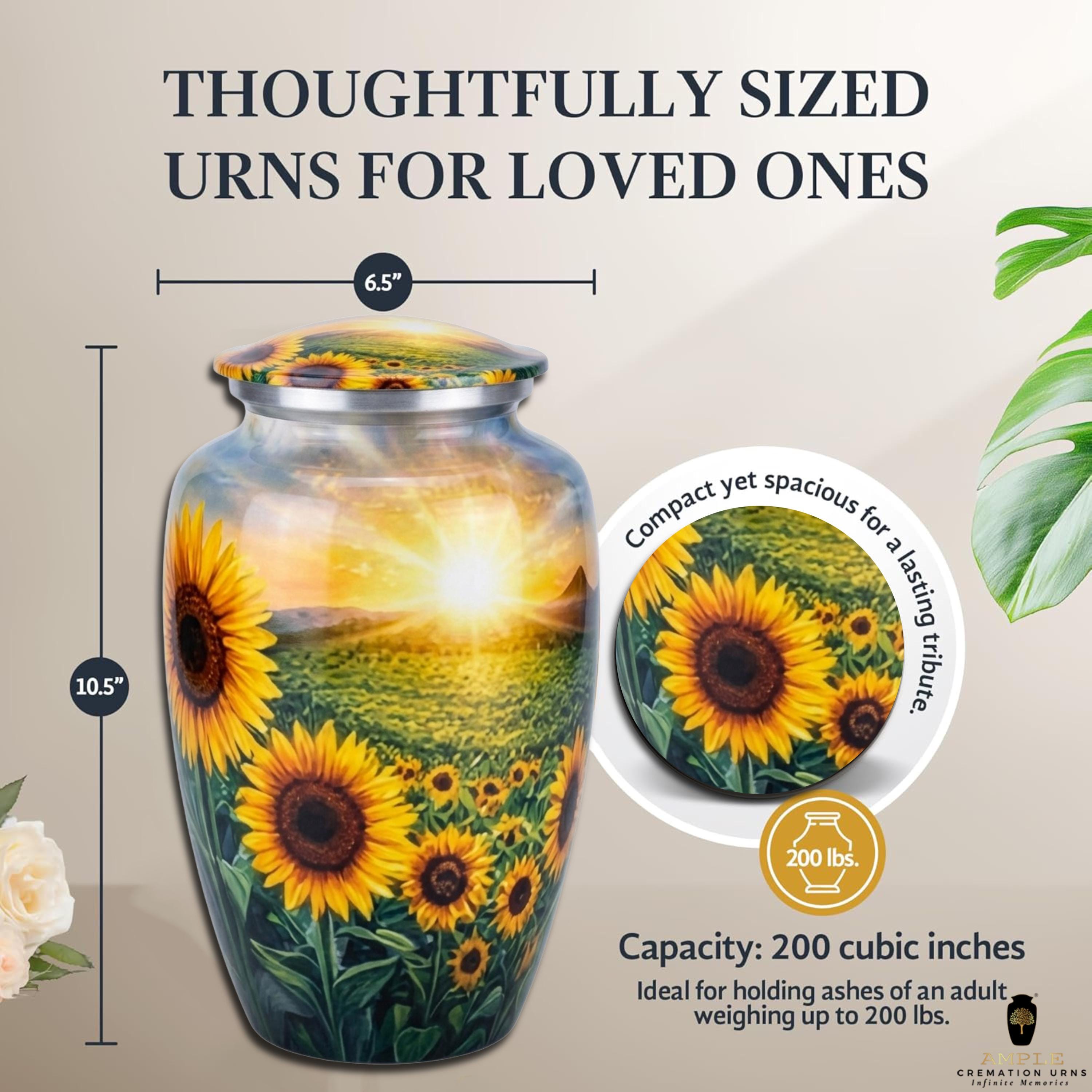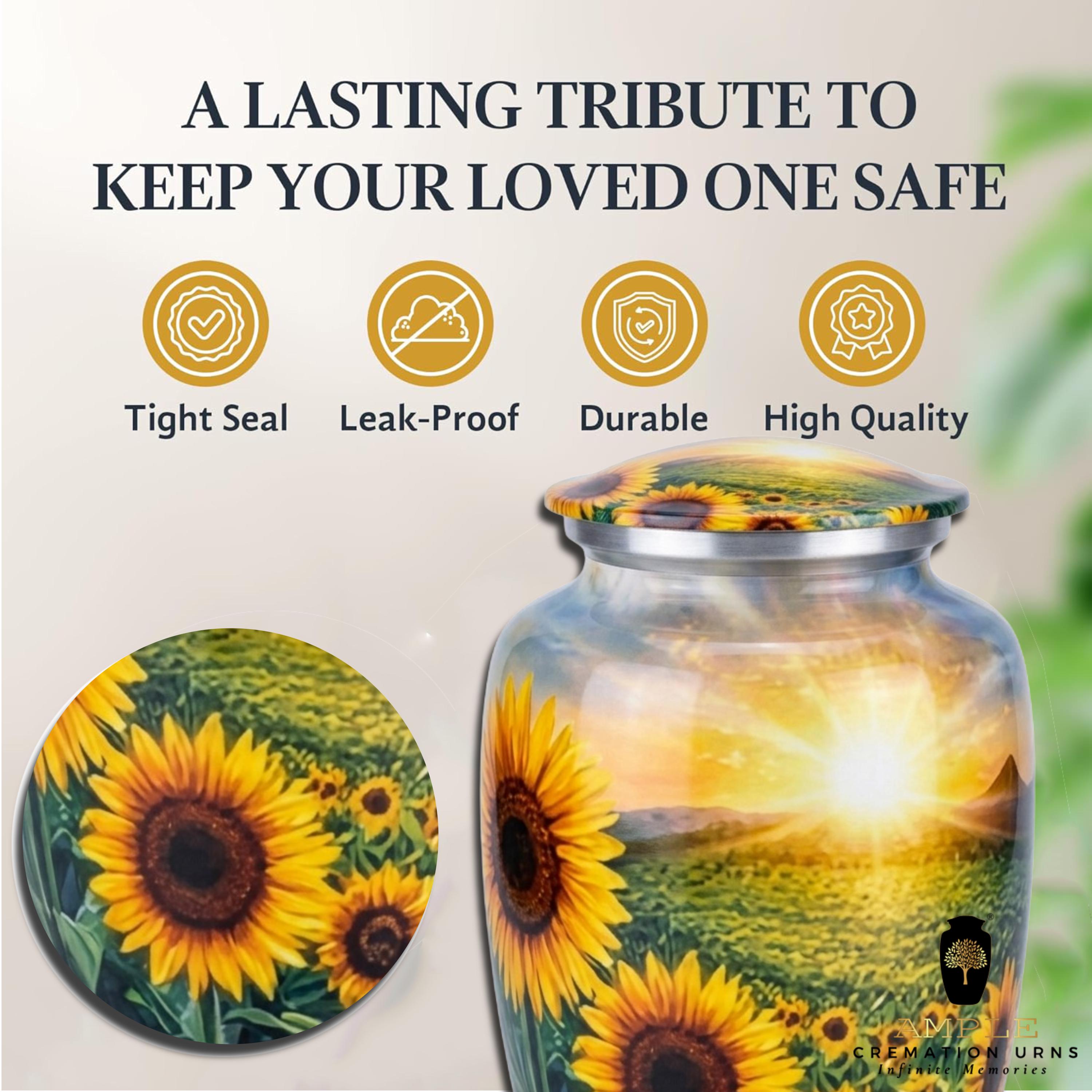 This breathtaking vessel features a panoramic scene of a flourishing sunflower field under the glow of a brilliant rising sun. The towering sunflowers, known for following the light, symbolize loyalty, adoration, and the enduring power of happiness. Set against a serene landscape of rolling hills and a sun-drenched horizon, this artistic tribute serves as a dignified final resting place for a soul who brought light and joy to every room they entered.