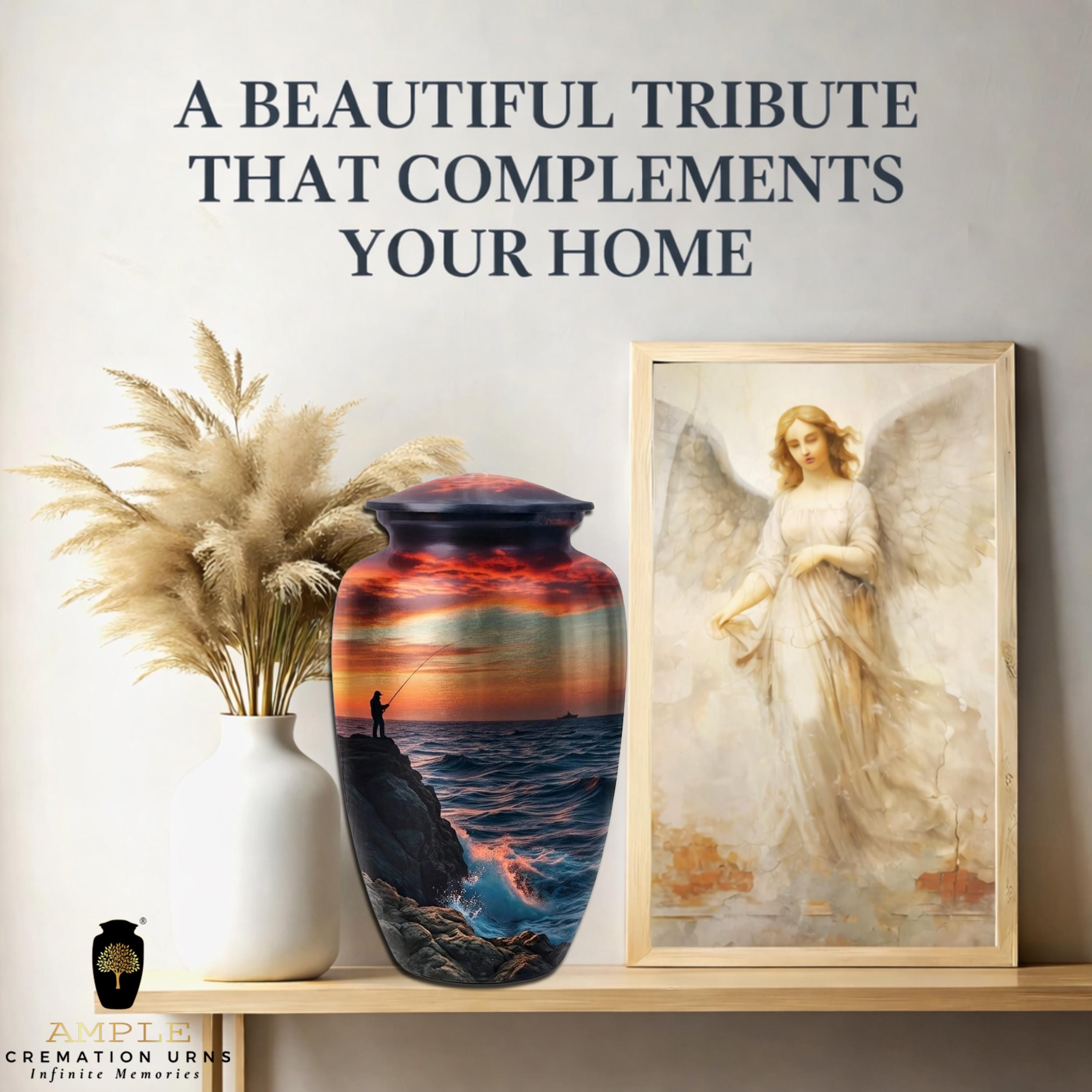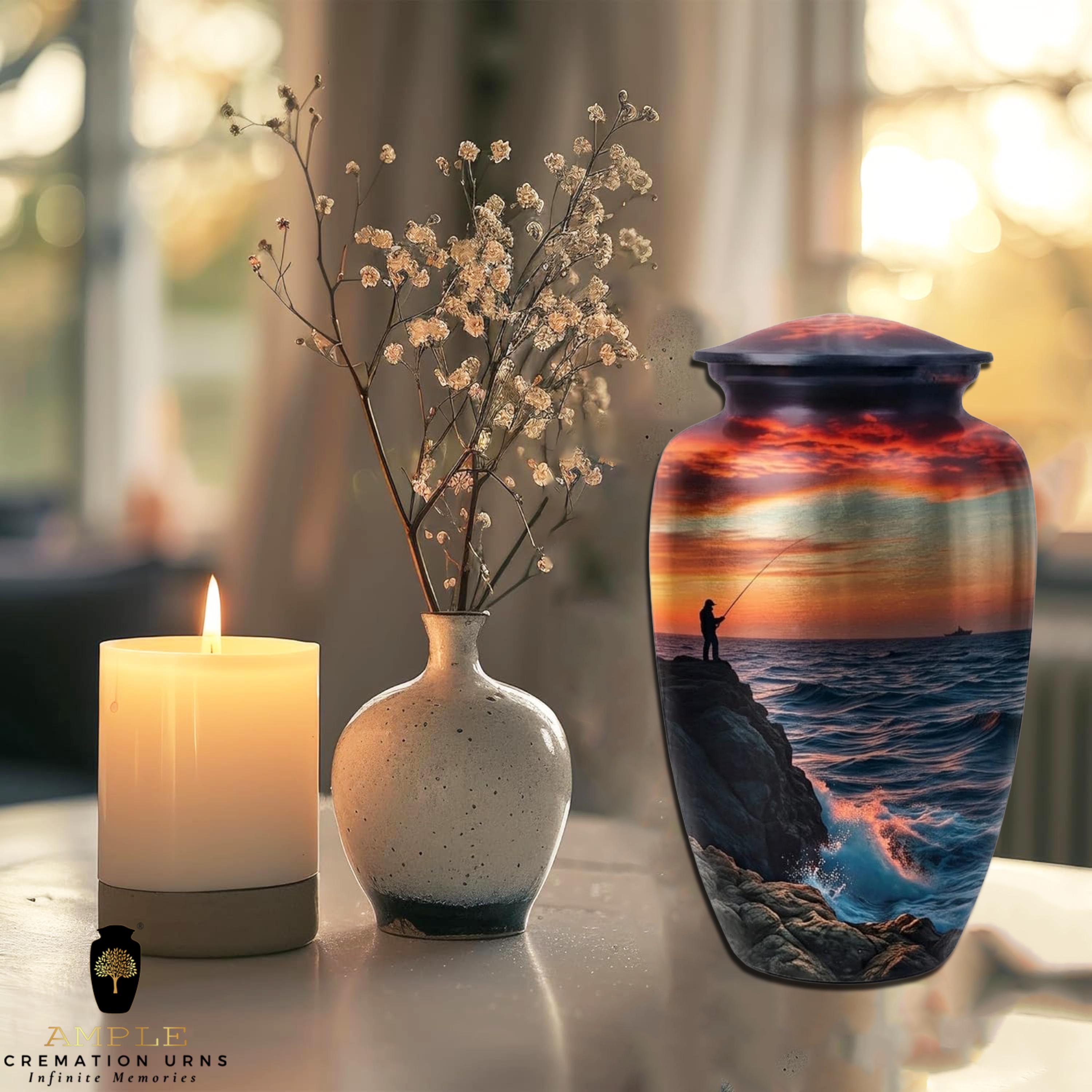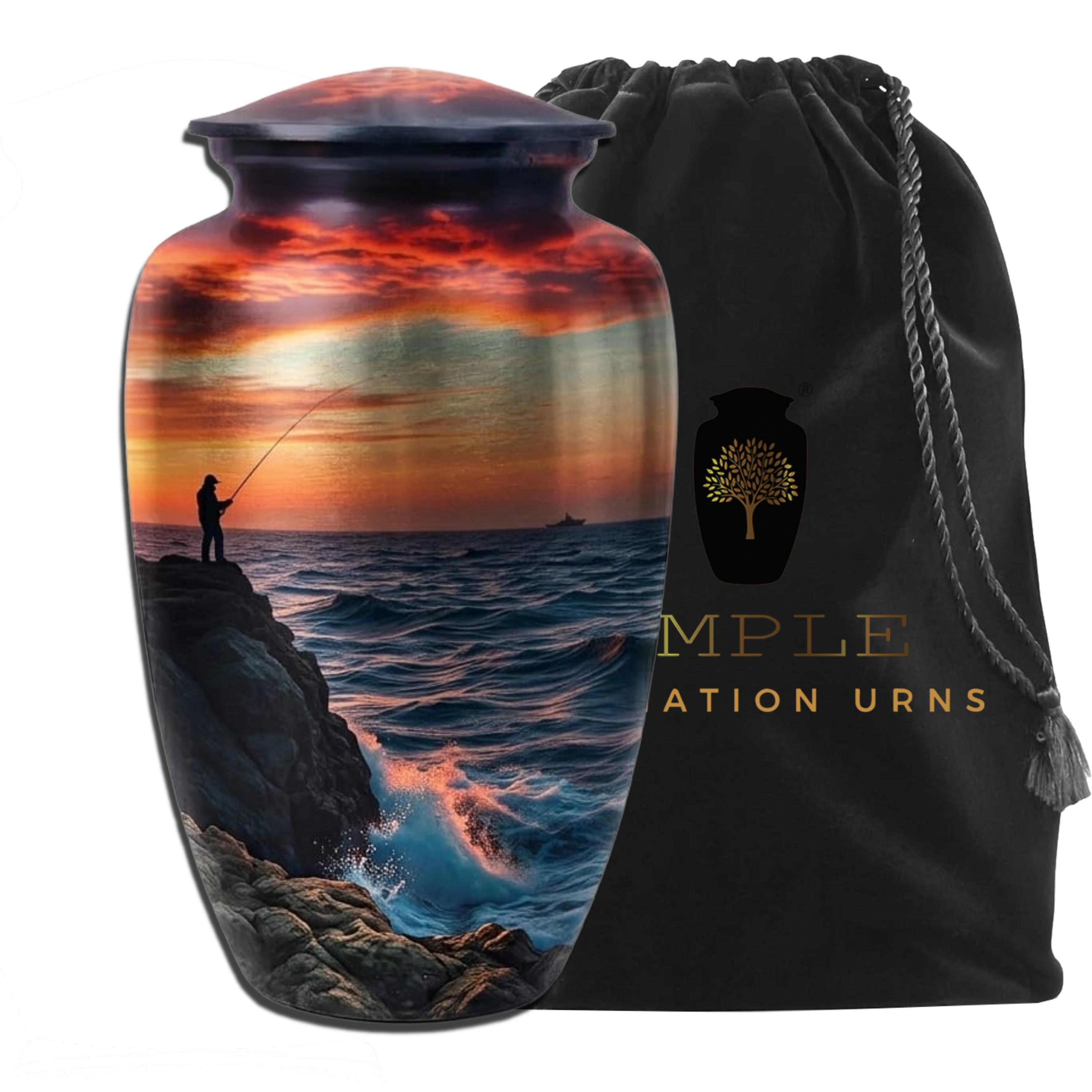 This evocative vessel features a detailed silhouette of a lone fisherman casting a line from a rugged, rocky shore. Set against a dramatic, fiery sunset that reflects off the deep indigo waves, the scene captures a moment of profound tranquility and connection with nature. Rendered on a premium brushed metal finish with a rich, high-definition color palette, this urn serves as a dignified final resting place for an avid angler, a lover of the sea, or anyone who found their greatest peace by the water’s edge.